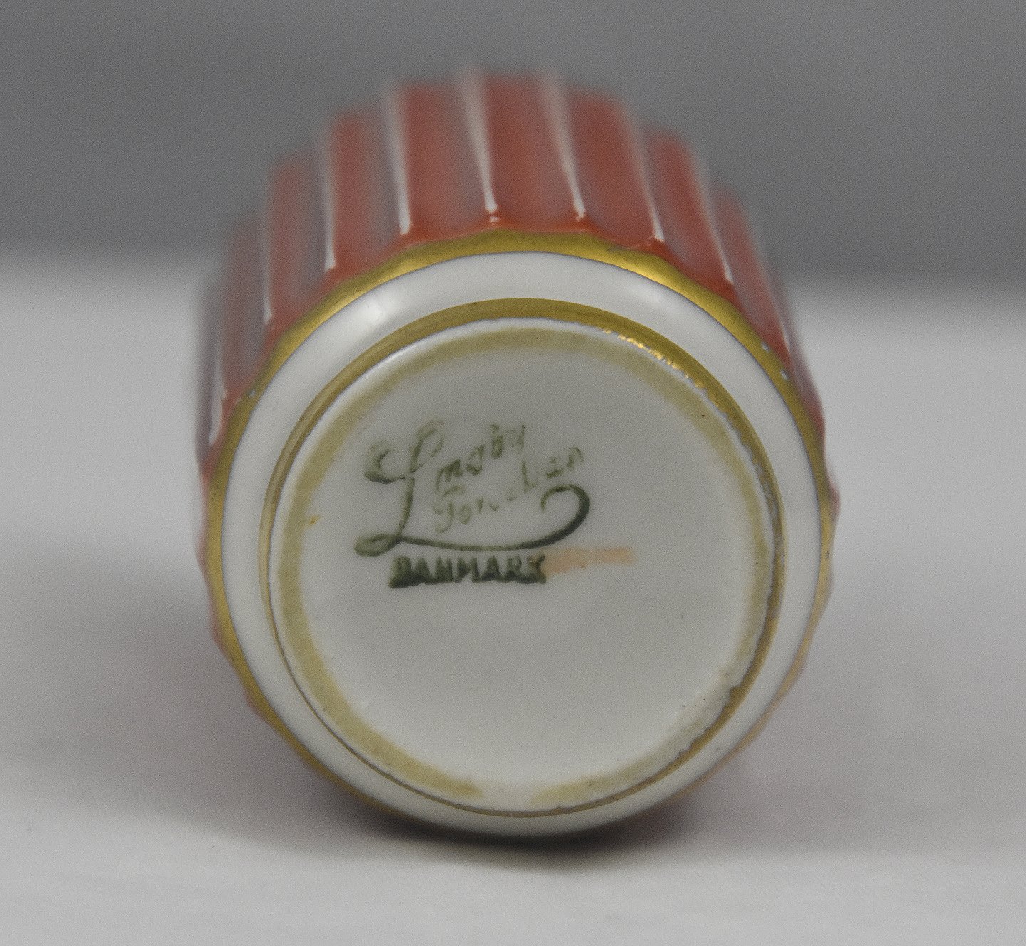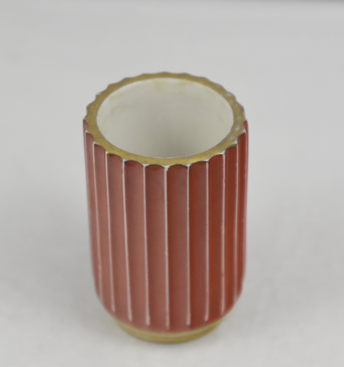 Rød Lyngby vase i porcelæn med riflet korpus og guldkant