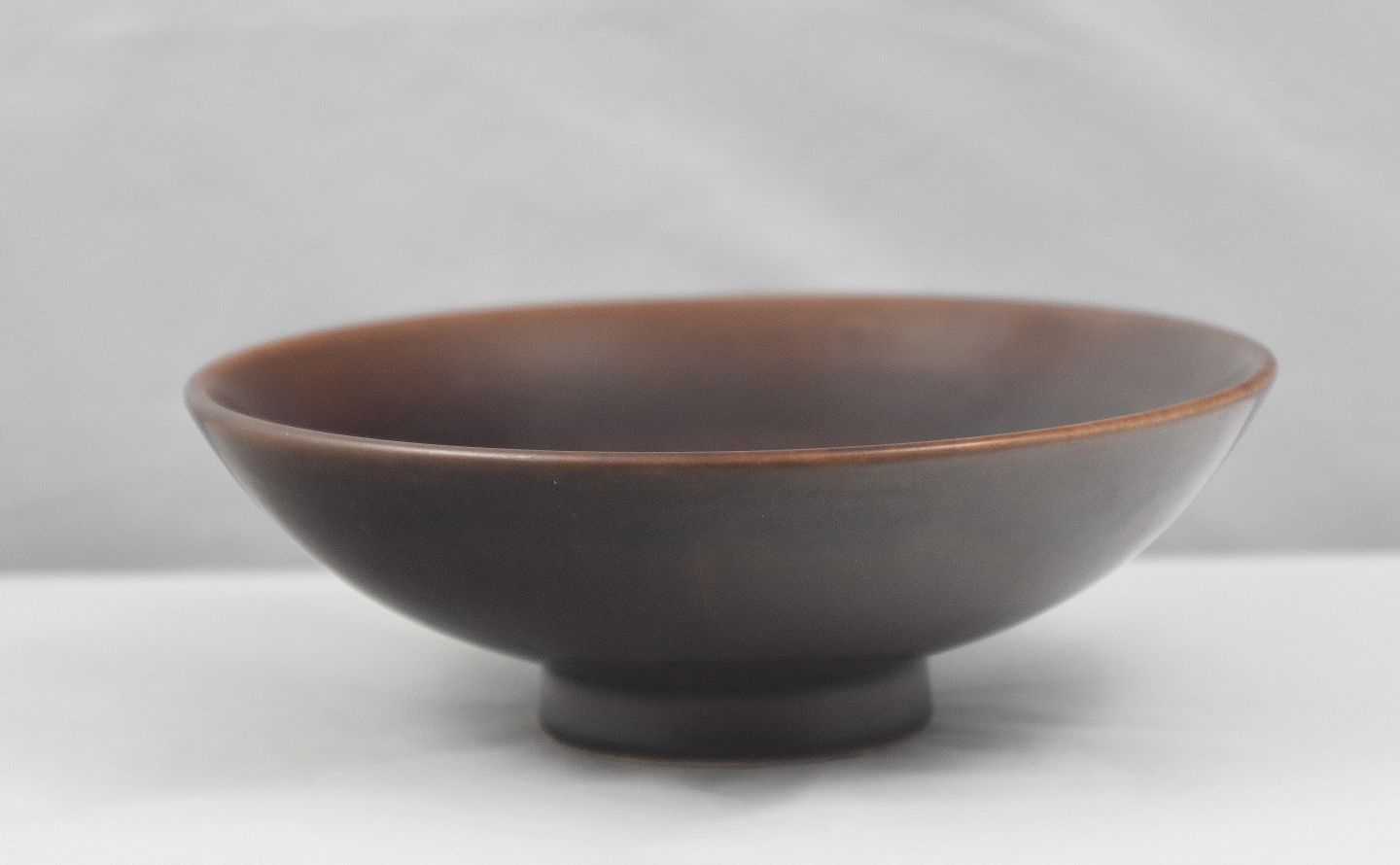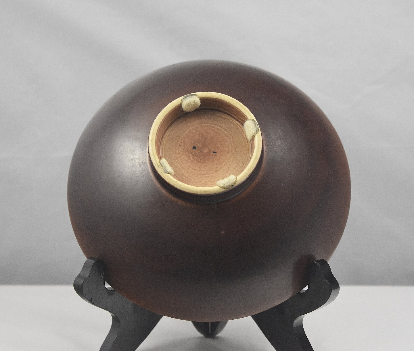 Brunlig glaseret skål på fod, harepelsglas lignende glassur