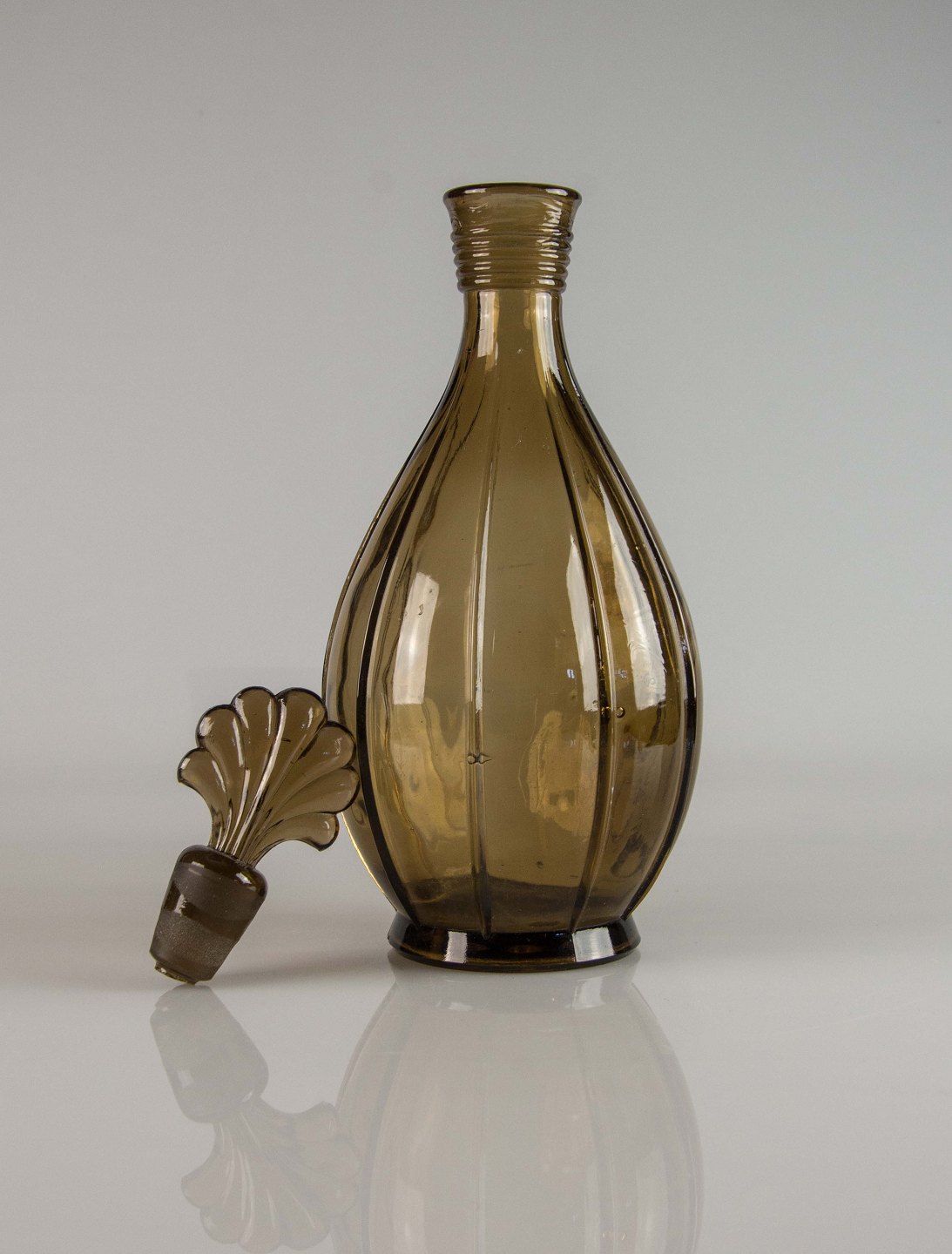 Karaffel i presset brunt glas med glasprop i dansk design