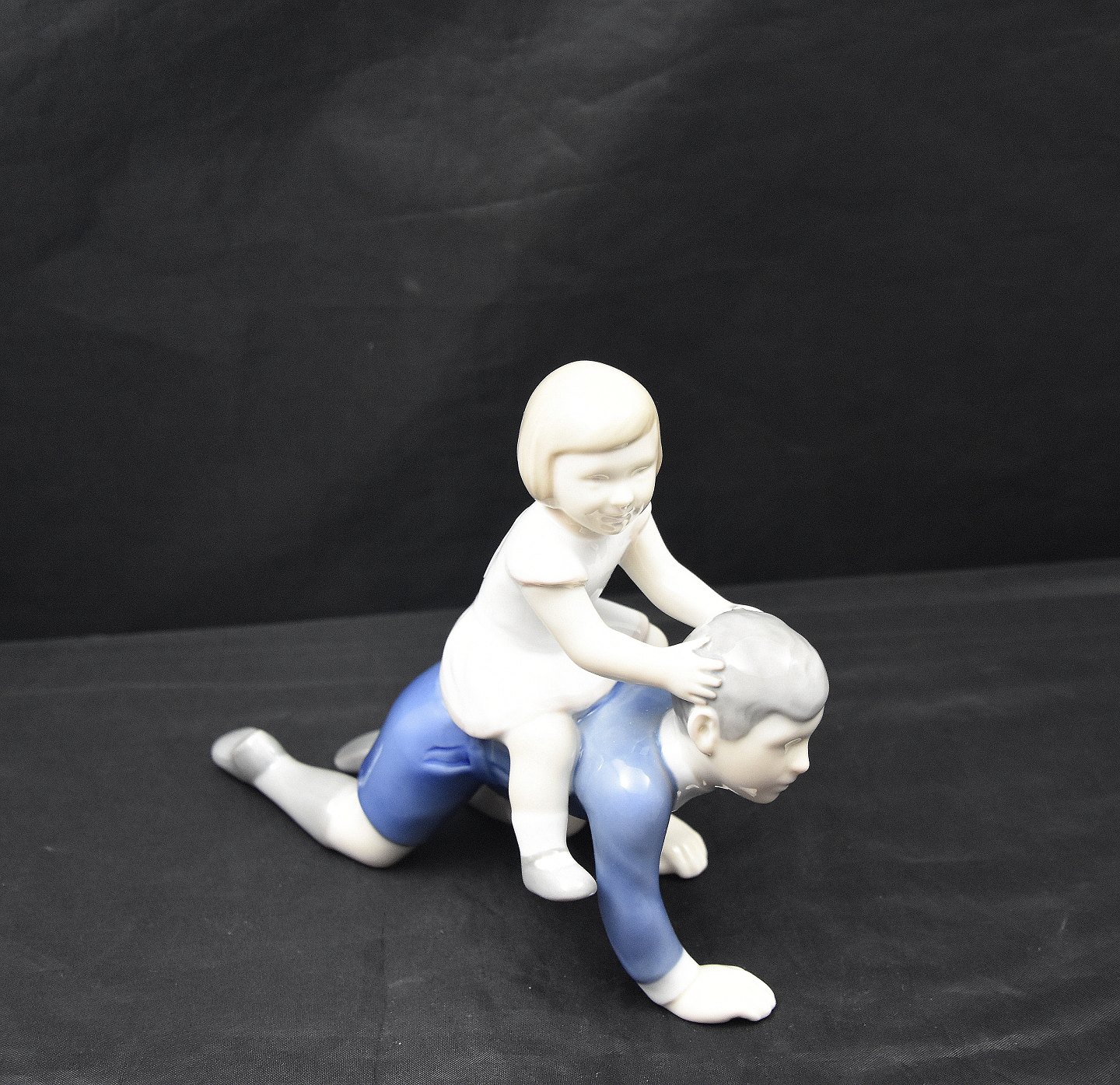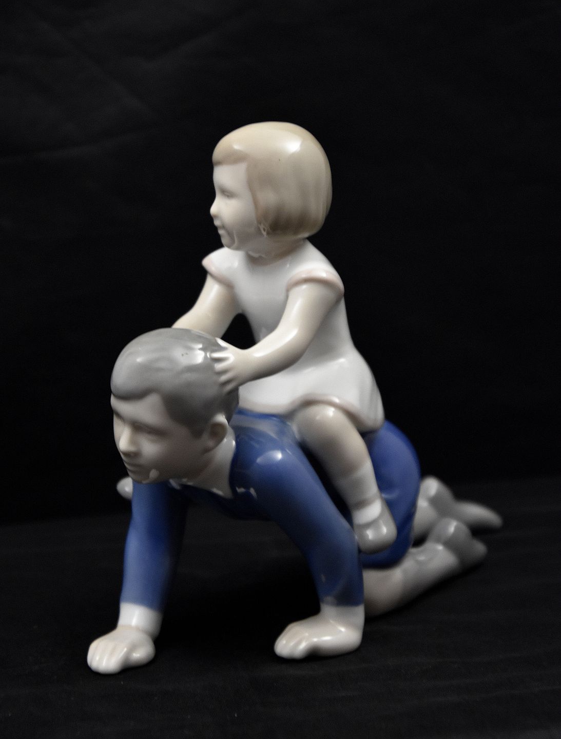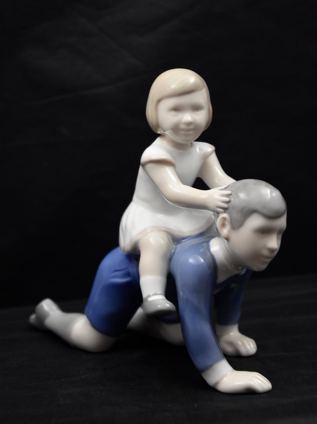 B&G figur Min hest/søster og bror nr 2303. Figuren er 1. sortering. pige i hvid skjorte ridende på dreng i blå skjorte.