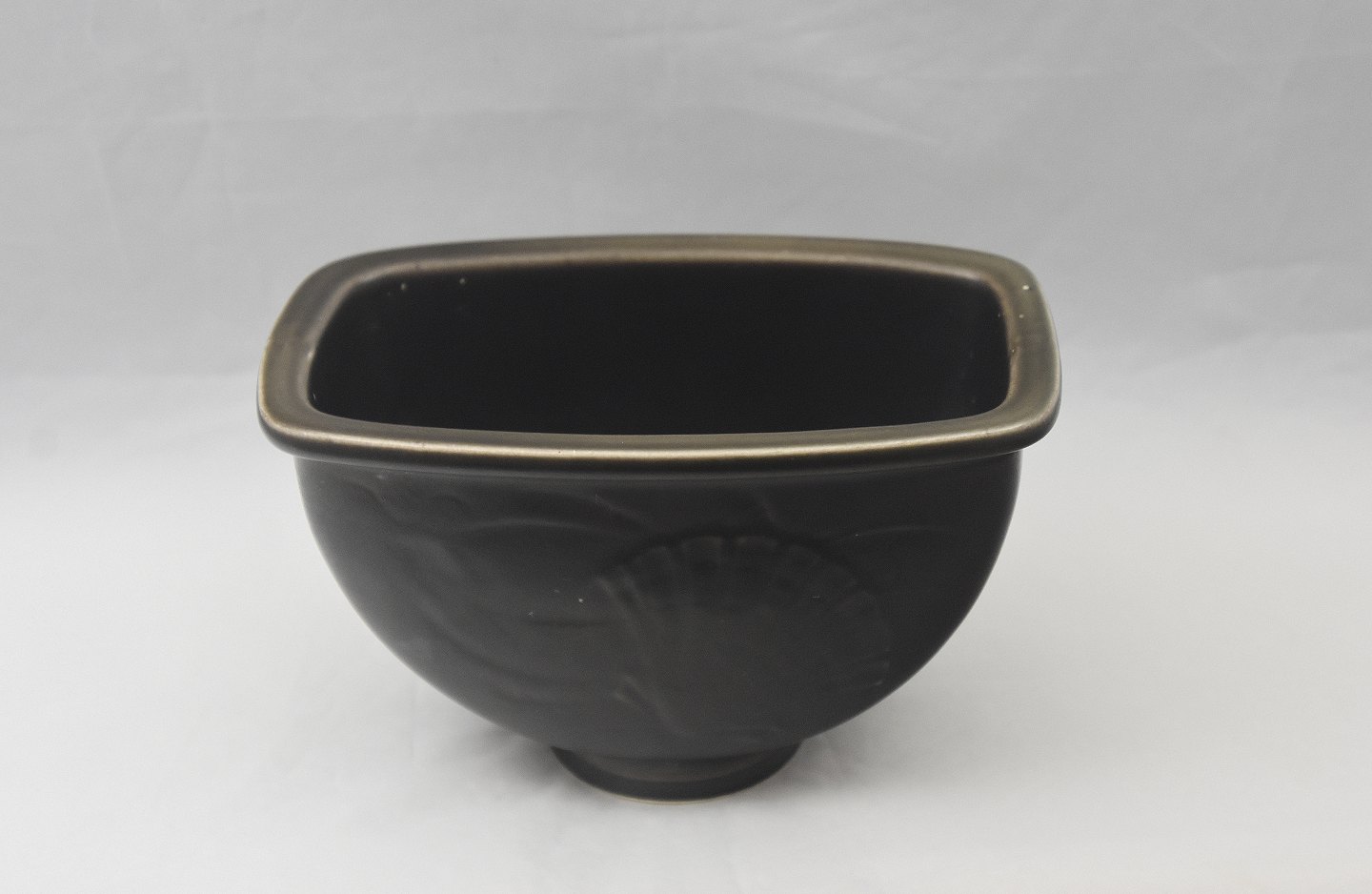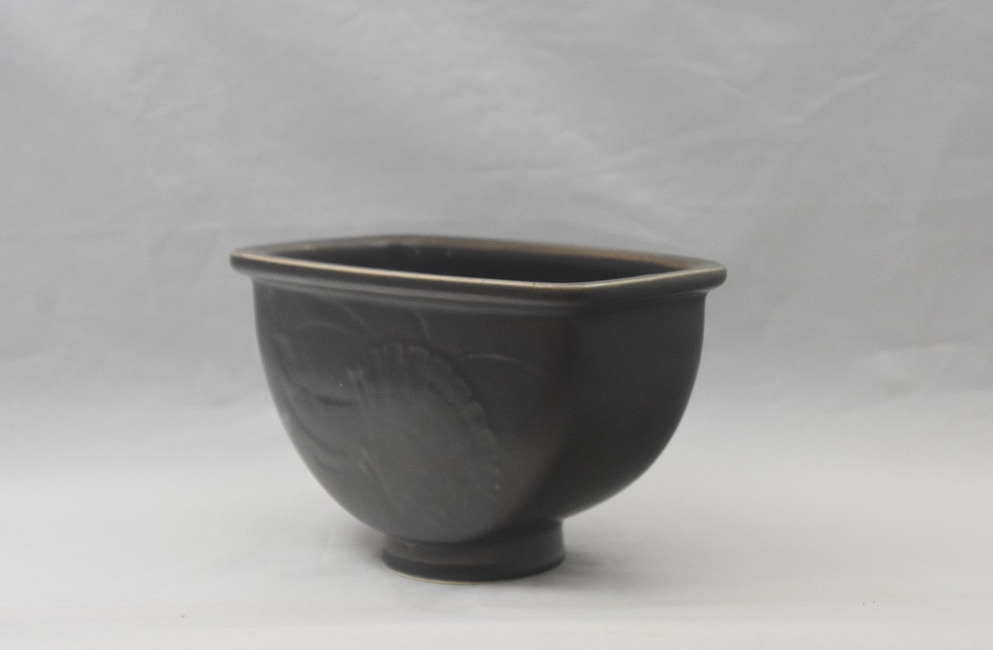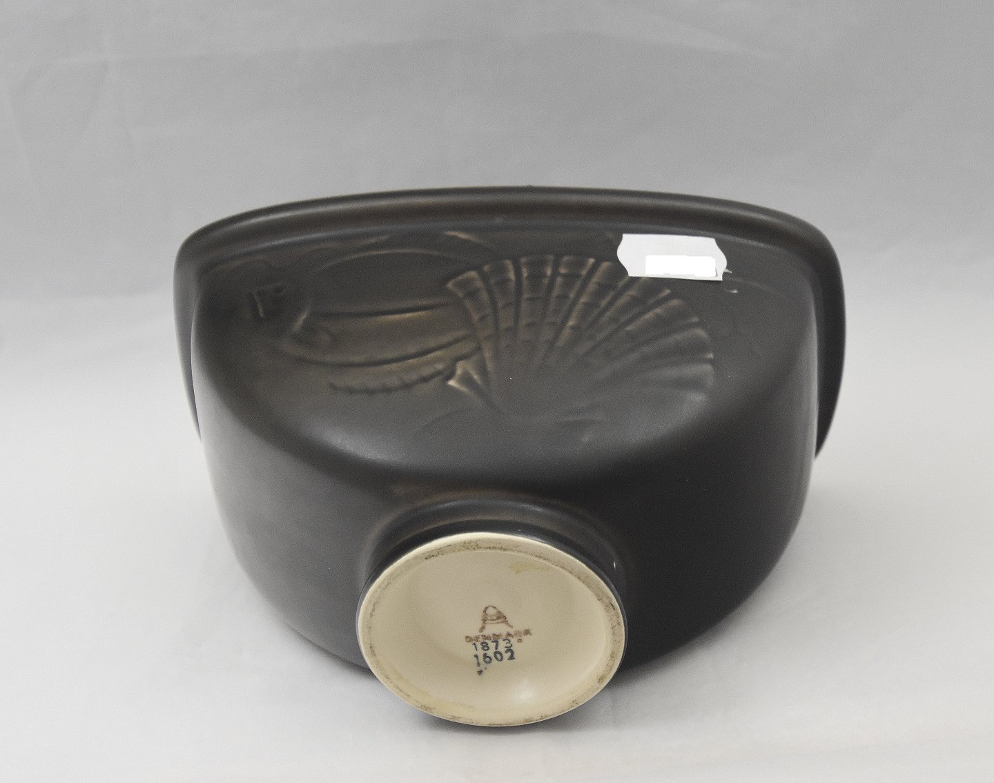 Royal Copenhagen Aluminia Skål "Vuggen" fra serien Solbjerg. "Vuggen" er gråbrun og dekoreret med fisk og muslinger, "Vuggen" er af kunstfajance