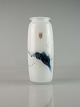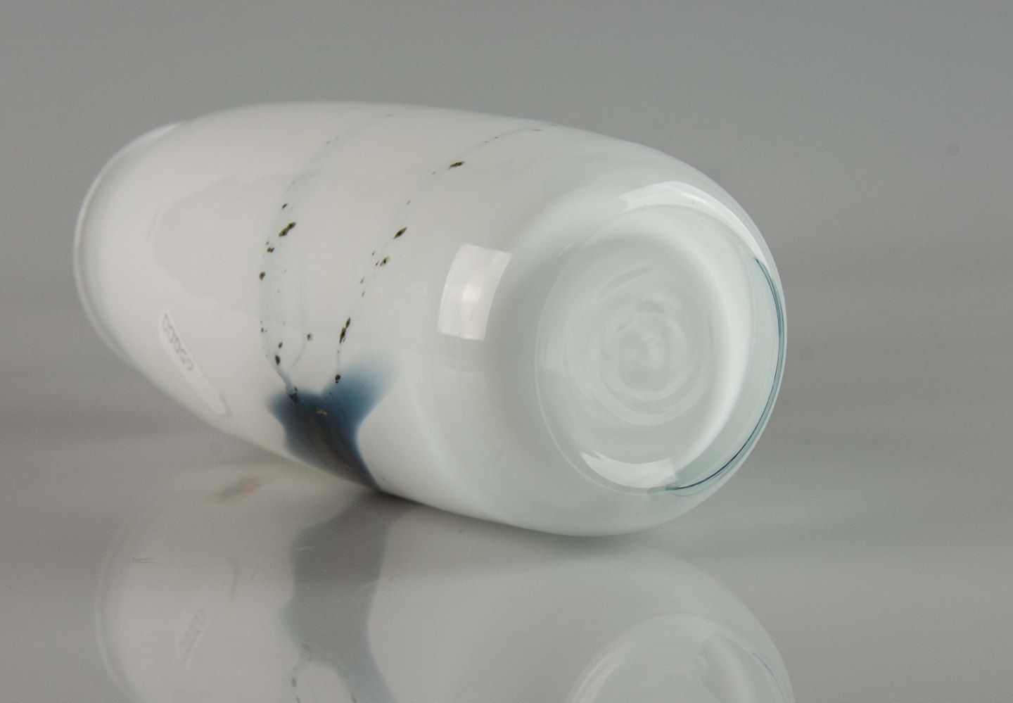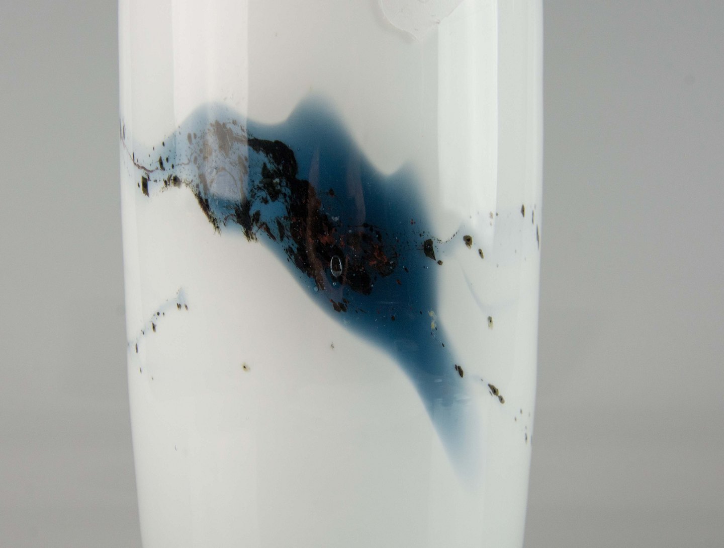 Vase i opal hvid glas med mønster i blå og mørke nuancer
