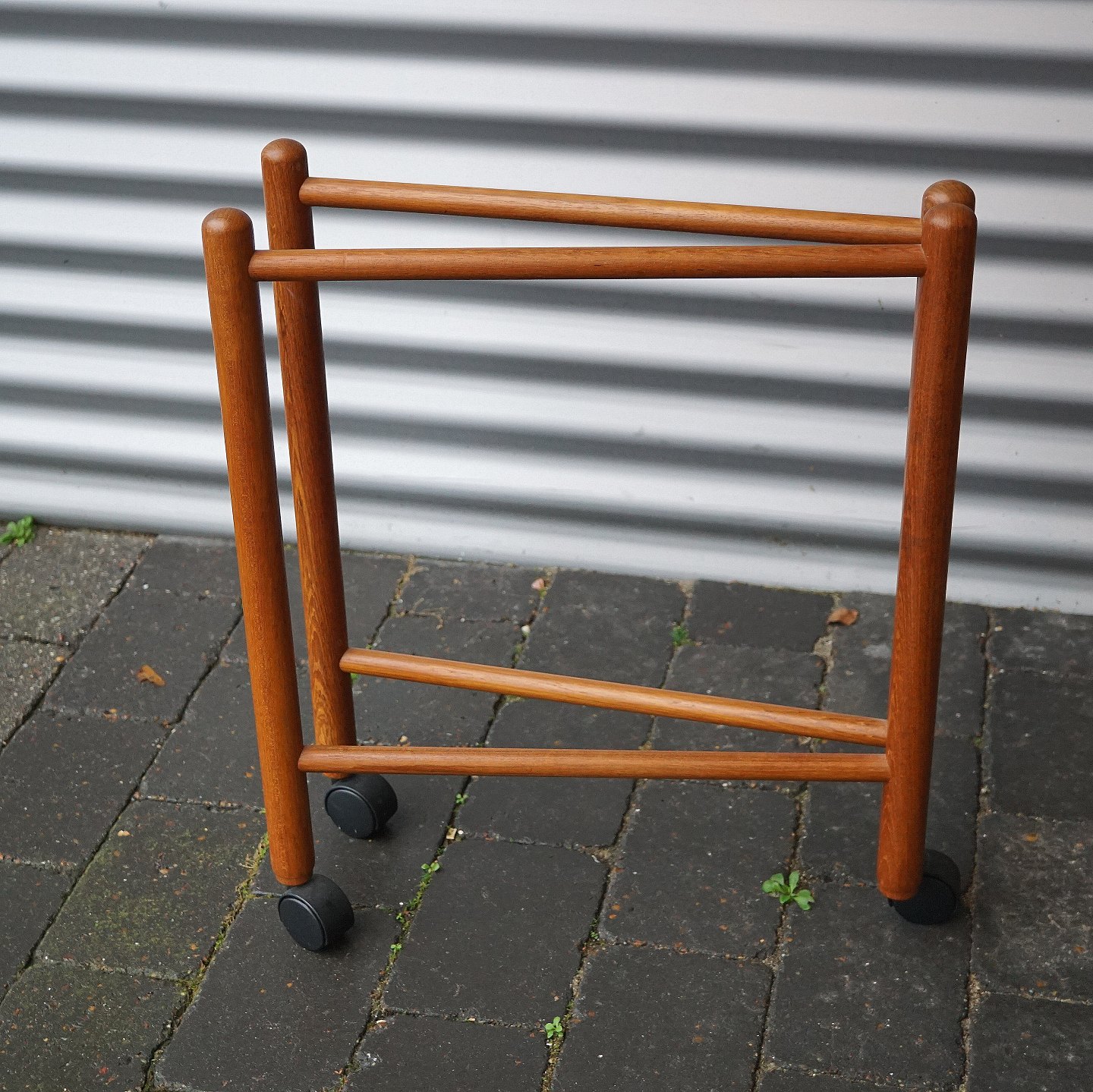 Rundt serveringsbord, massiv teaktræ. Den ene af pladerne kan sættes oven på den anden, så den øverste kan dreje rundt (se billede 3). Pladerne kan tages af og stellet kan slås sammen.