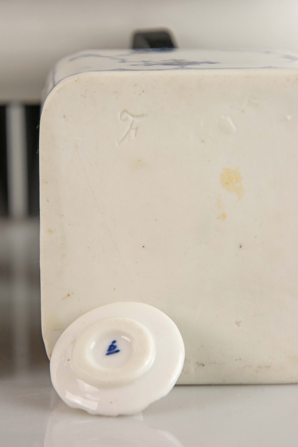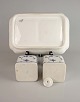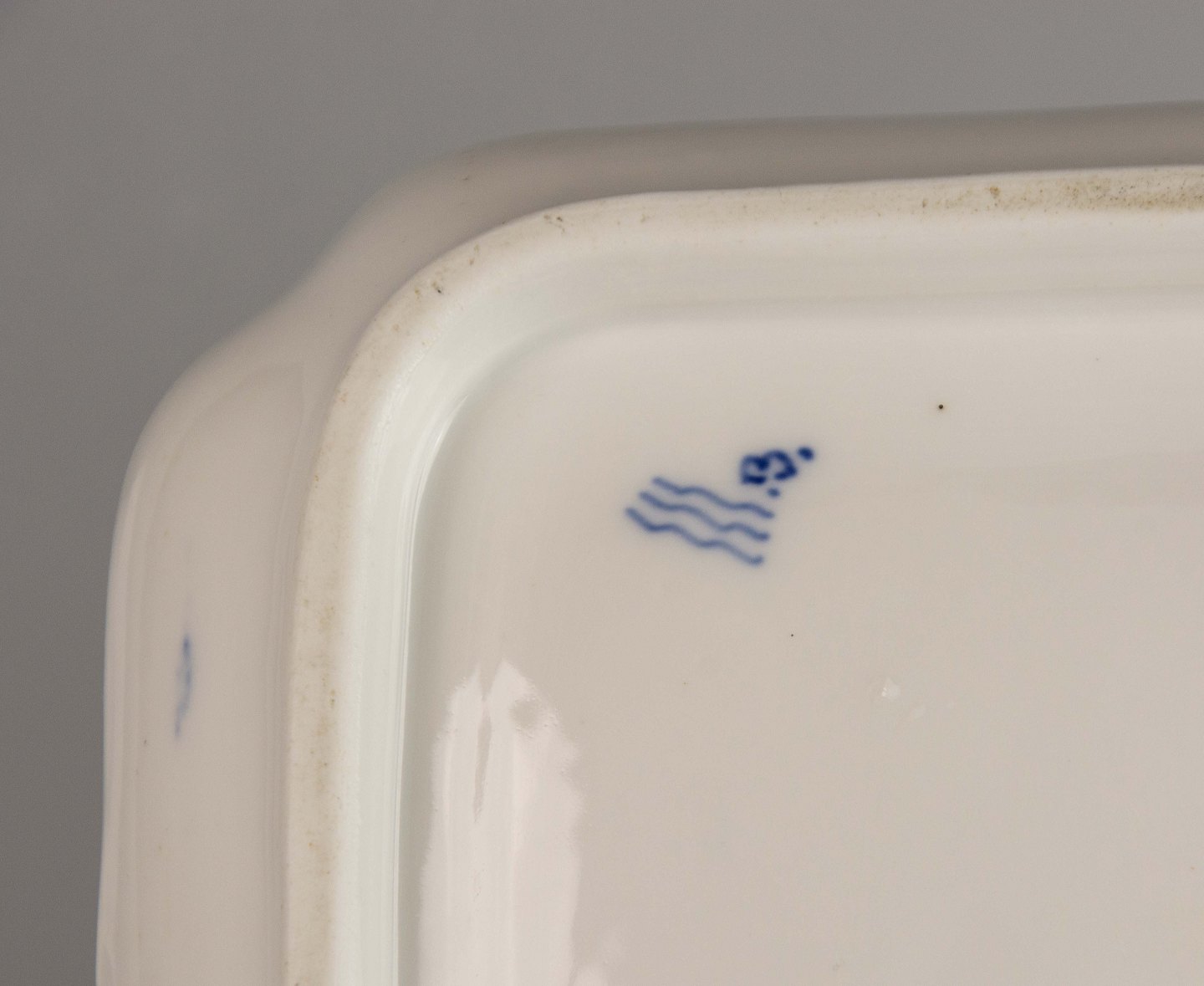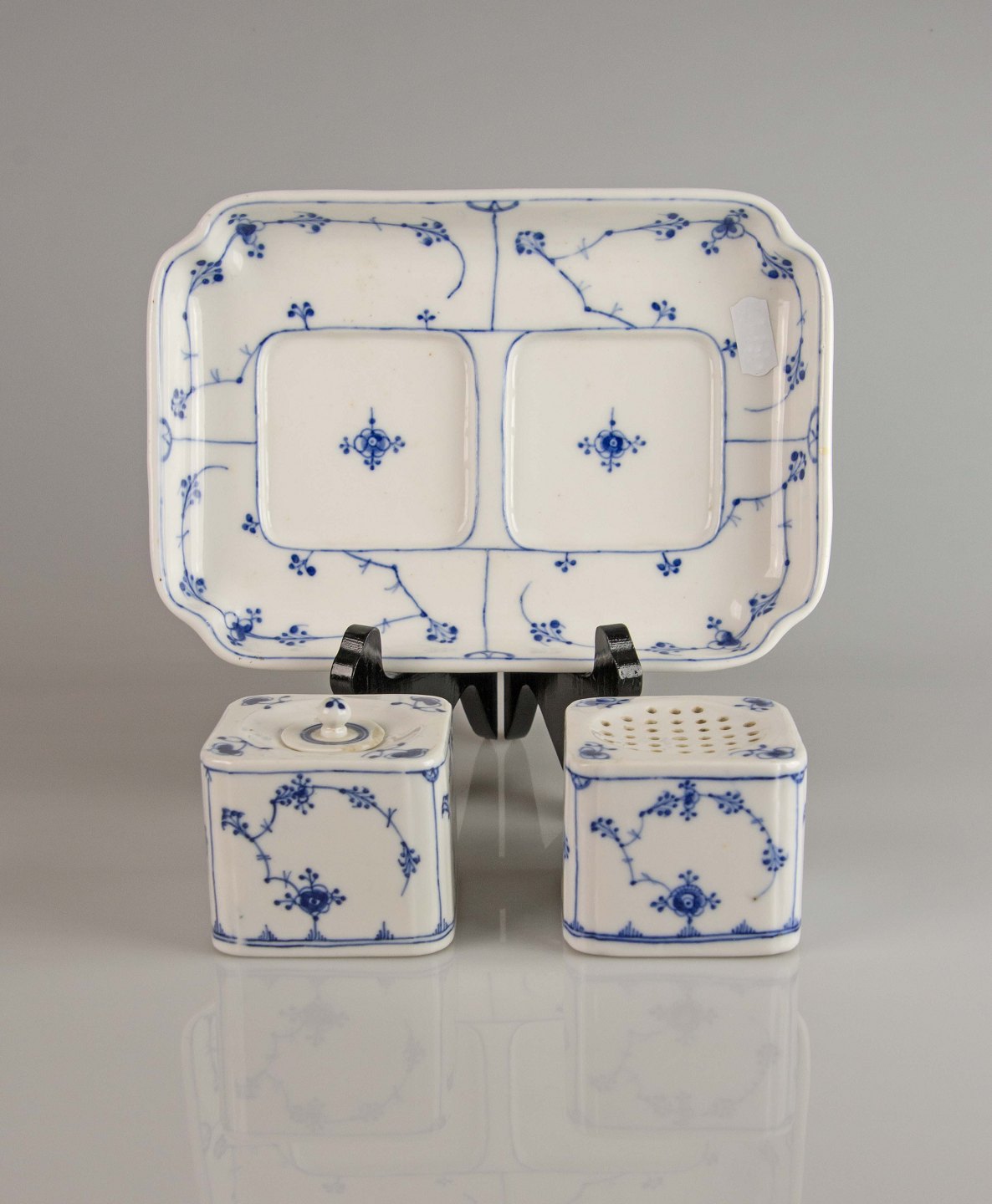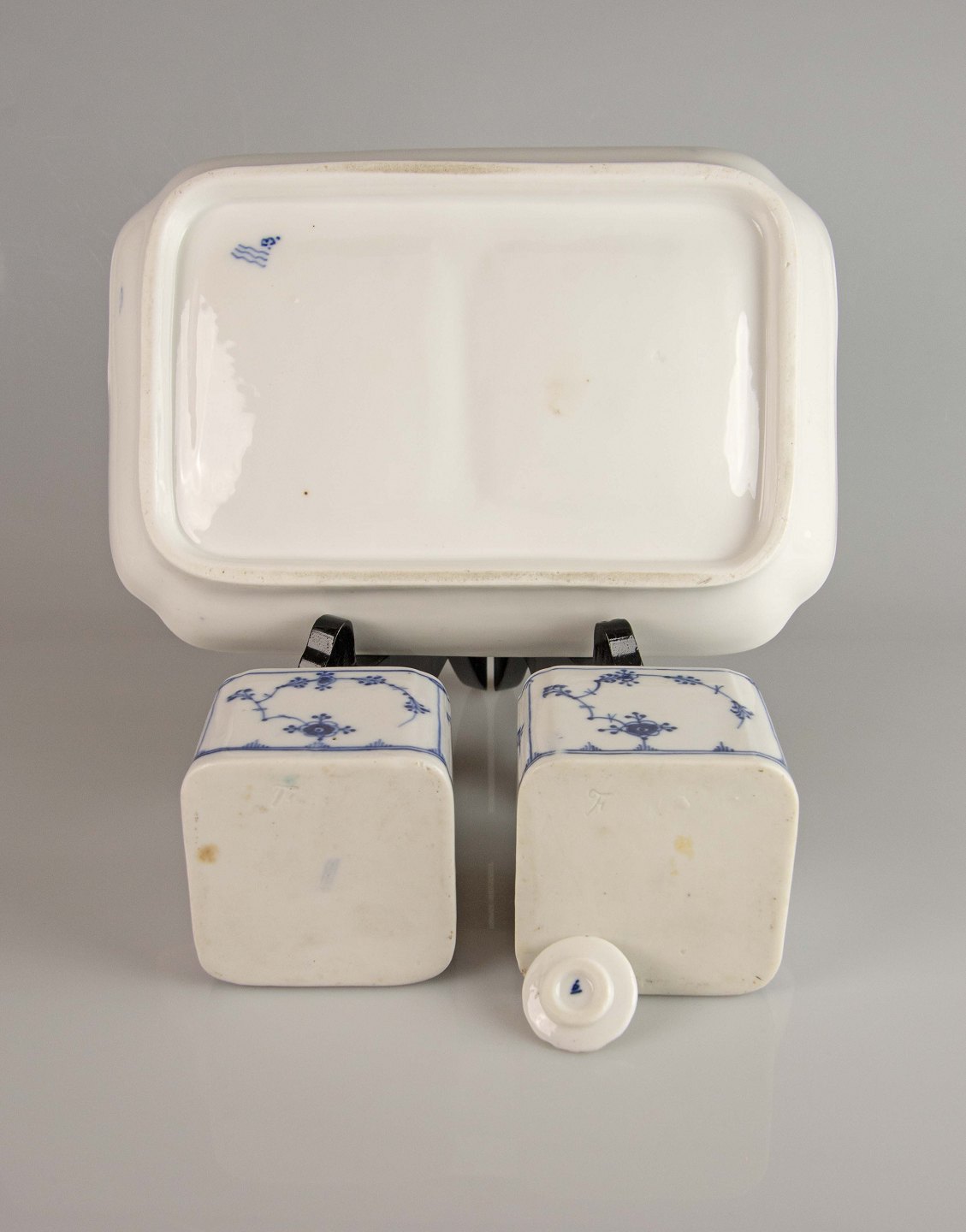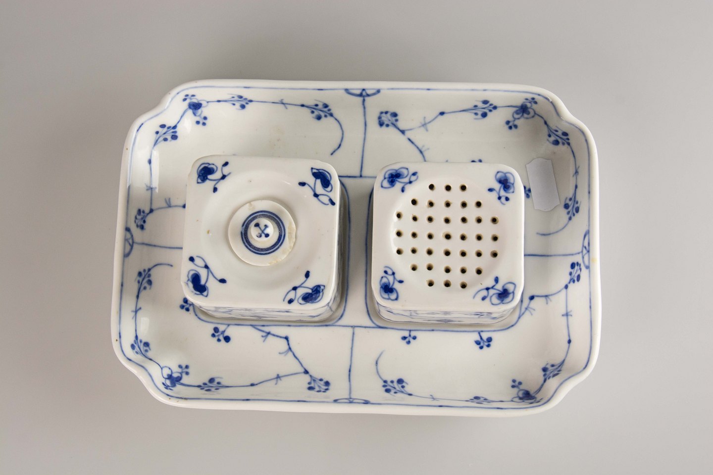 Signeret med tre blå bølger og består af et fad med blækhus med låg og strøhus.