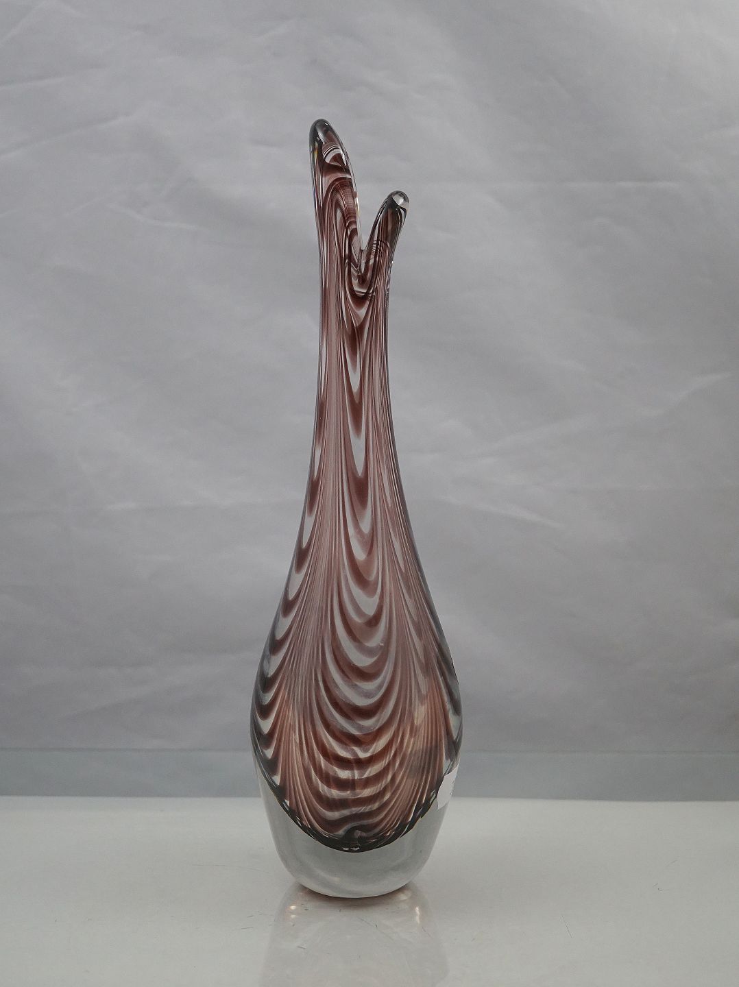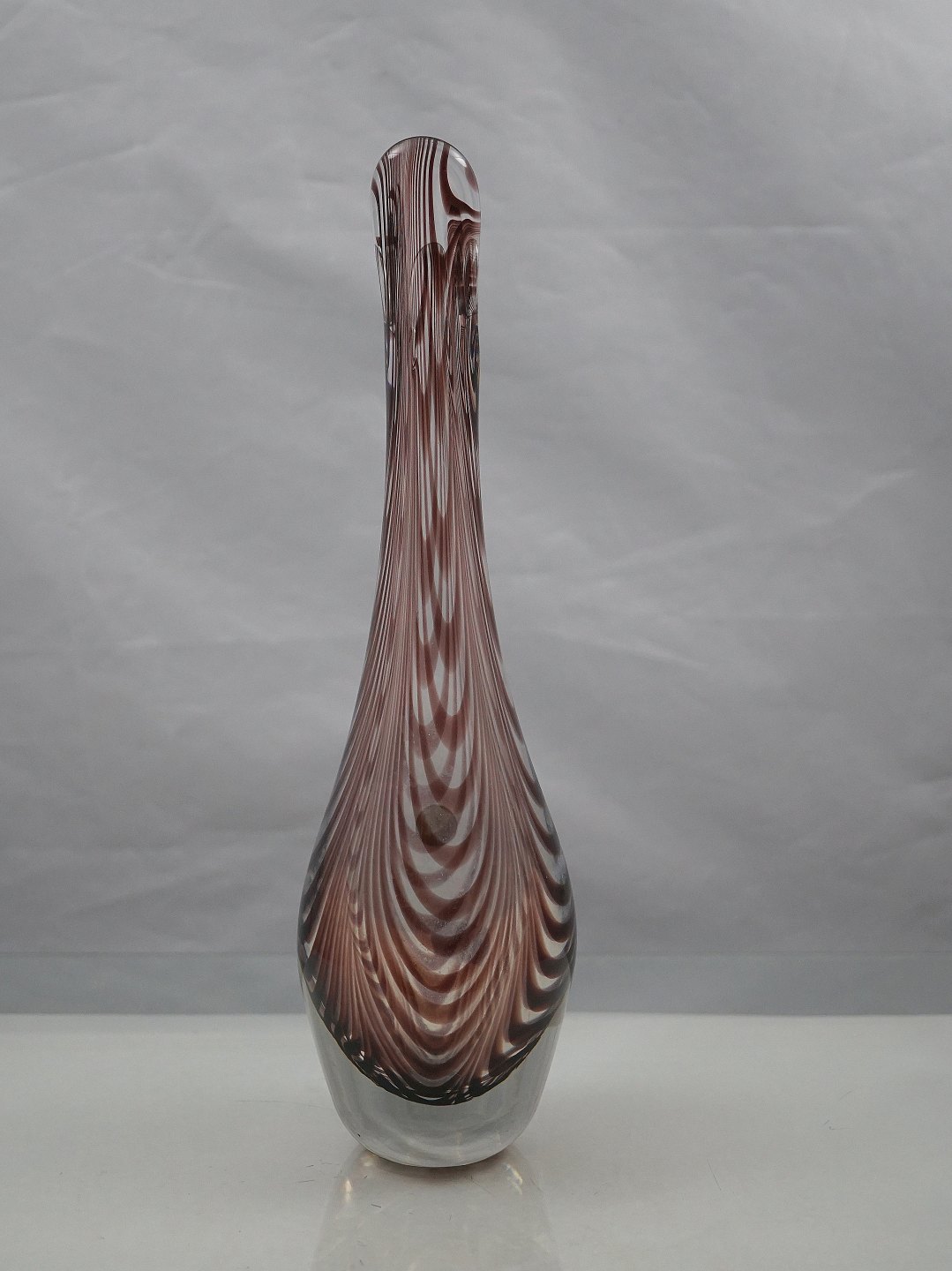 Kastrup Glasværk. Næbvase, dråbeformet krop opdrevet i farvet post, vasen er oftest med kugleslebet bund