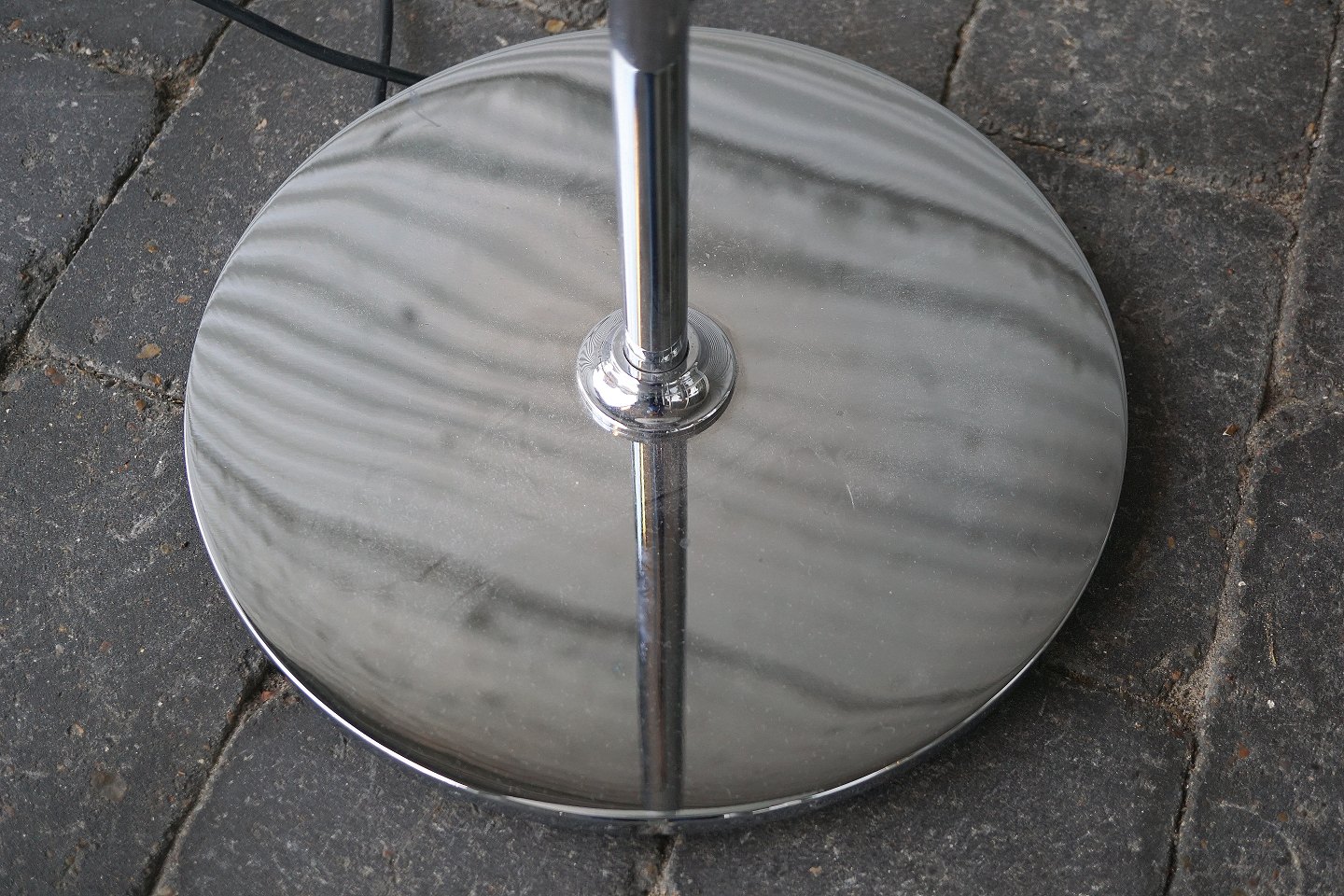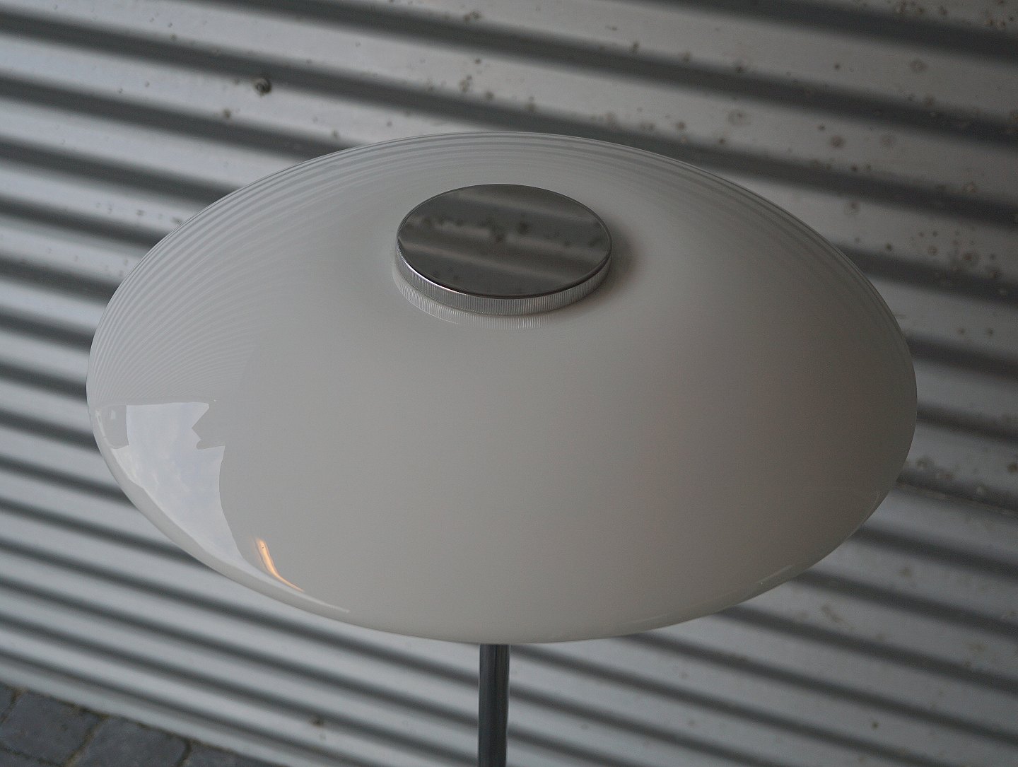 Lampen har blankpoleret stålstel og blankpoleret stålfod. De 3 skærme er mundblæste i opalglas, skærmene er blanke på ydersiden og sandblæste matte på indersiden