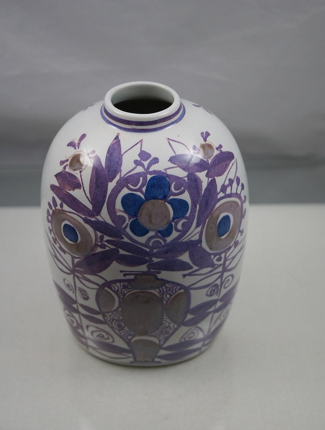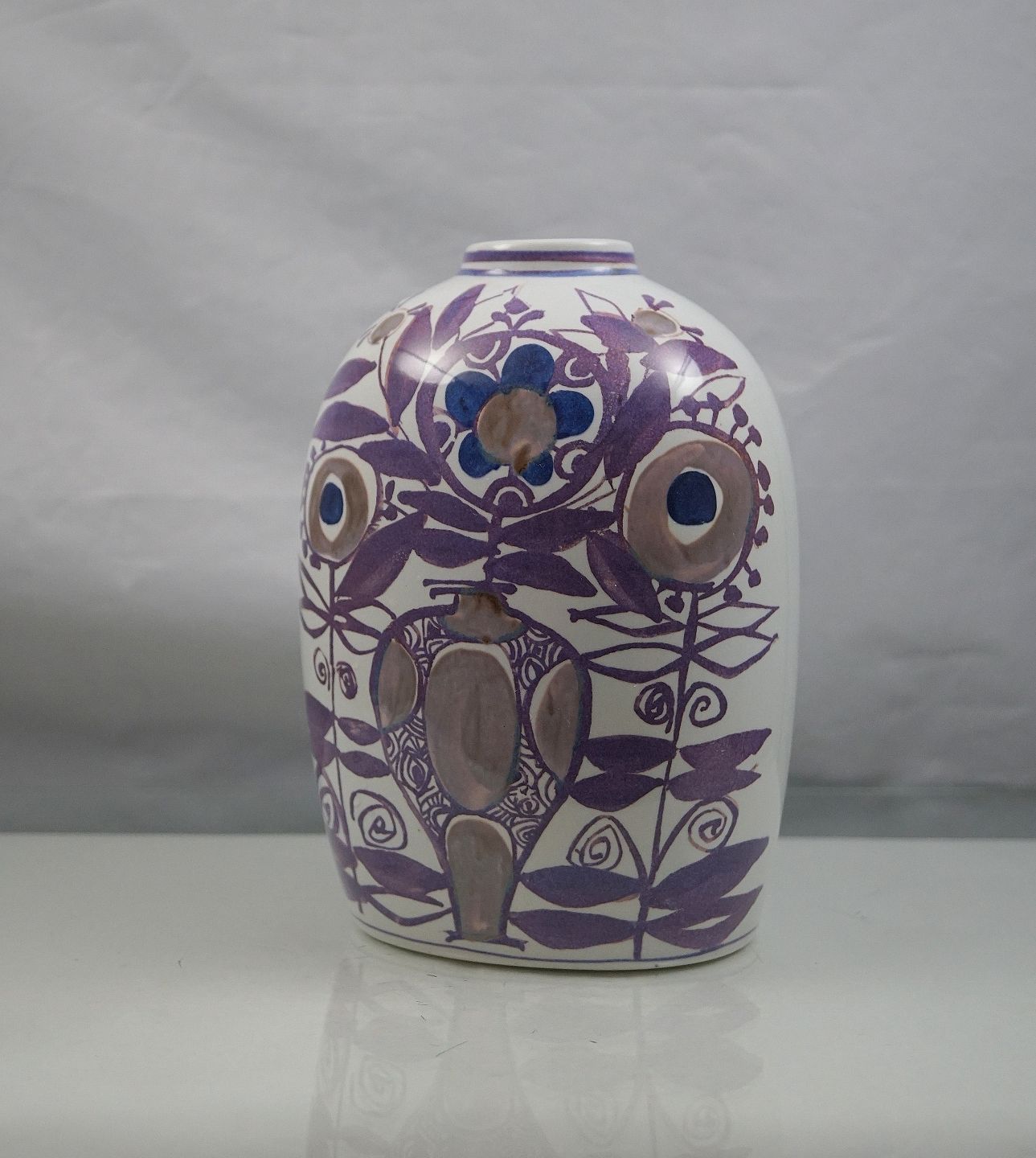 Royal Copenhagen, Tenera fajance vase No 181/2878, dekoreret med lilla blomstermotiv