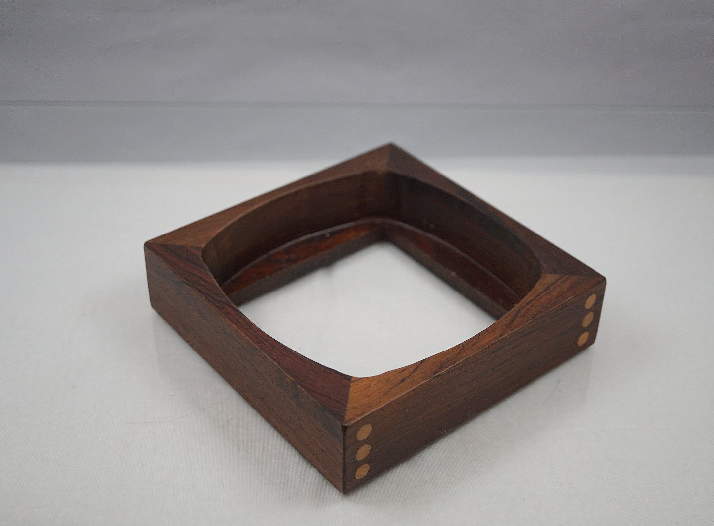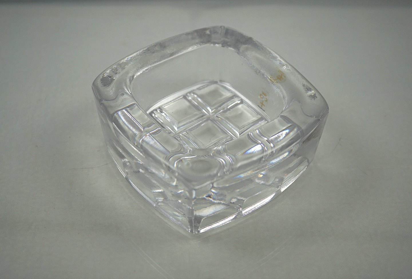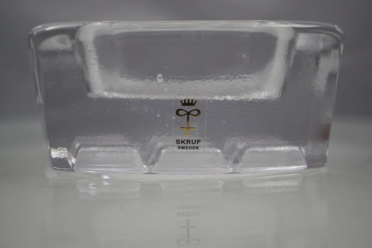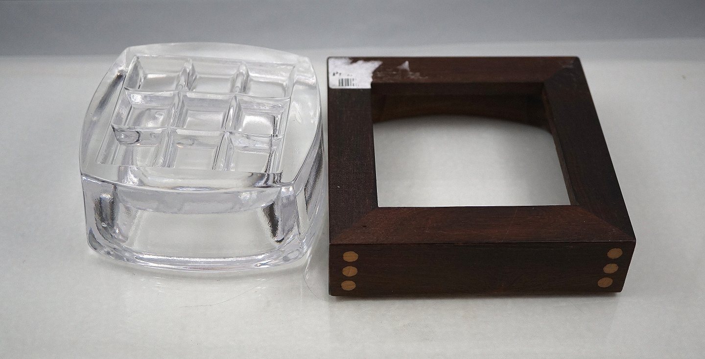 Skruf, Sweden. Tyk glas, med kvadrater i bunden, der står på en ramme af palisandertræ