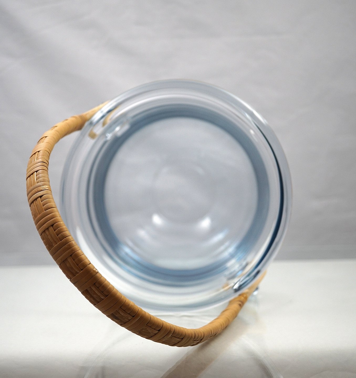 Holmegaard Glasværk, Champagnekøler, i lyst blålig glas og original bast hank. Champagnekøleren er mundblæst med påsatte hanke og udadbuet kant