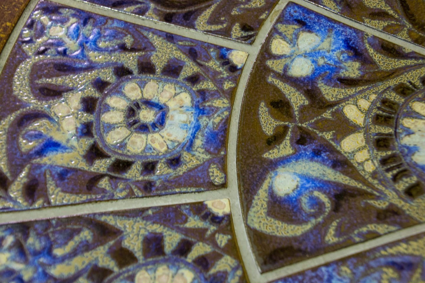 Kaklerne er er i brune og blå nuancer med motiv af blomster. Formodentlig kongelige kakler.