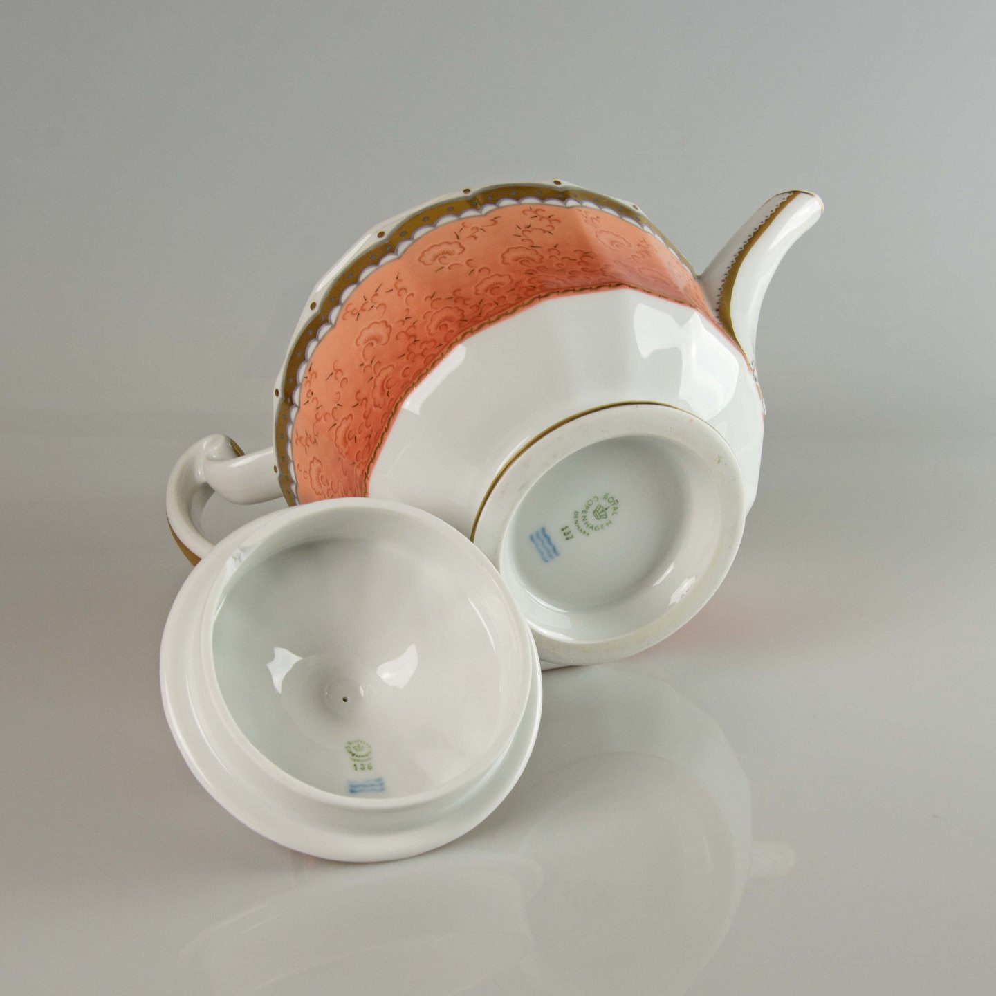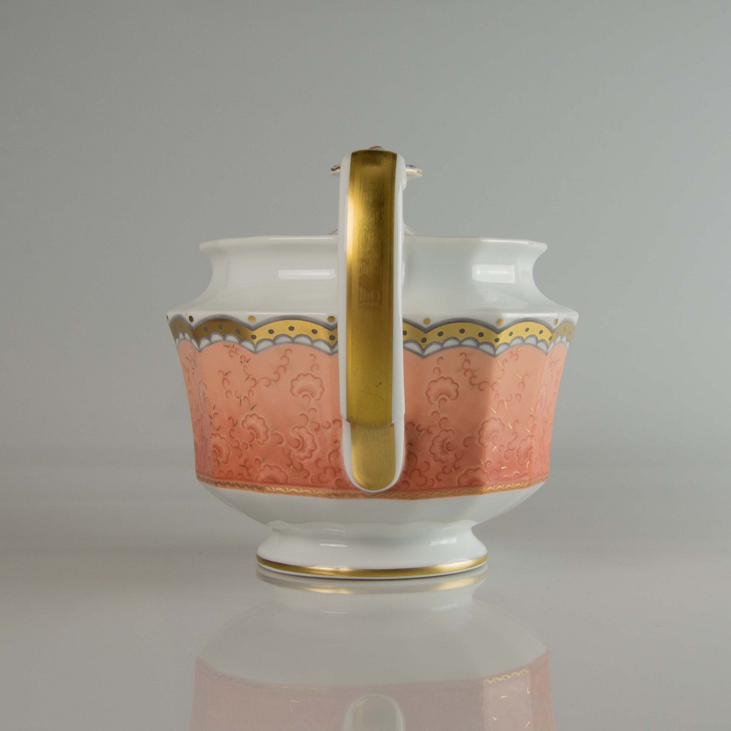 Kantet tepotte i porcelæn med gyldne mønstre.