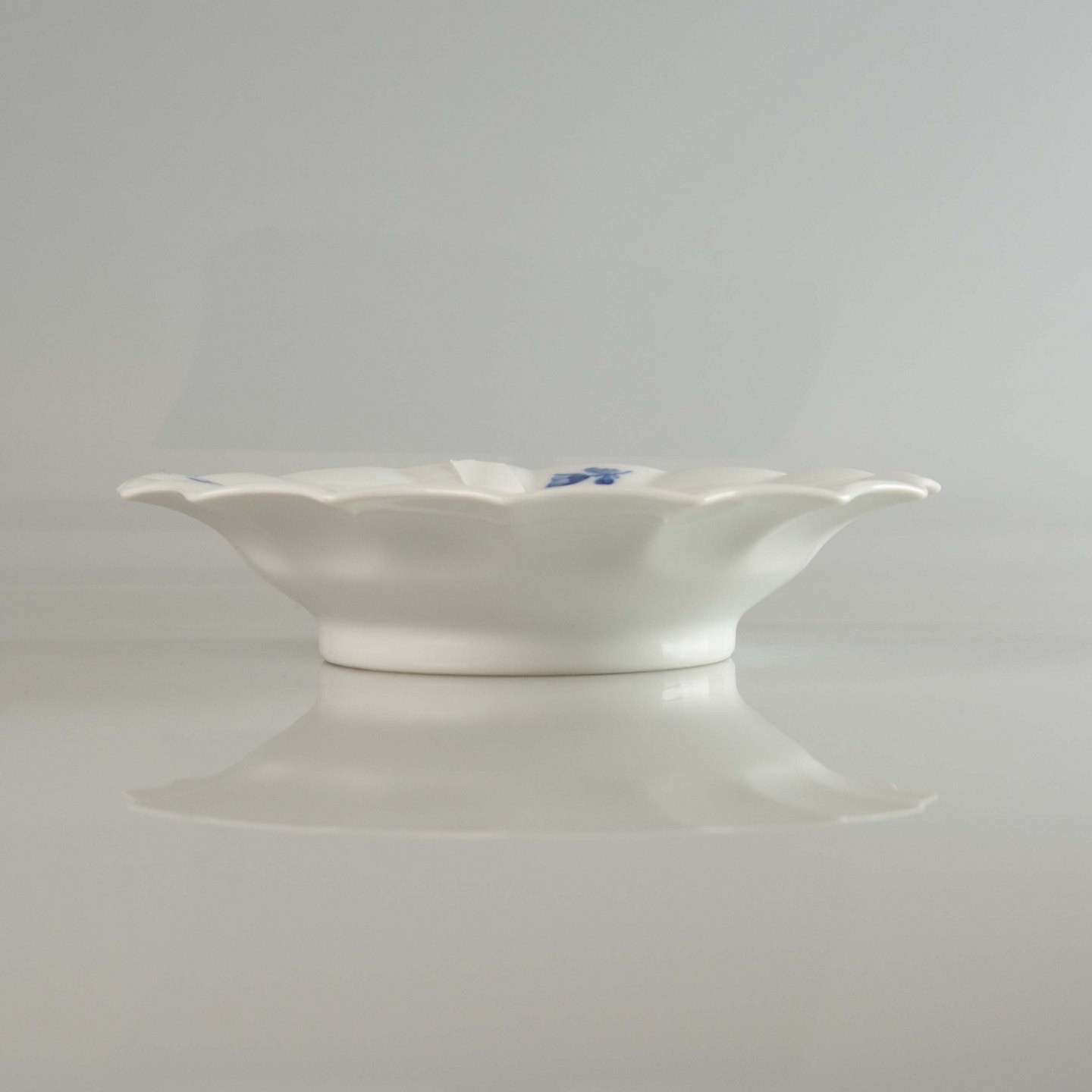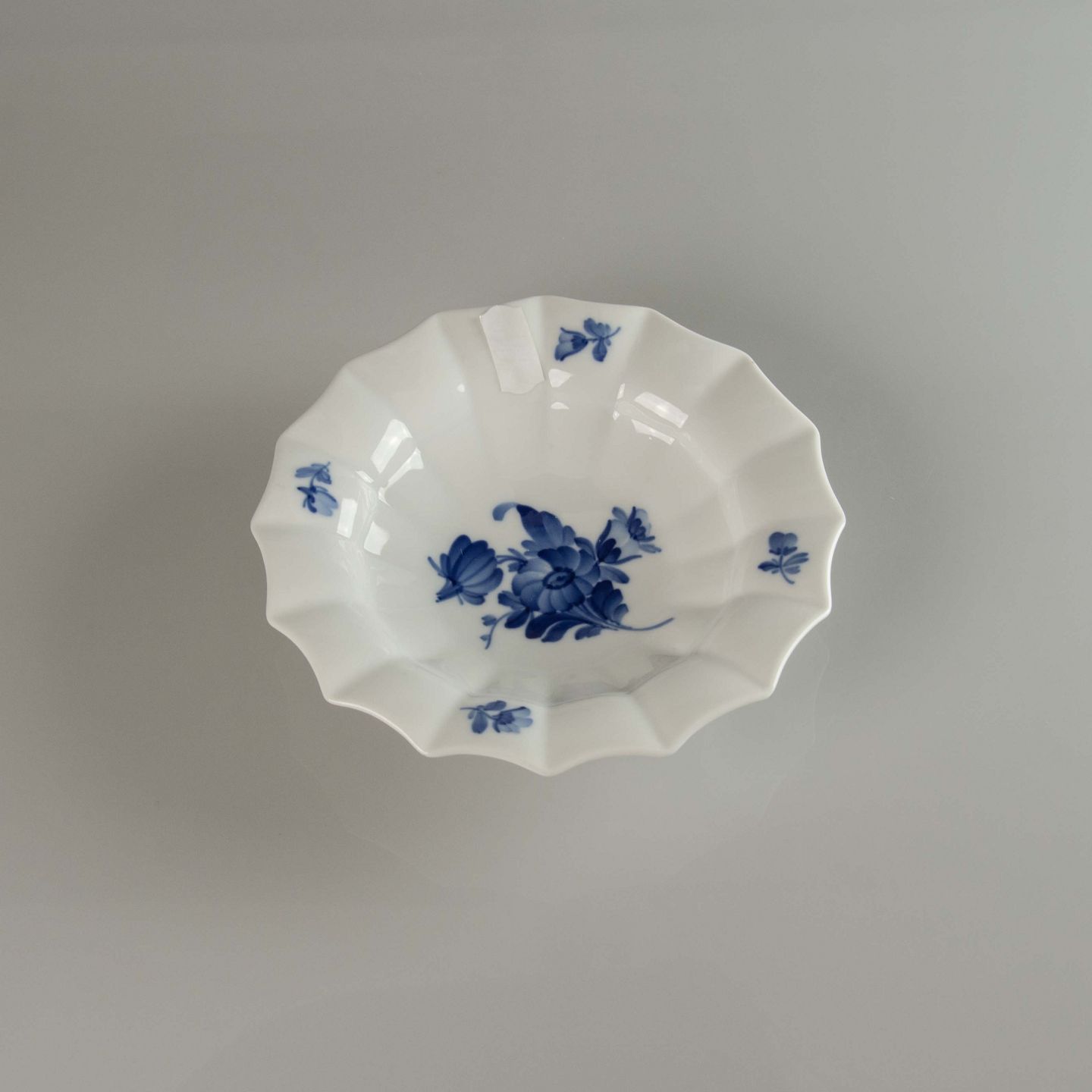 Mindre skål i porcelæn og dekoraktion af blå blomst.