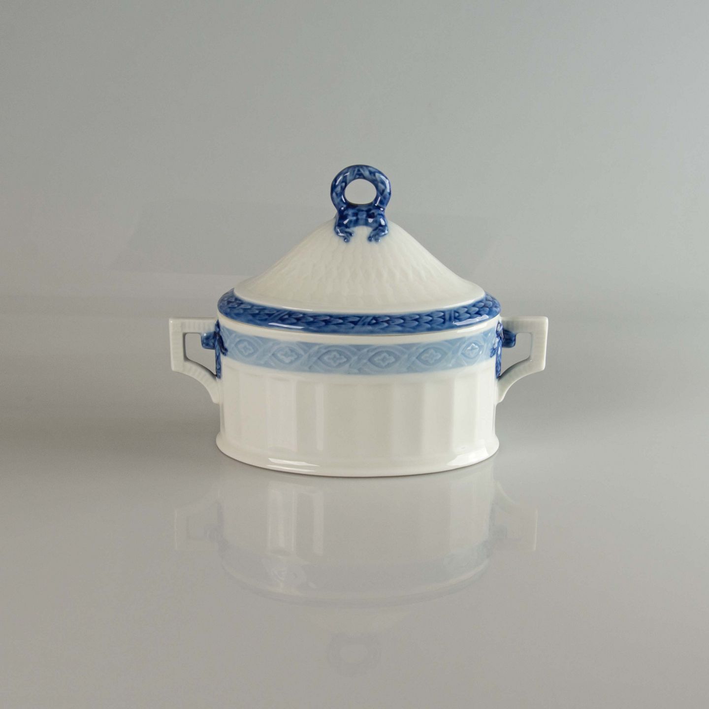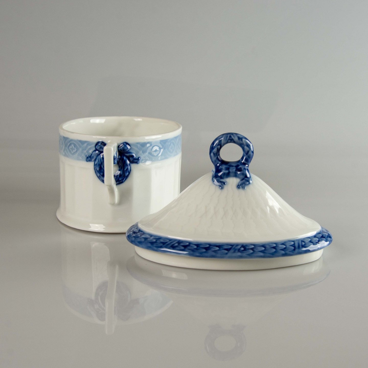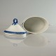 Sukkerskål med låg og hanke i porcelæn og dekoraktion i to blå nuancer. Stellet er også kendt fra serien Matador.
