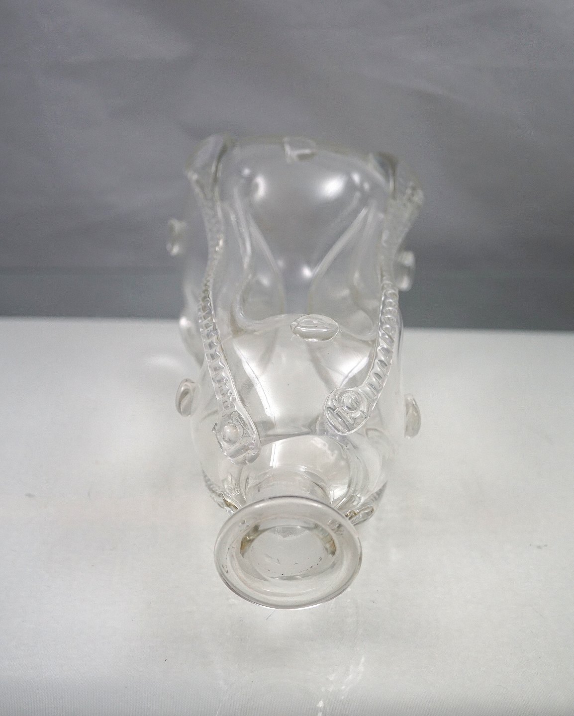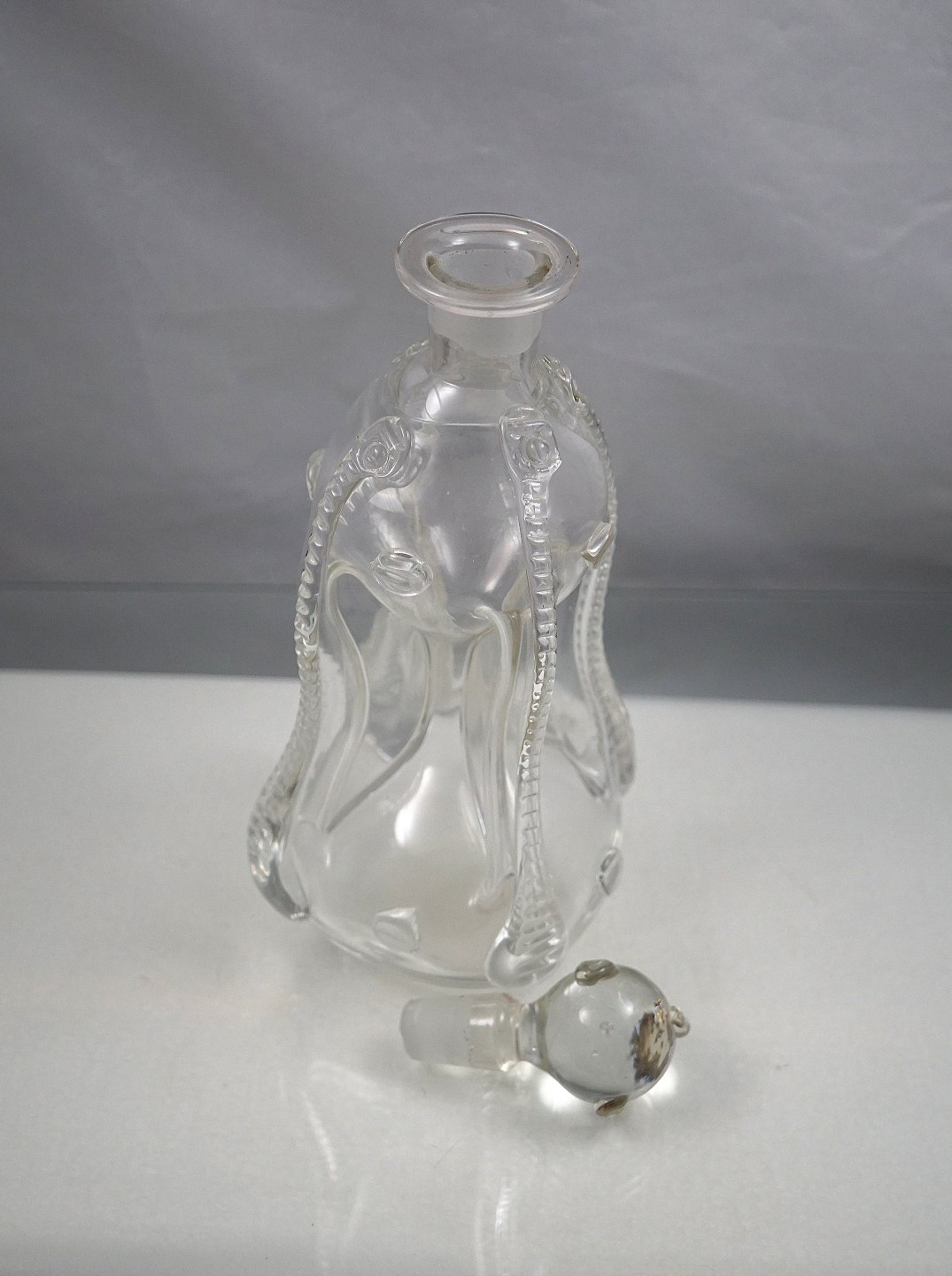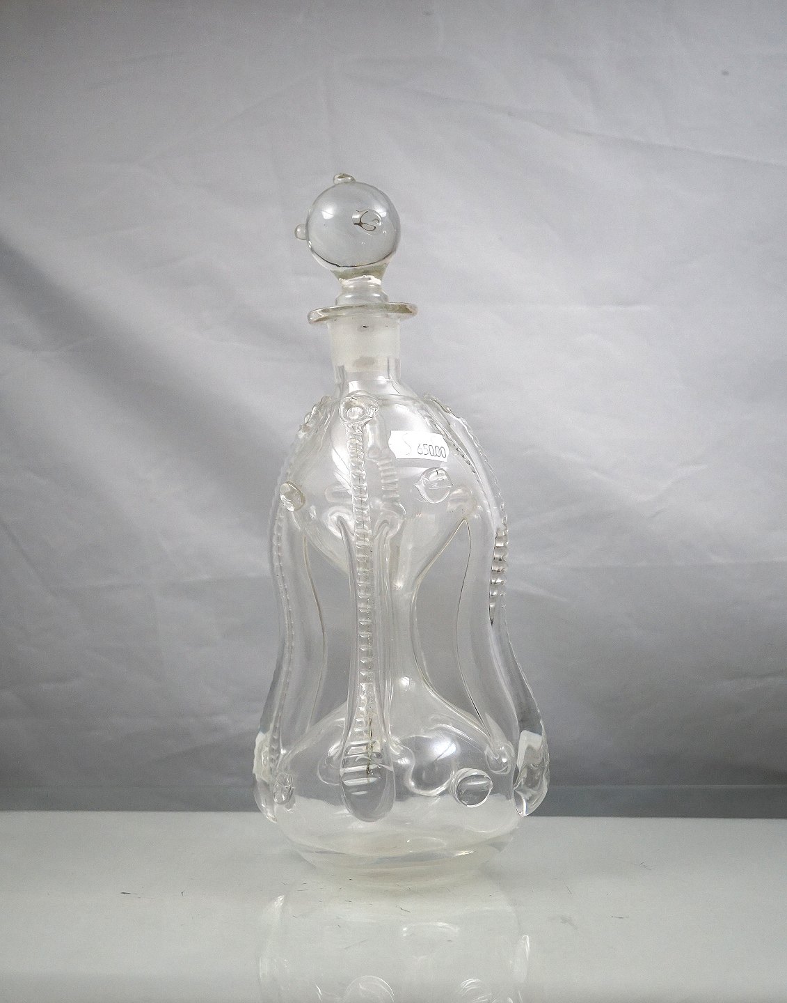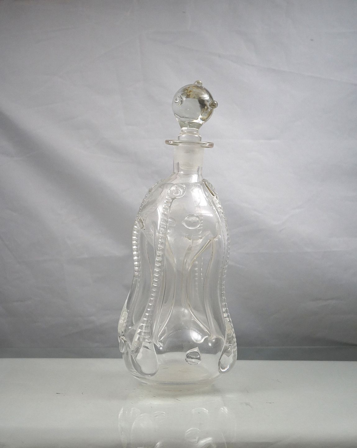 Holmgaard Glasværk. Kluk flasken er oftest firkantet med indsugede sider, hals med udsvajet rand, indboret for prop. Denne flaske svajer lidt i toppen og er dekoreret med rigler og rosetter