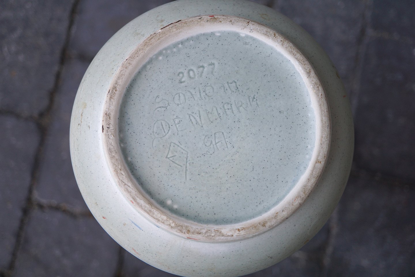 Søholm, Bornholm. Vase, nr. 2077, der er dekoreret med stiliseret lupiner, vasen er hvid og dekorationen er holdt i en blå farve. Signeret EJ, ca. 1960