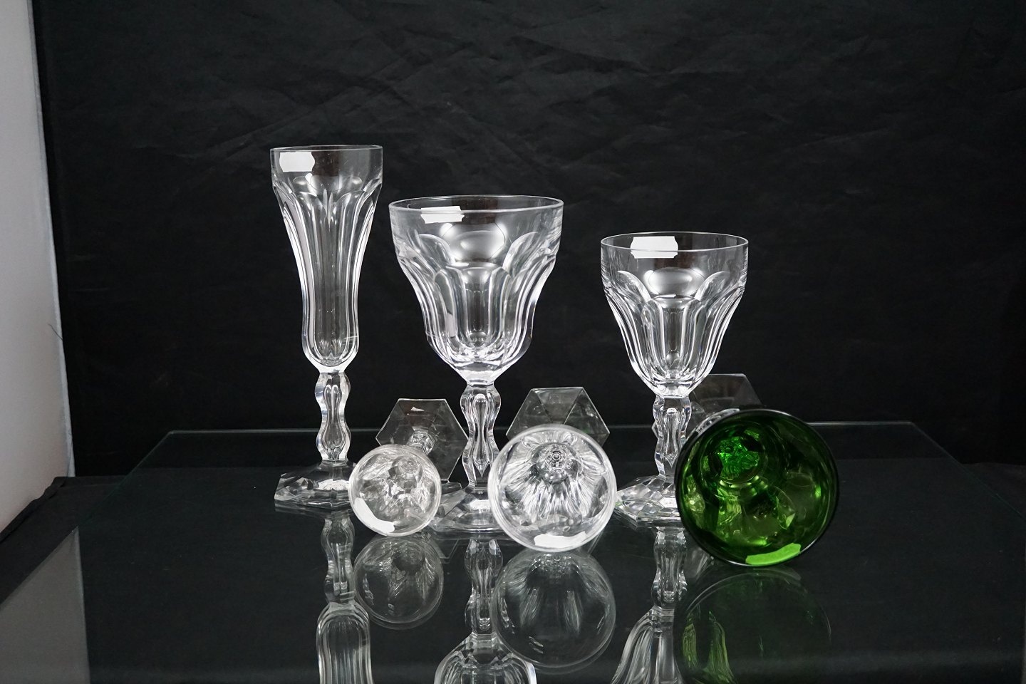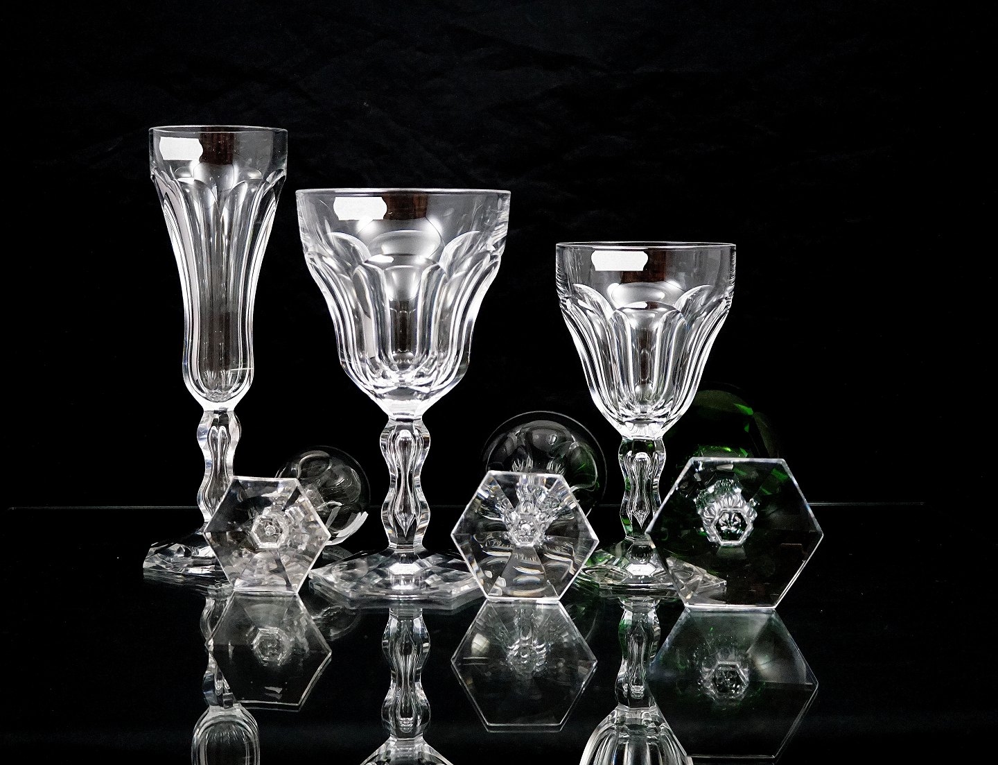Store indad svajet facetslibninger, på facetslebet hul stilk med sekskantet planslebet fod plade og kuglet fod bund, krystalglas.