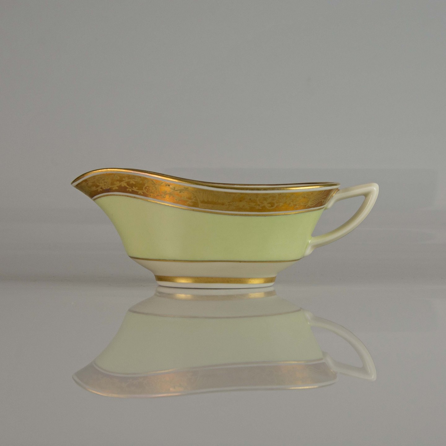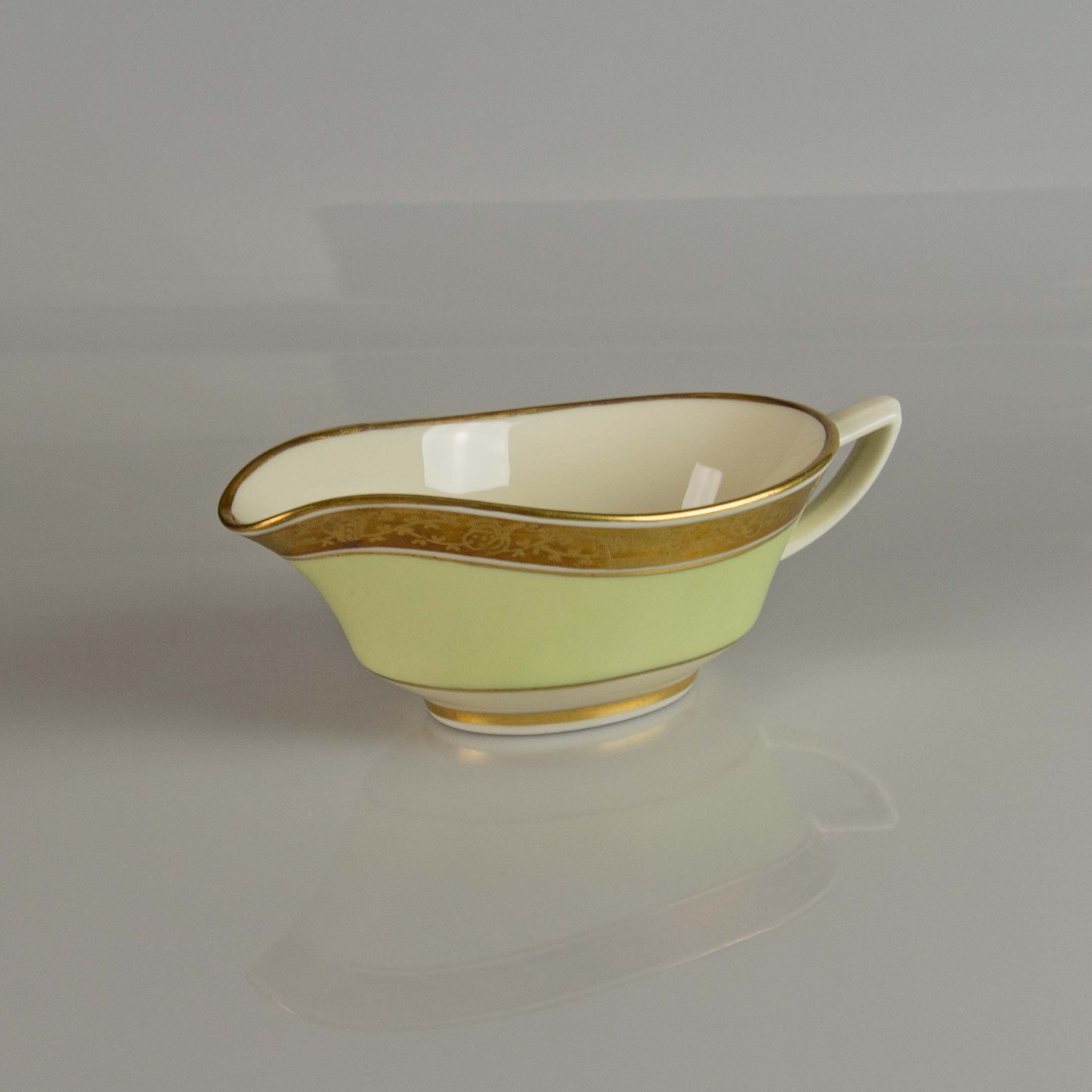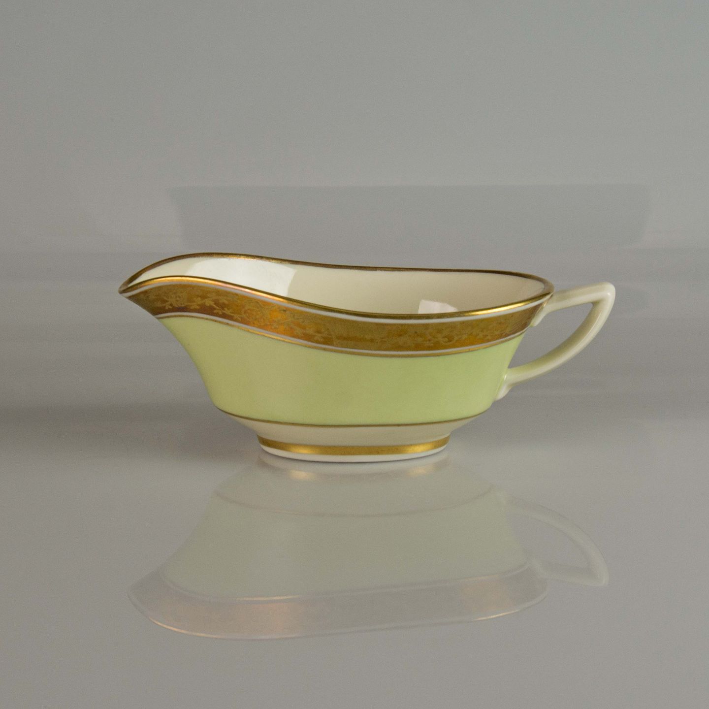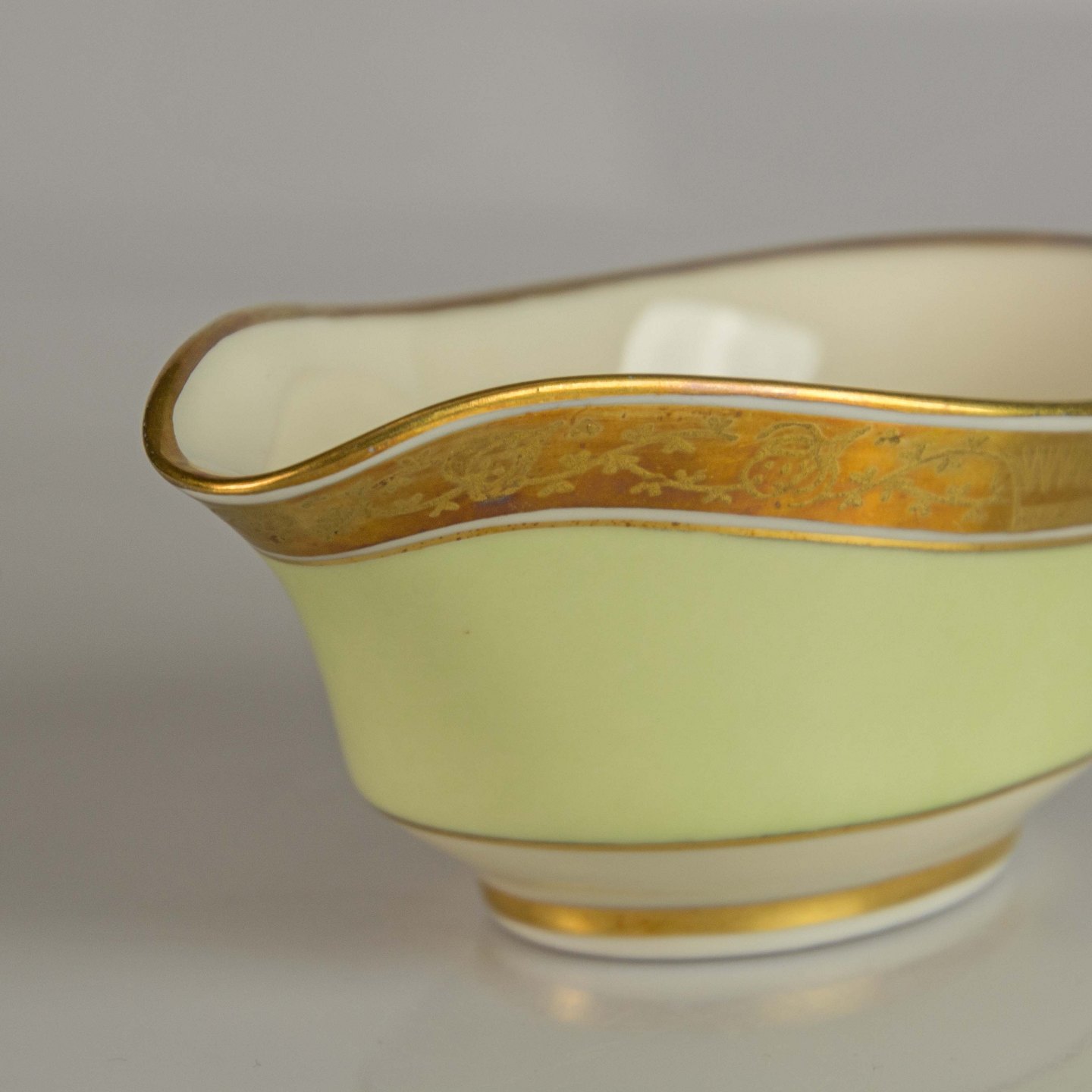 Smørkande i lys grøn og hvid porcelæn med gylden bort med motiv af krone og plantemotiver.