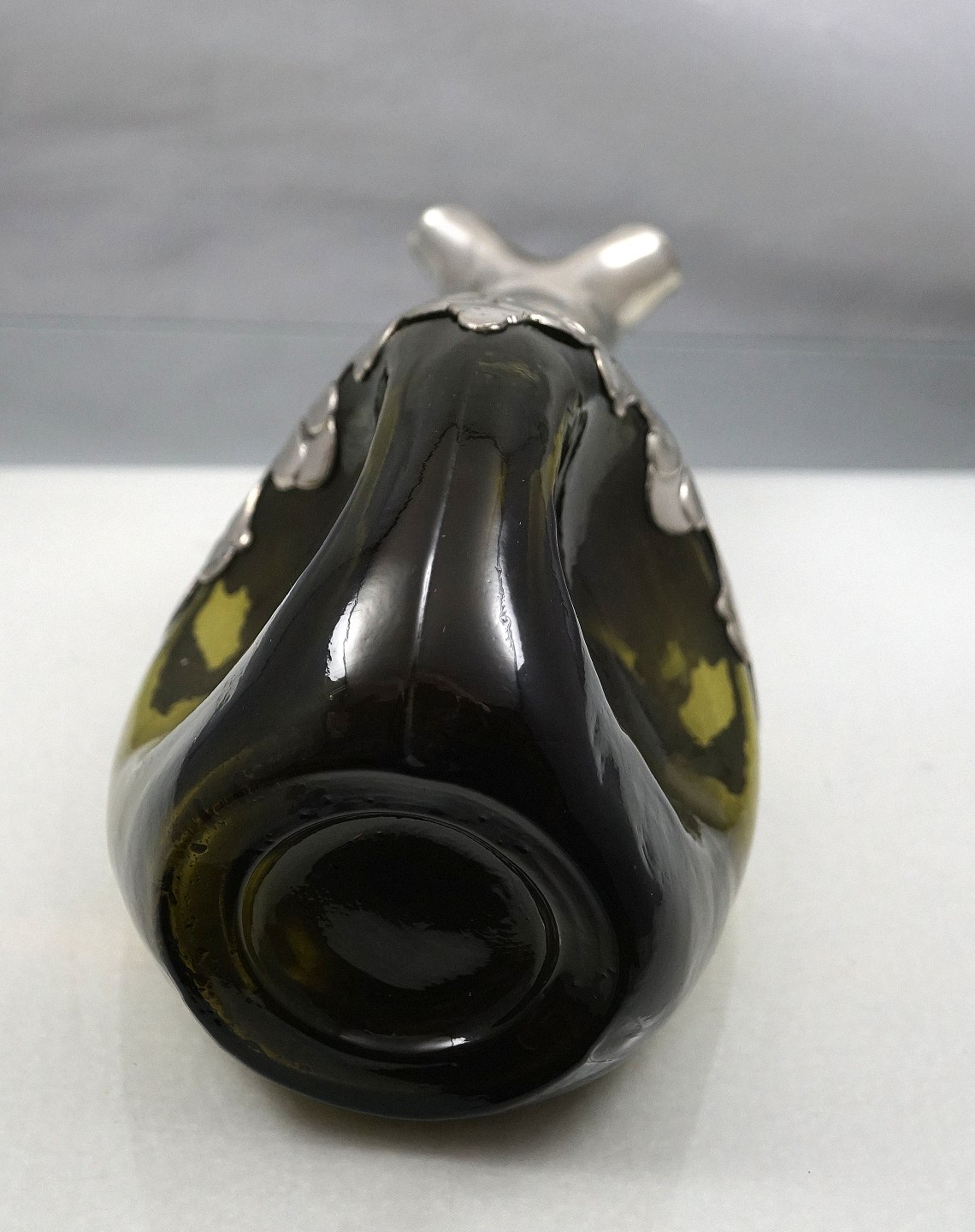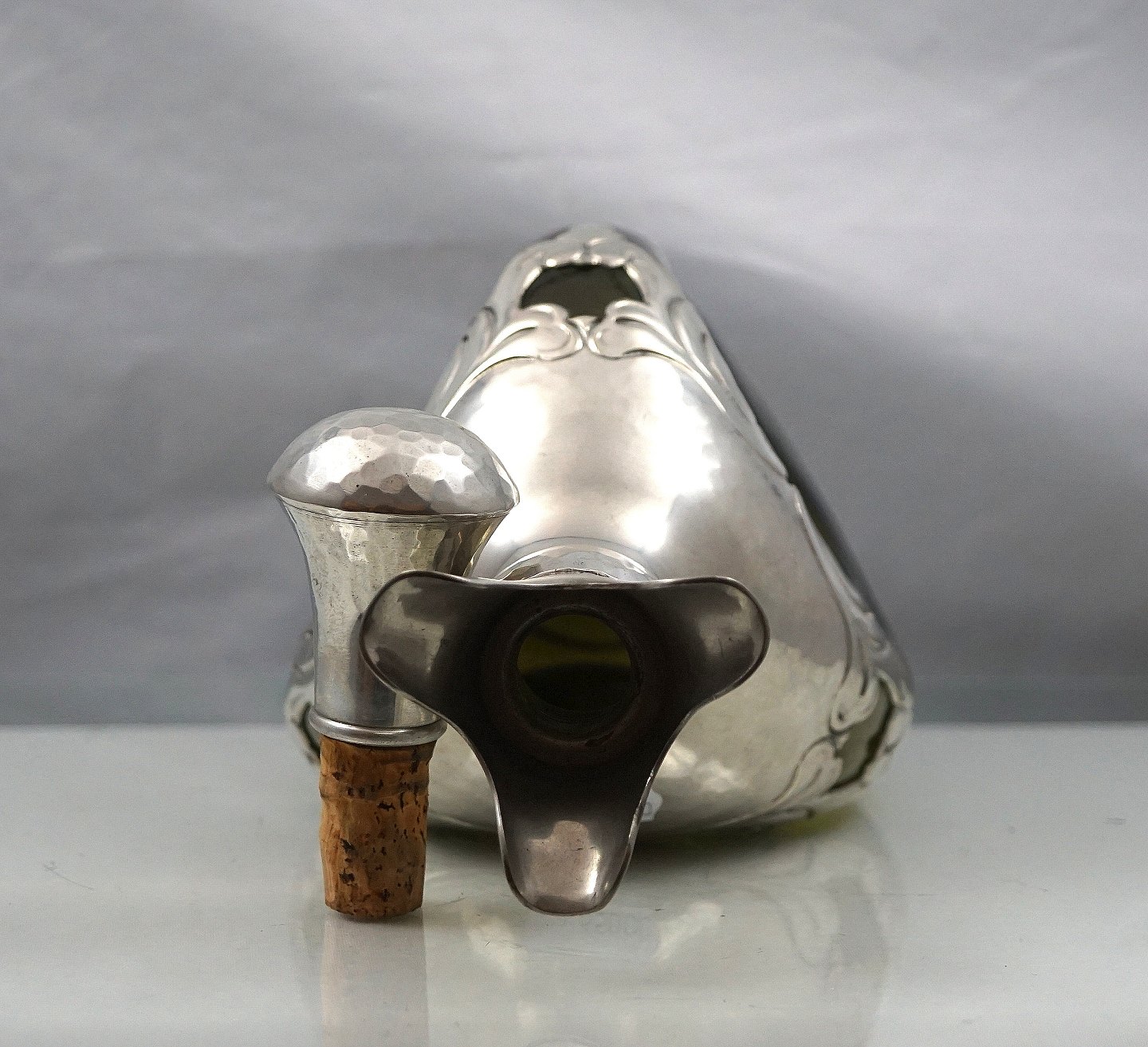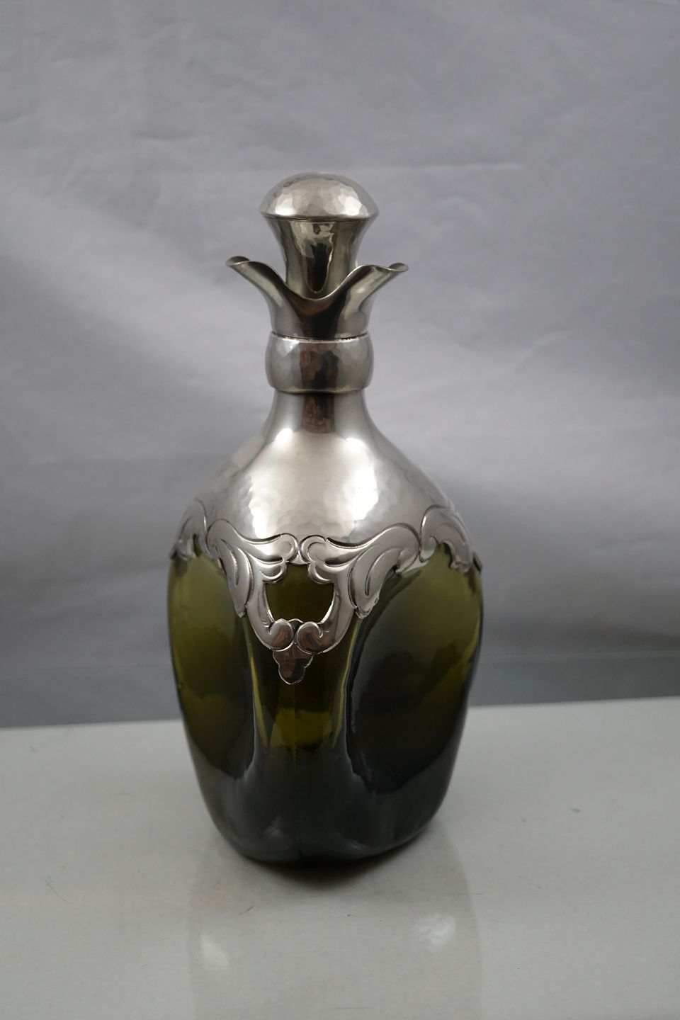 Ældre 3-kantet flaske med tinbesætning på skuldrene og prop af kork og tin, ca 1920 Dansk