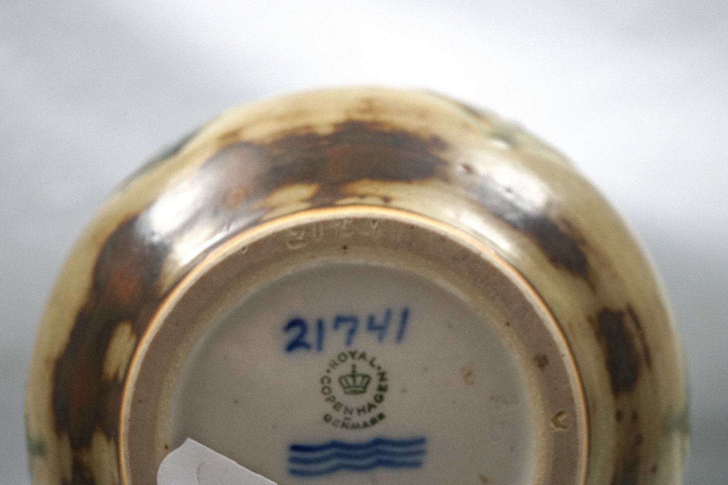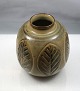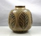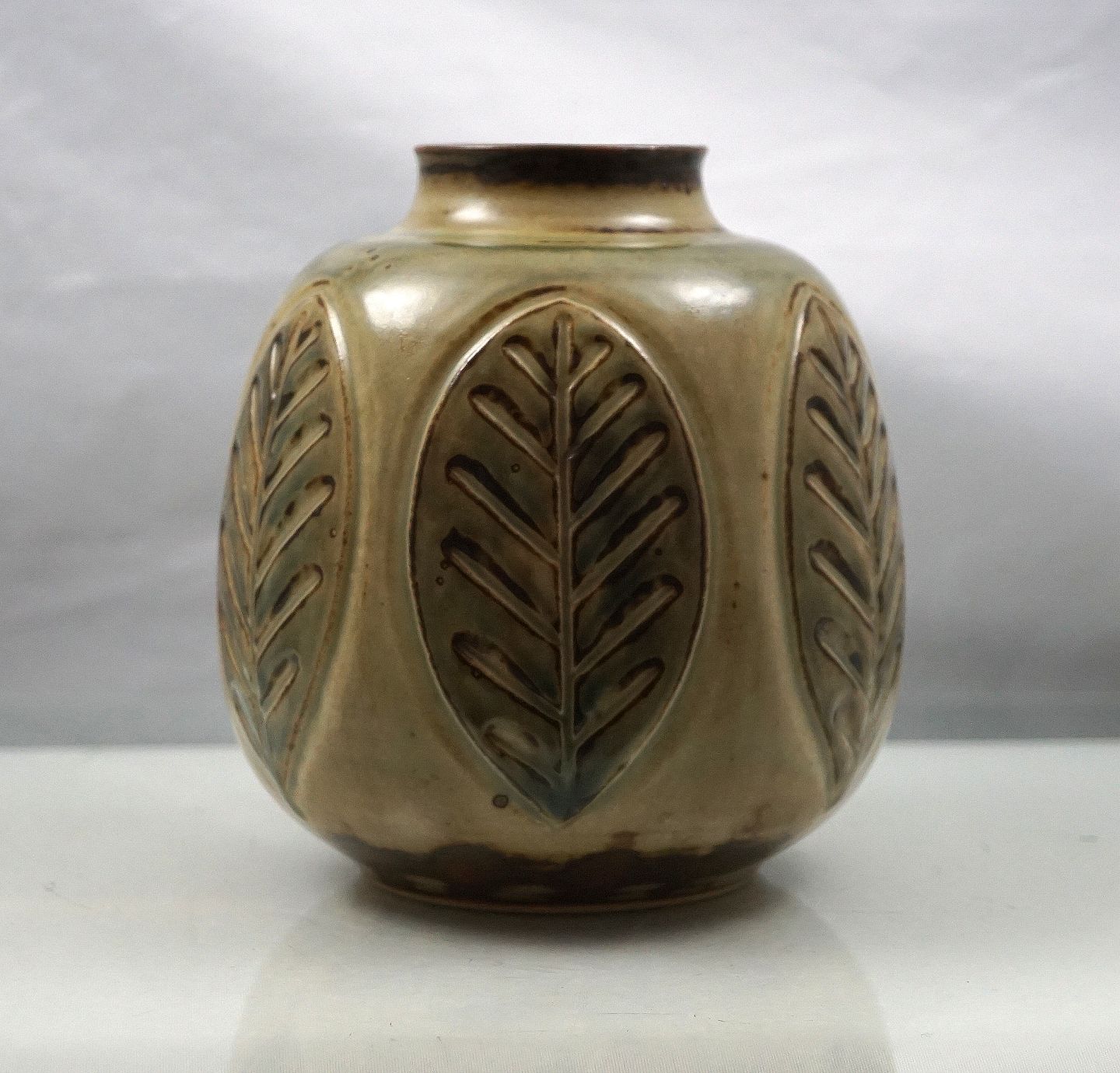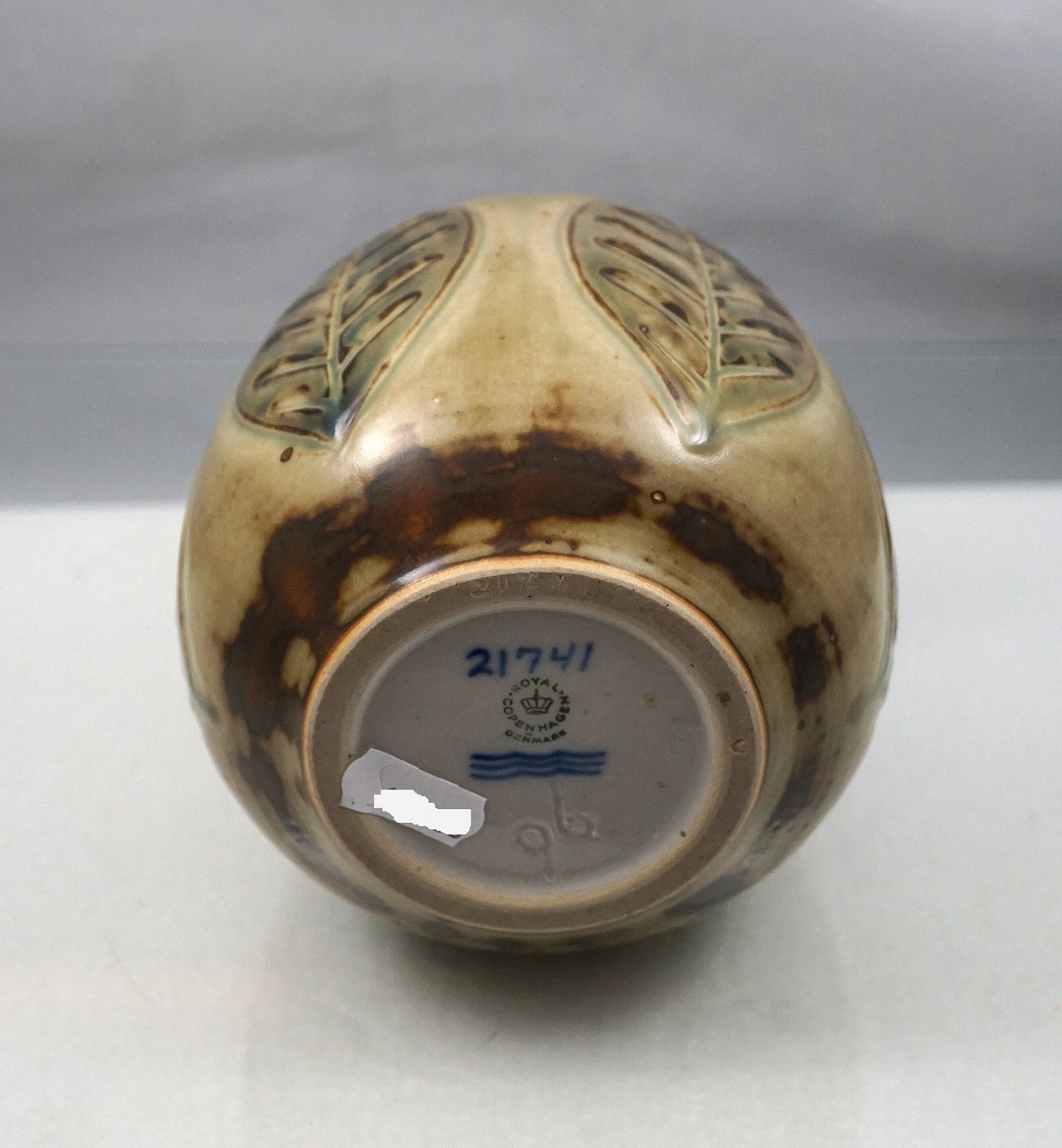 Royal Copenhagen. Stentøjsvase, nr. 21741, af Gerd Bøgelund. Modeleret med bladrelief, dekoreret med solfataraglasur. Vasen er lavet ca. 1965