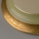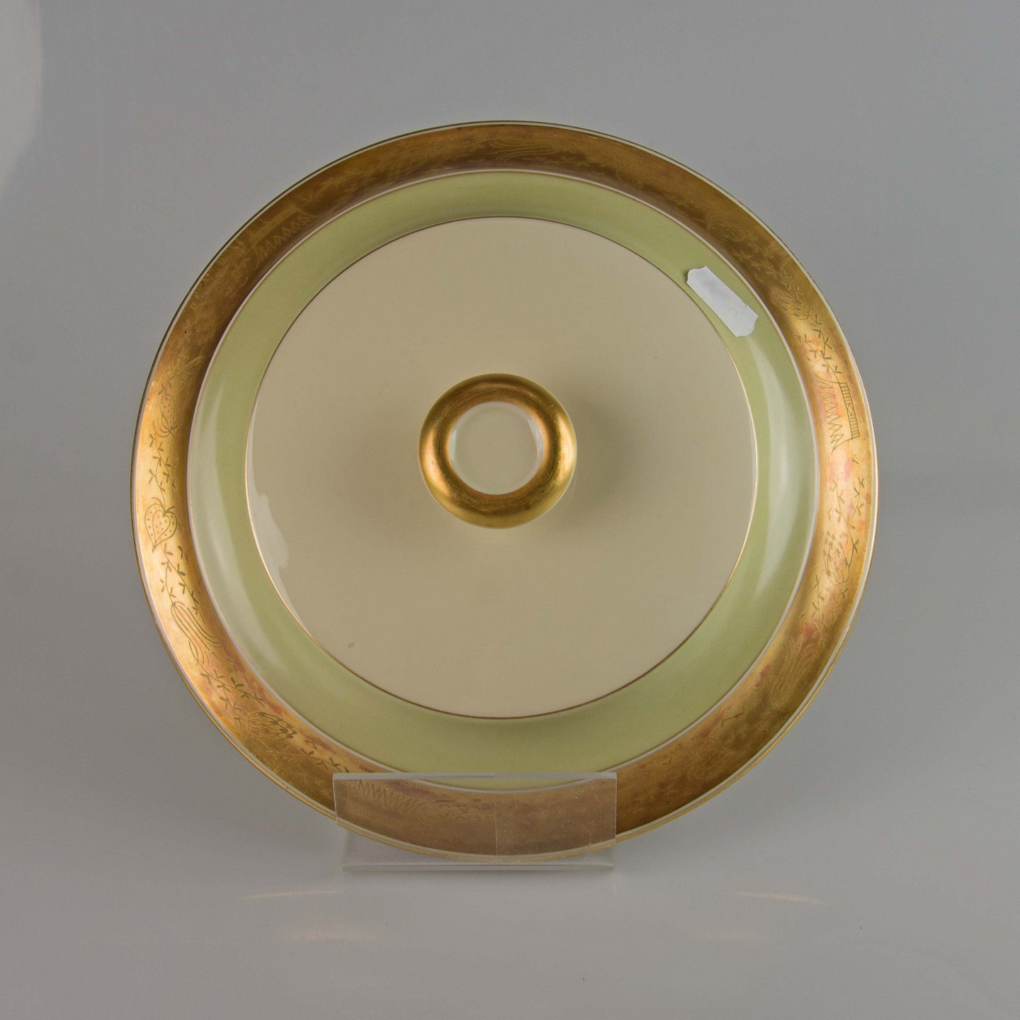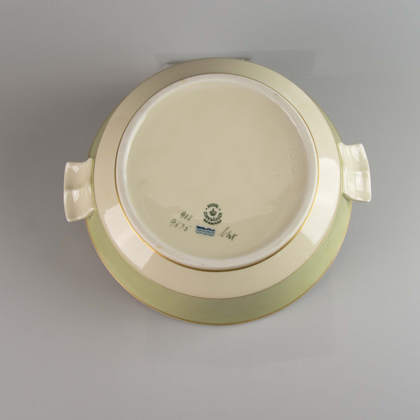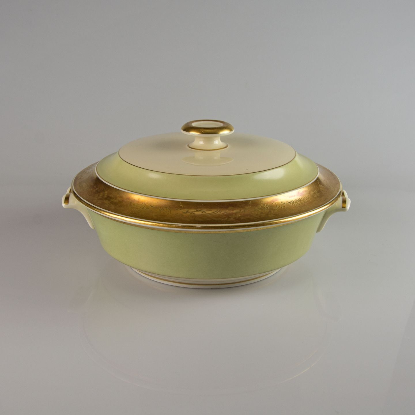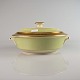 Terrin i lys grøn og hvid porcelæn med gylden bort med motiv af krone og plantemotiver.