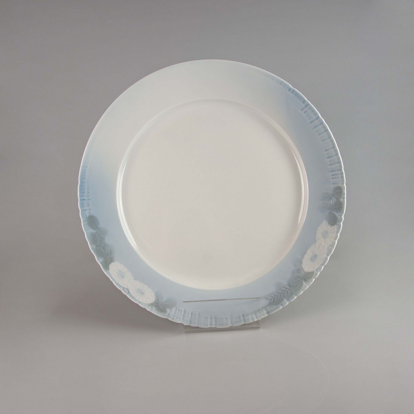 Fad i hvid og lyseblå porcelæn med dekoration af margueritblomster, kornstrå og kløverblade