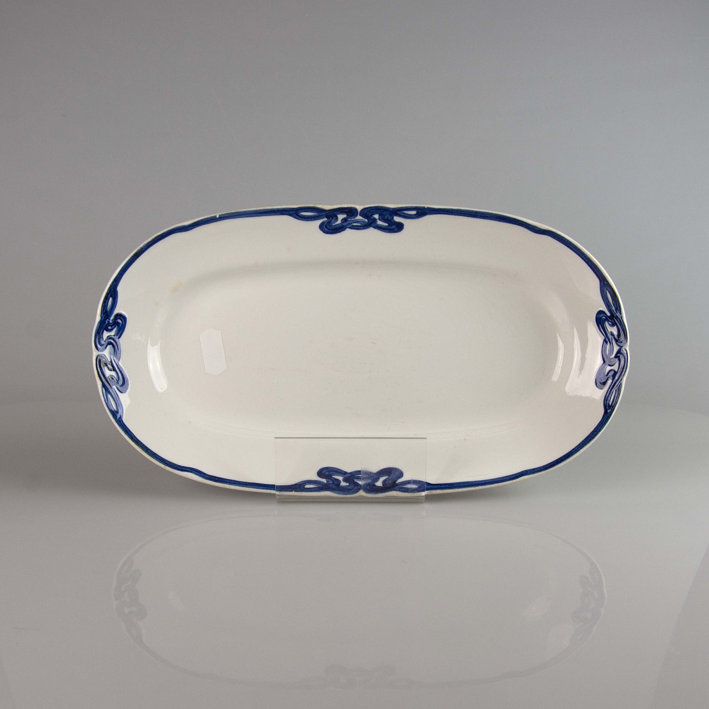 Fad i hvid fajance med dekoration af blå abstrakt mønster langs kanten.