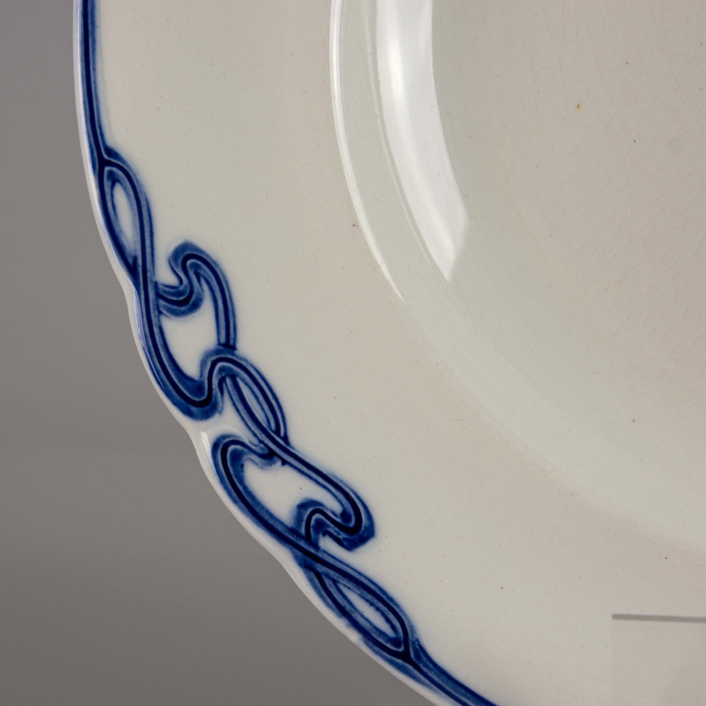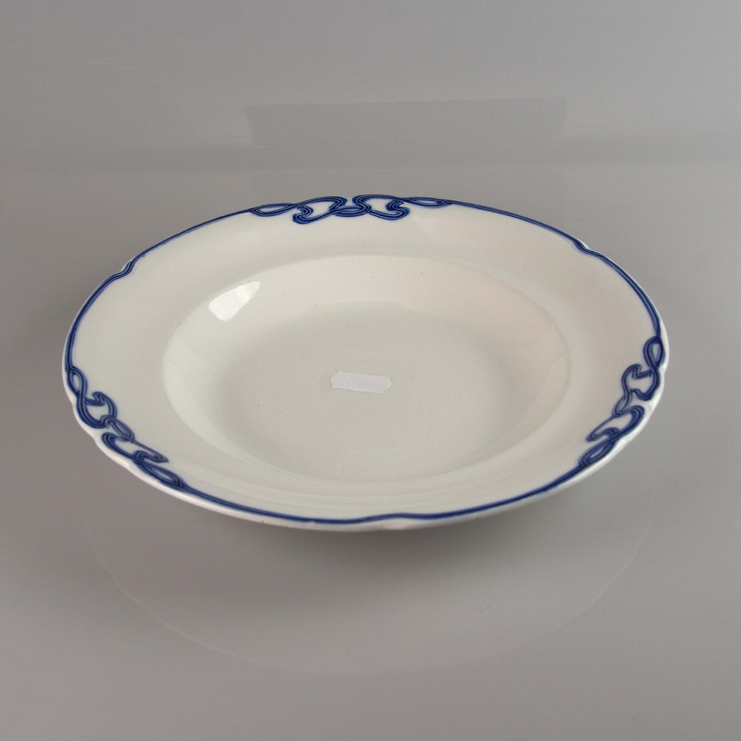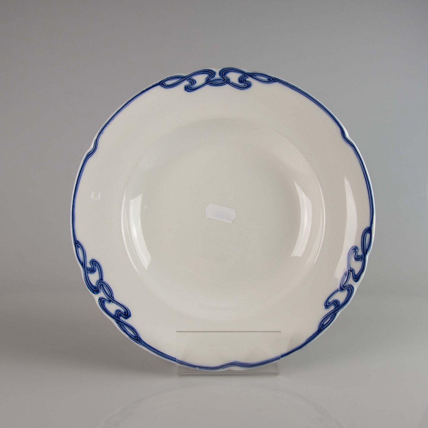 Tallerken i hvid fajance med dekoration af blå abstrakt mønster langs kanten.
