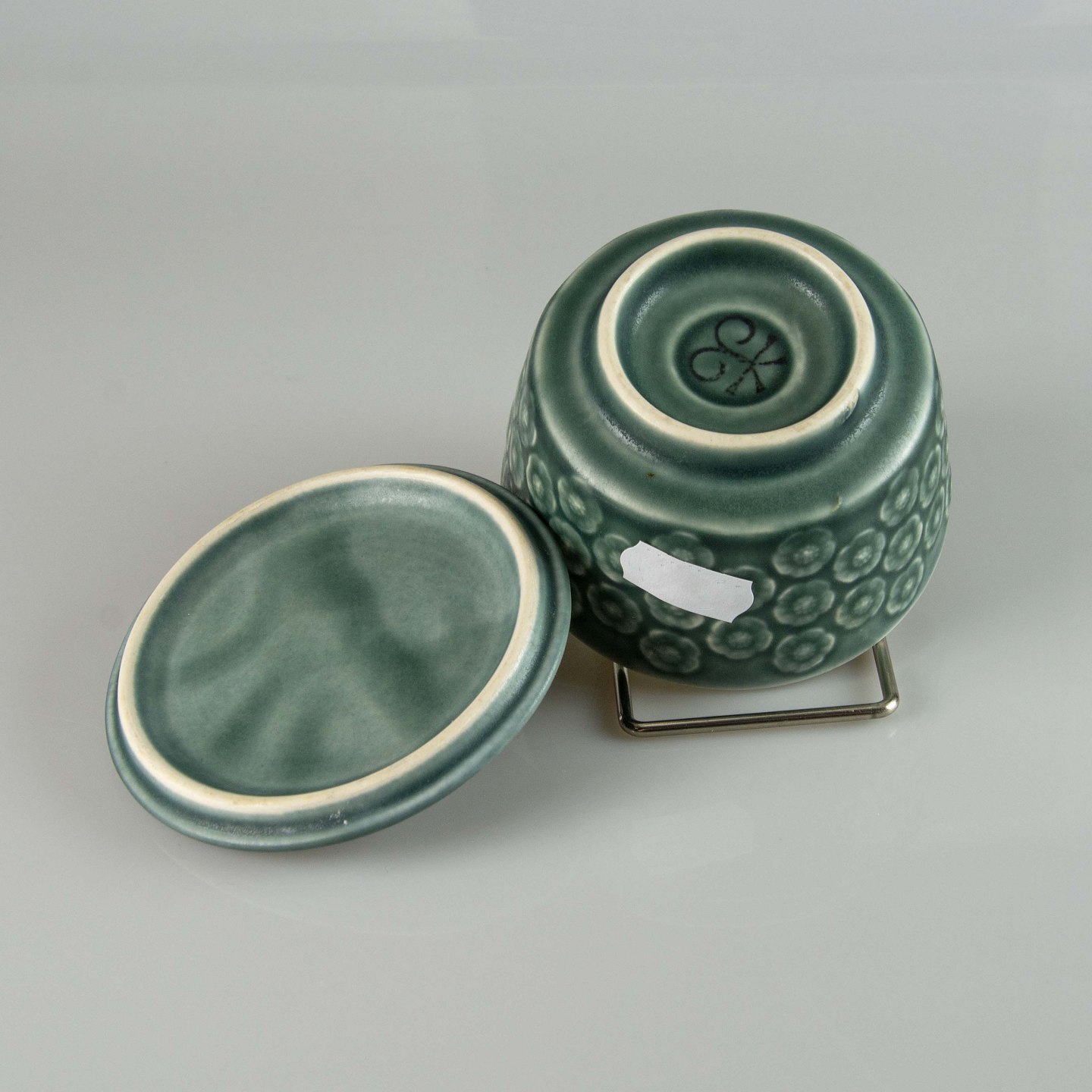 Lågkrukke i blågrøn stentøj med blomster motiver.