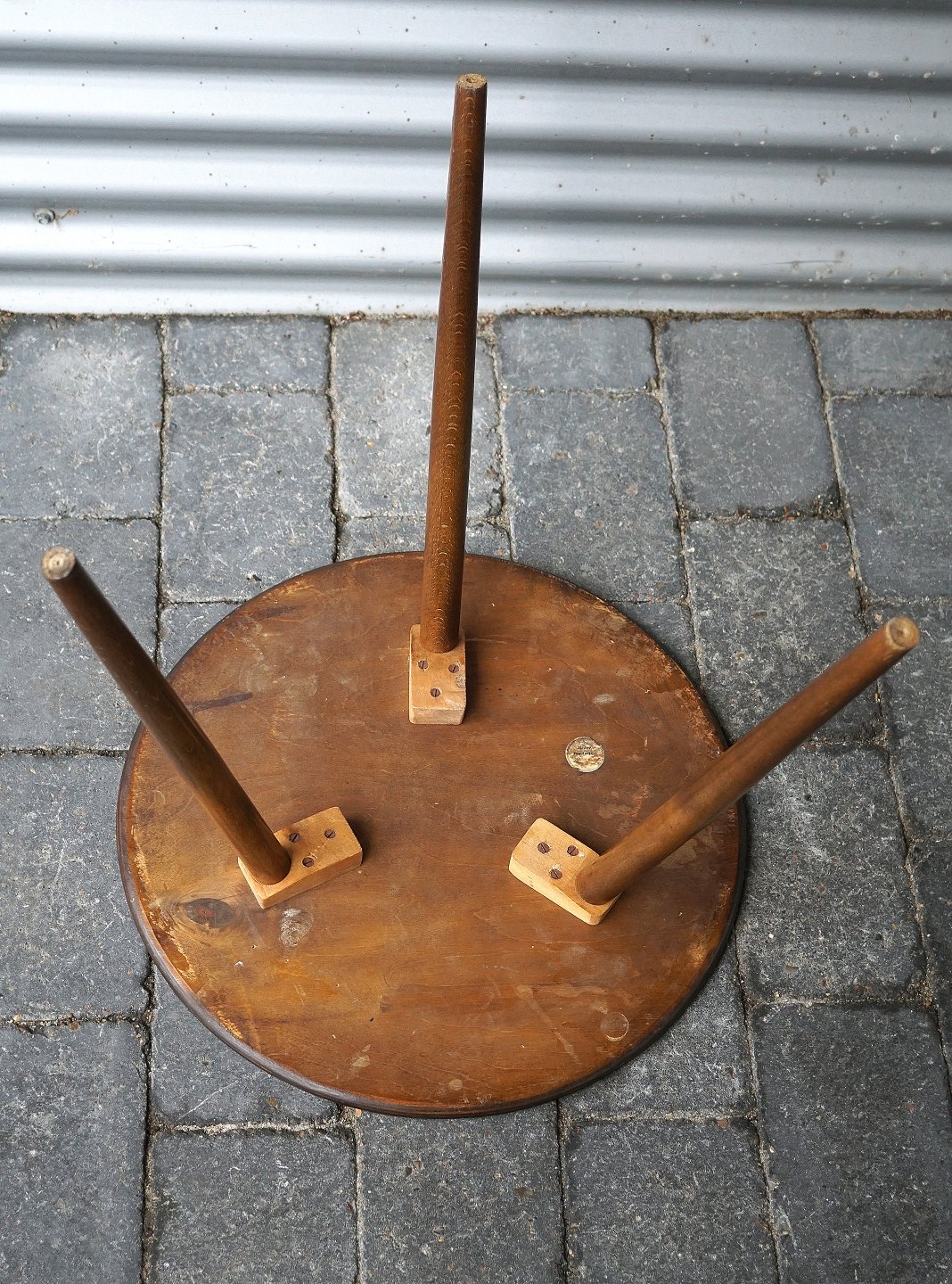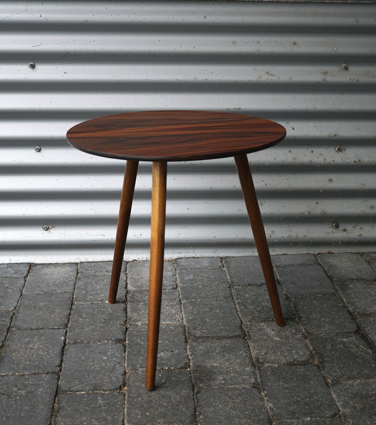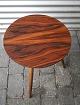 Rundt palisander sidebord. Bordet har 3 ben i bejset bøg