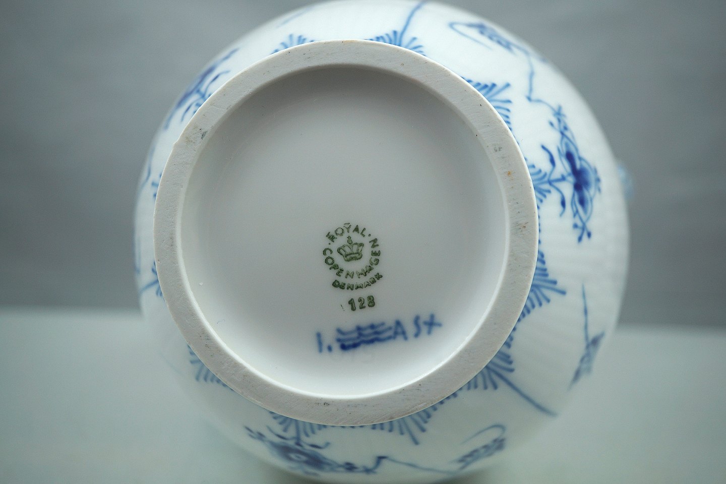 Royal Copenhagen. Musselmalet riflet kaffekande nr. 128 + låg nr.127