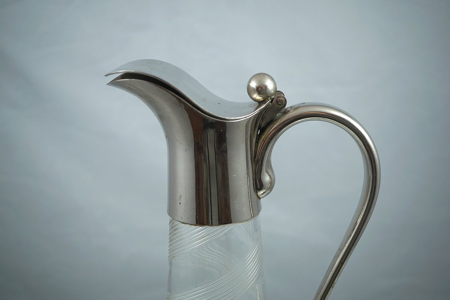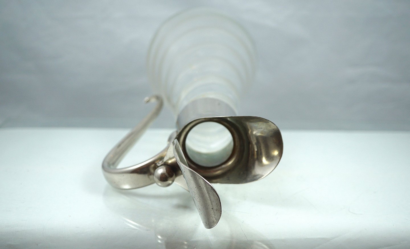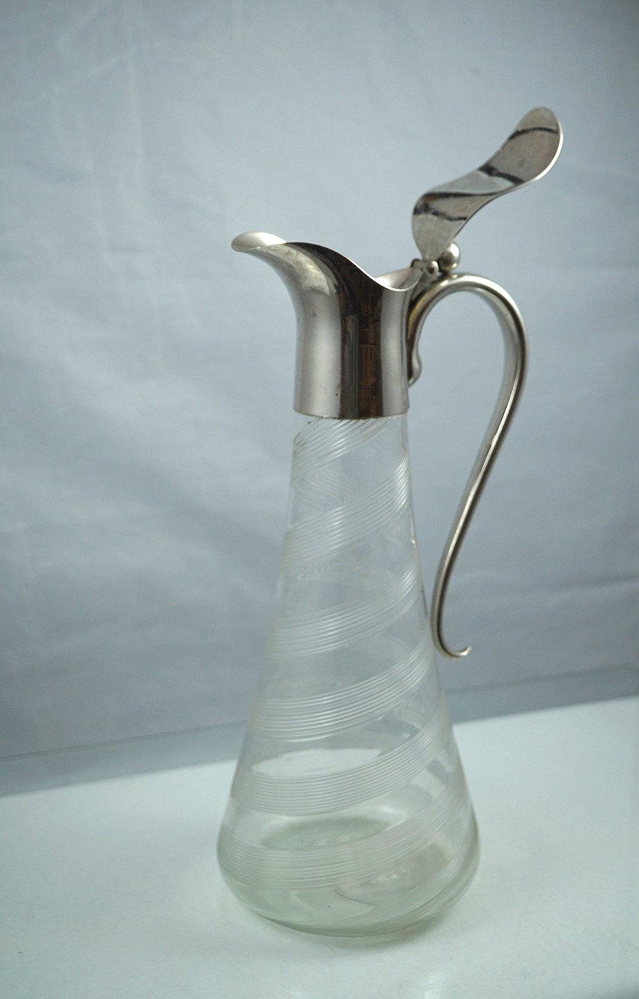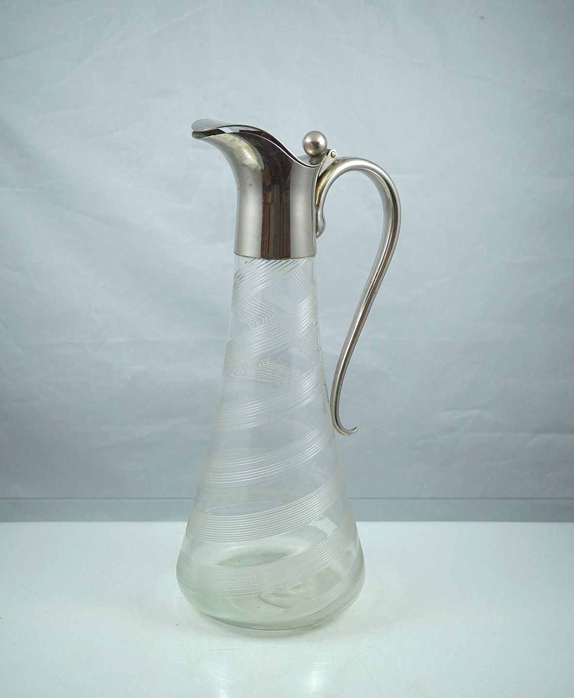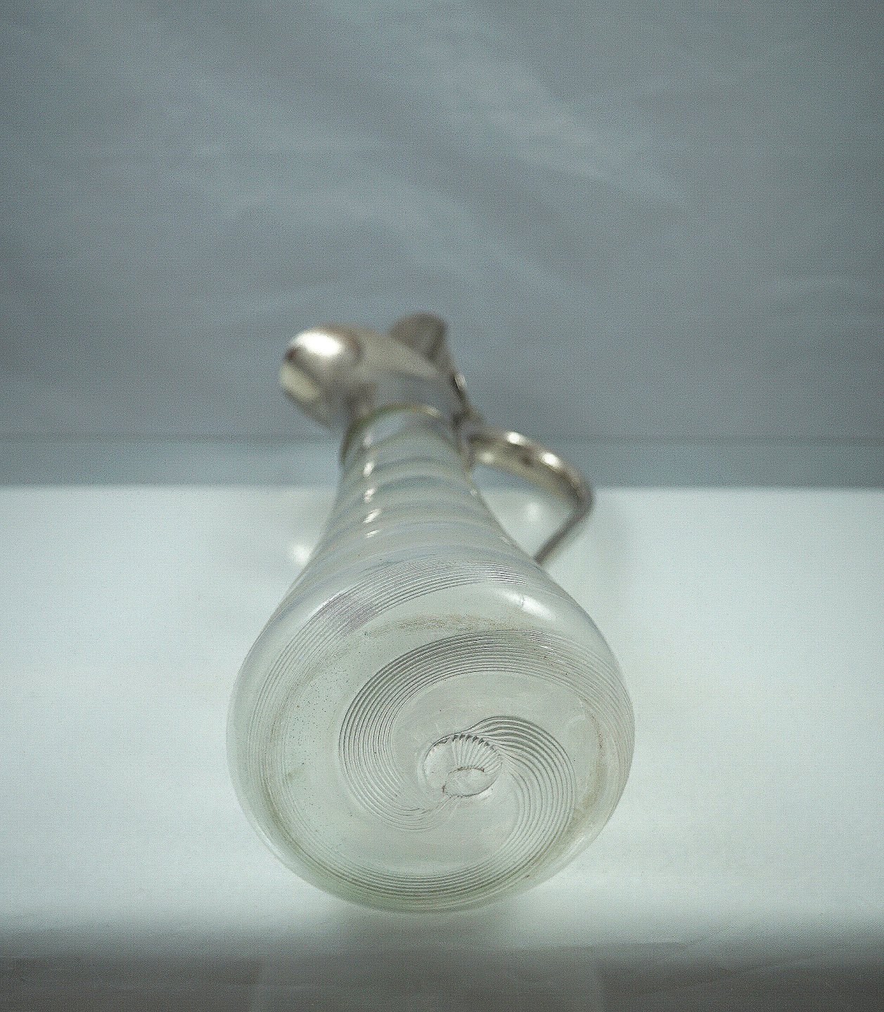 Glaskande med pletsølv hældetud og hank. Ingen stempler. Kanden er dekoreret med en spiral, fra øverst til nederst
