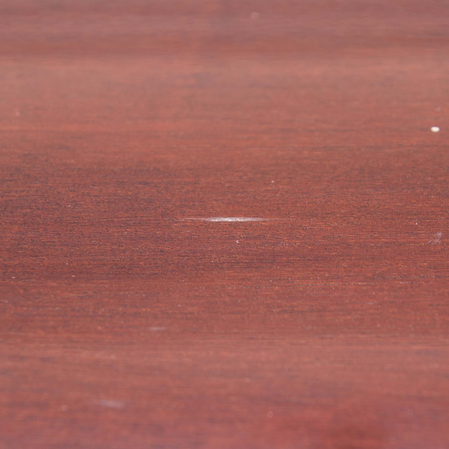 Skabet har afrundet front og flytbare hylder, som er beklædt med grå velour. Fremstillet af flere træsorter.