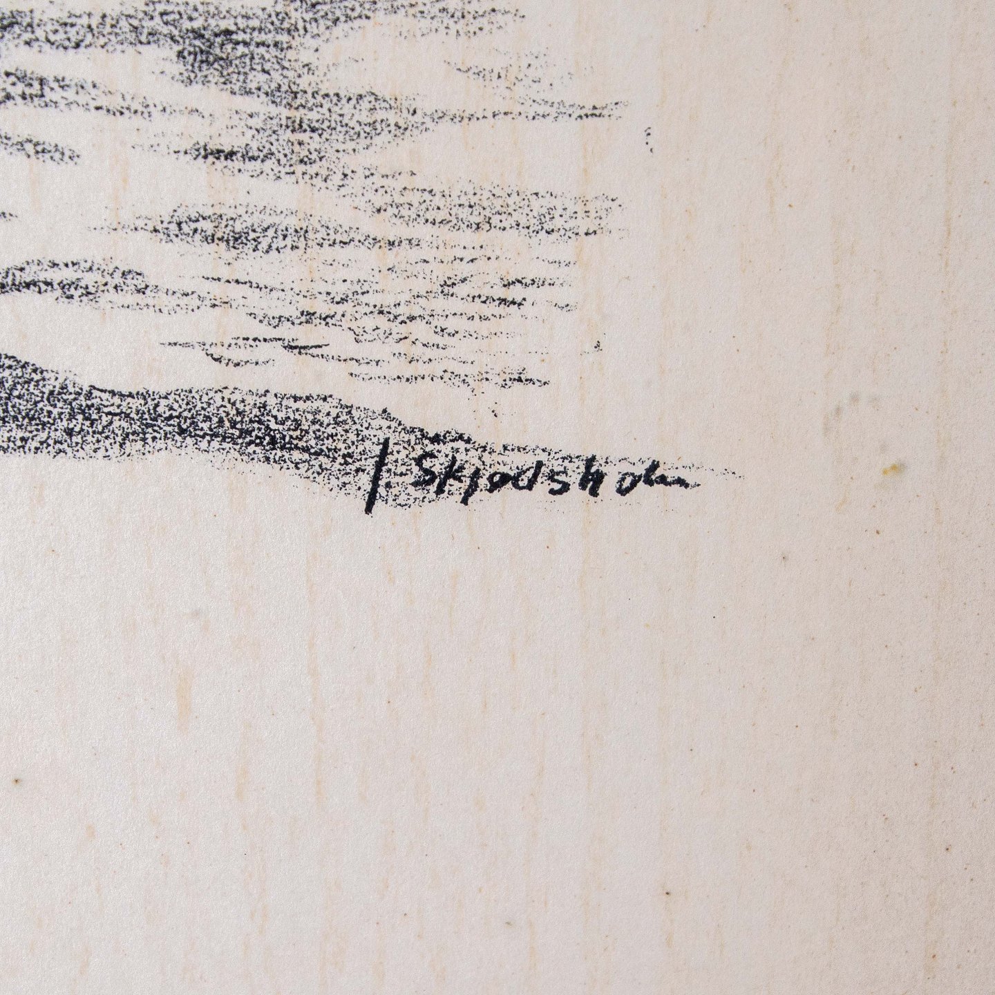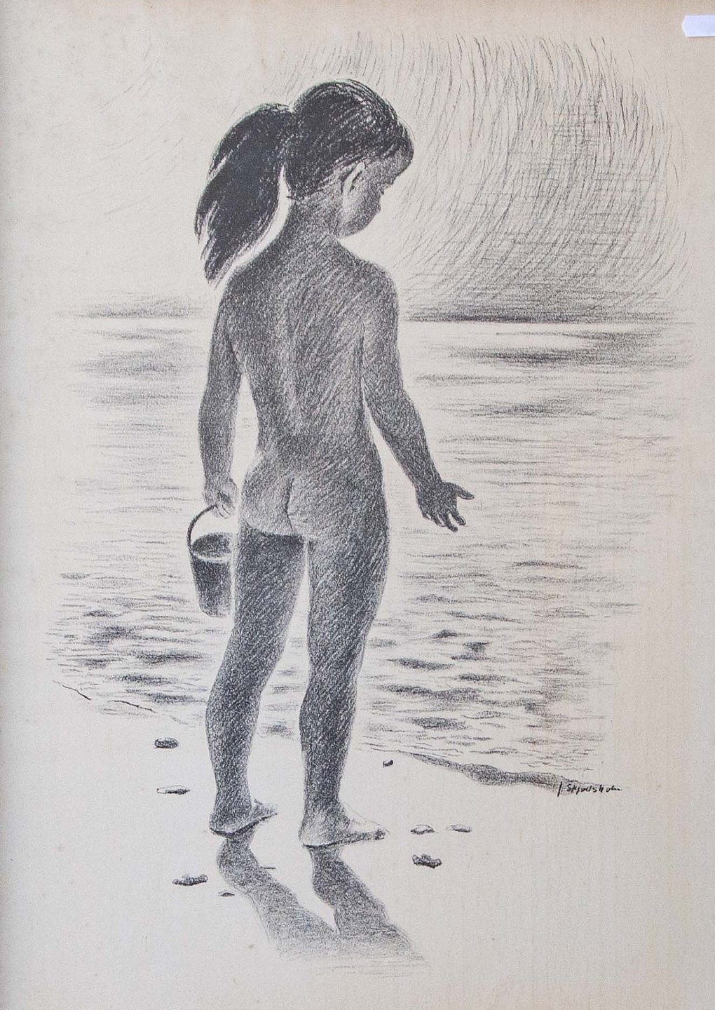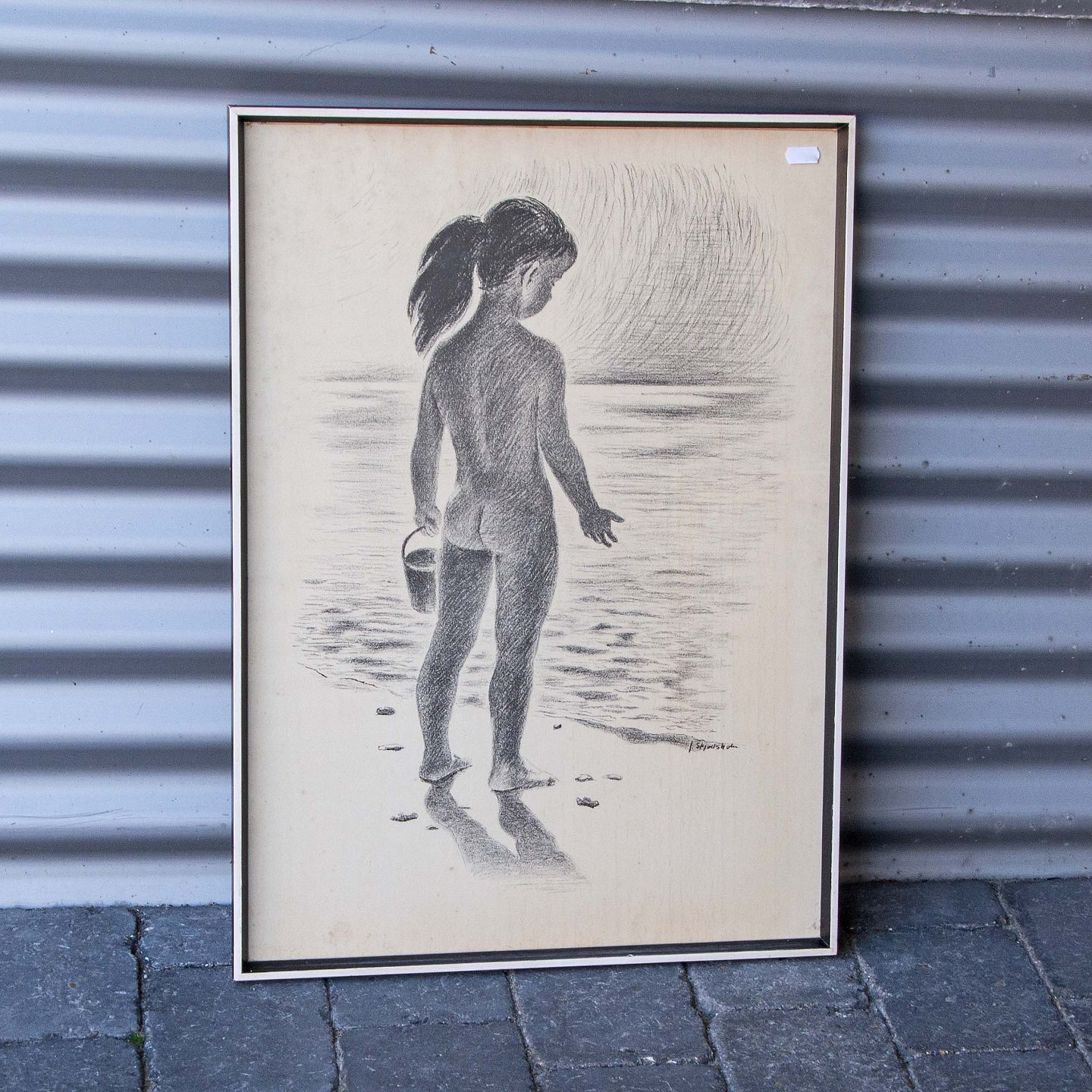 Indrammet tryk i lys ramme med sort kant og med motiv af nøgen pige, med spand, ved strandkant