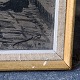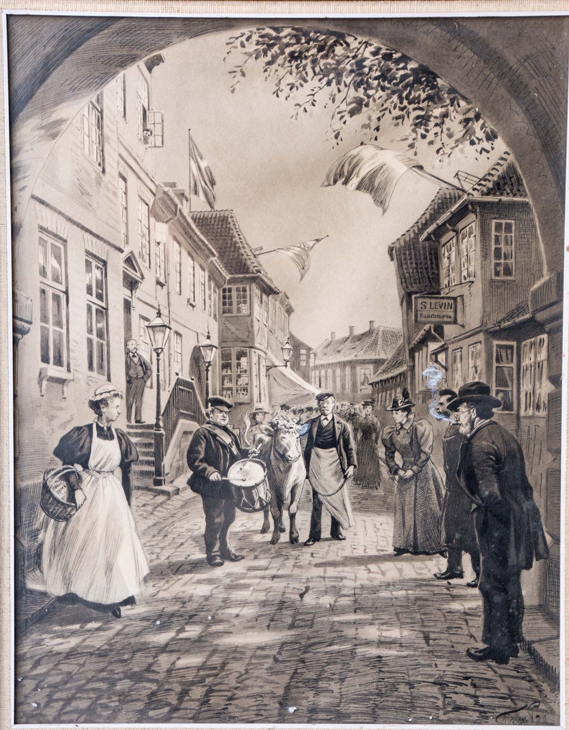 Tegning af gadeliv i glas og ramme.
