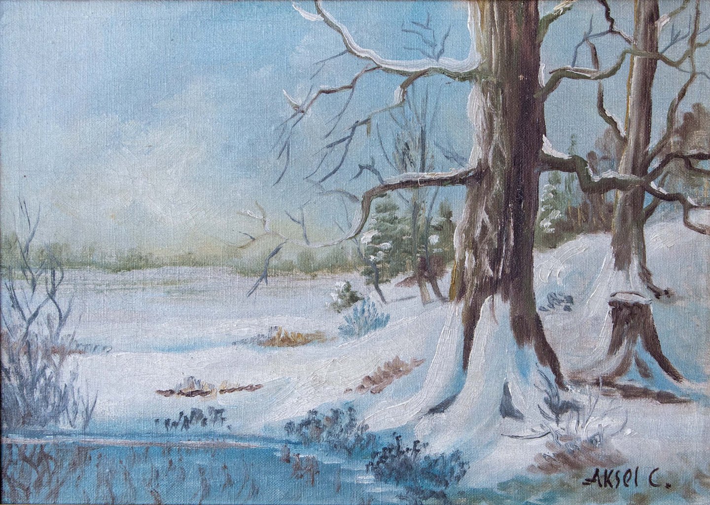 Landskabmaleri med naturmotiv af snedækket landskab ved sø