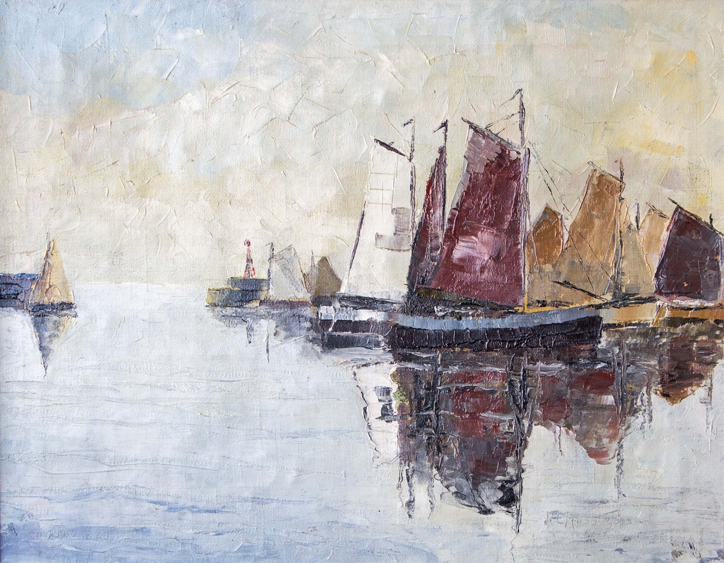 Skibsmaleri med motiv af sejlskibe reflekteret i vandoverflade