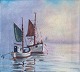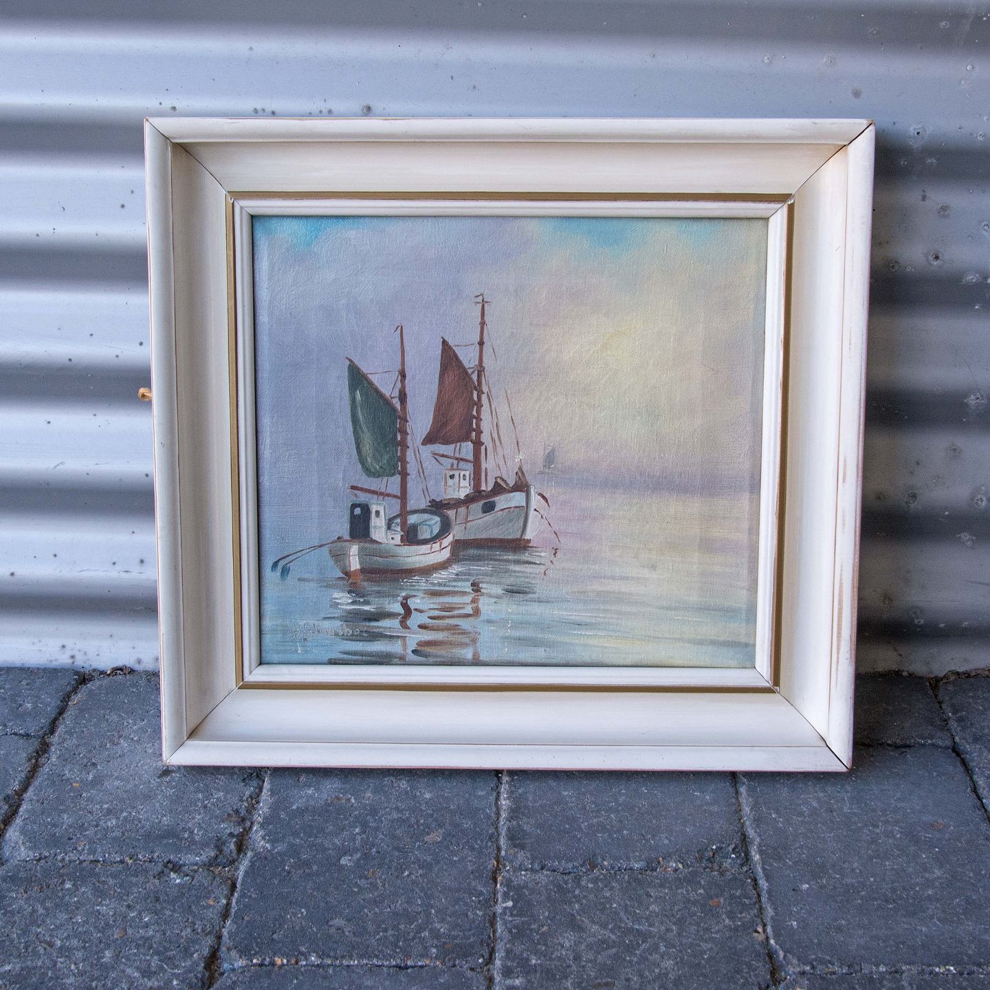 Skibsmaleri med motiv af to fiskerbåde på hav