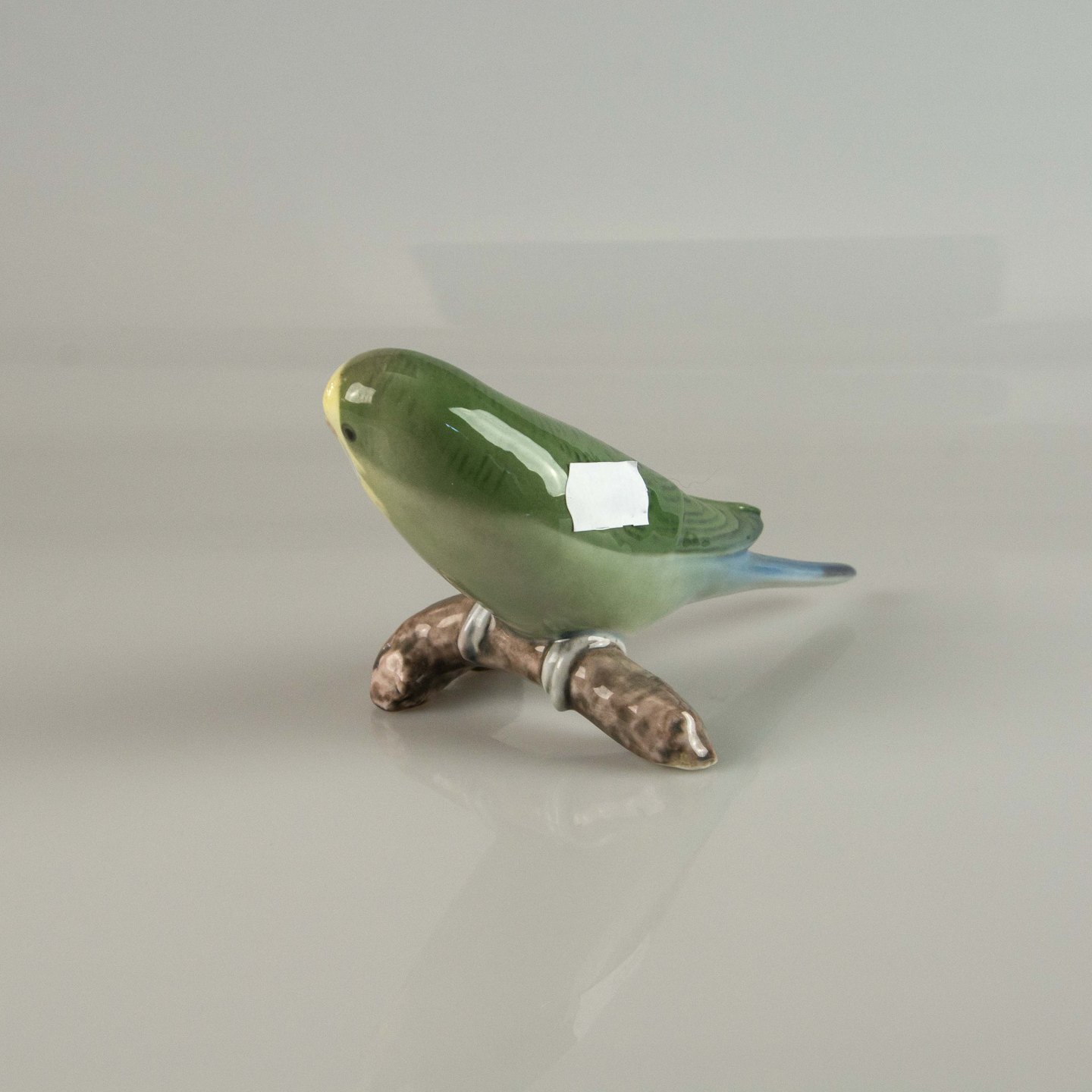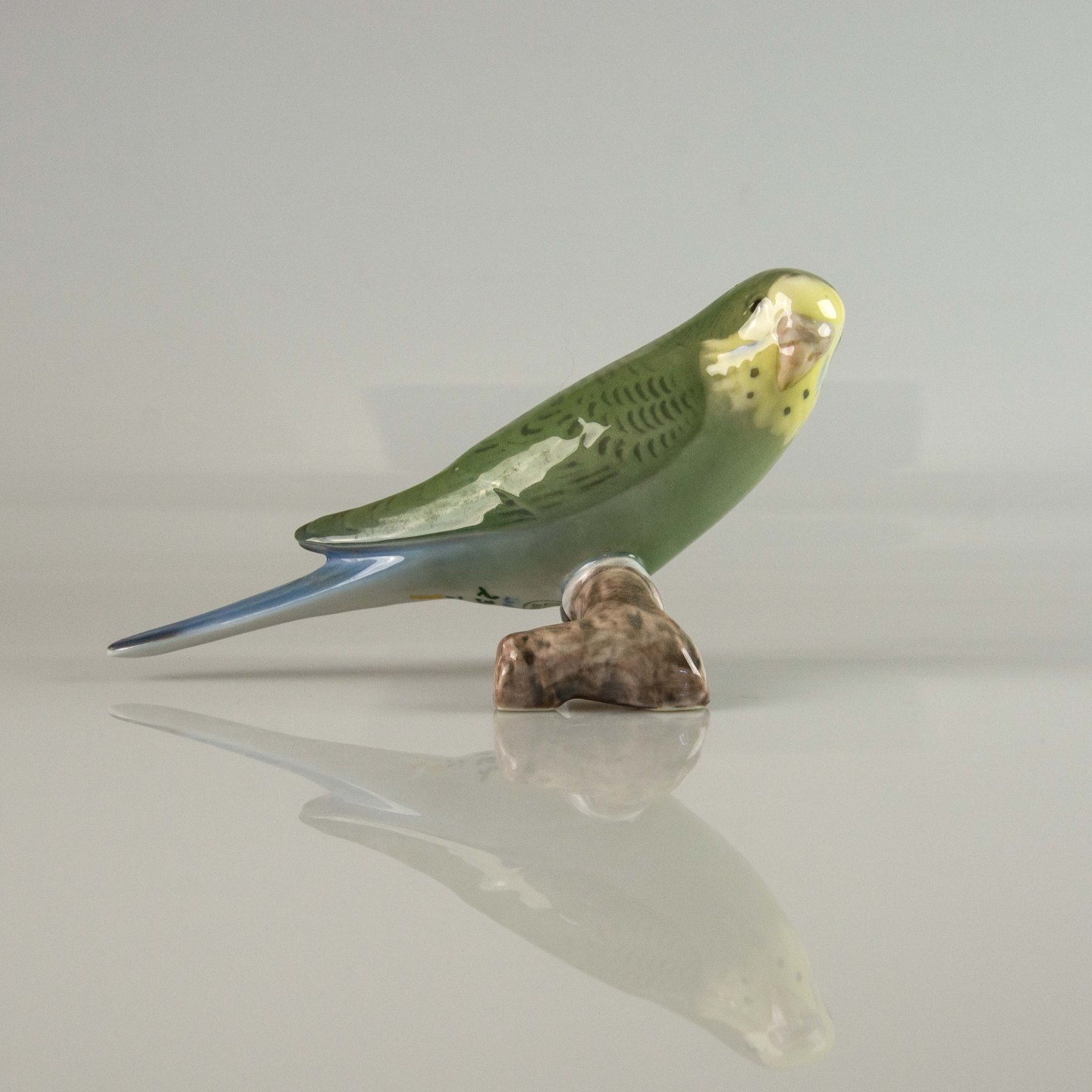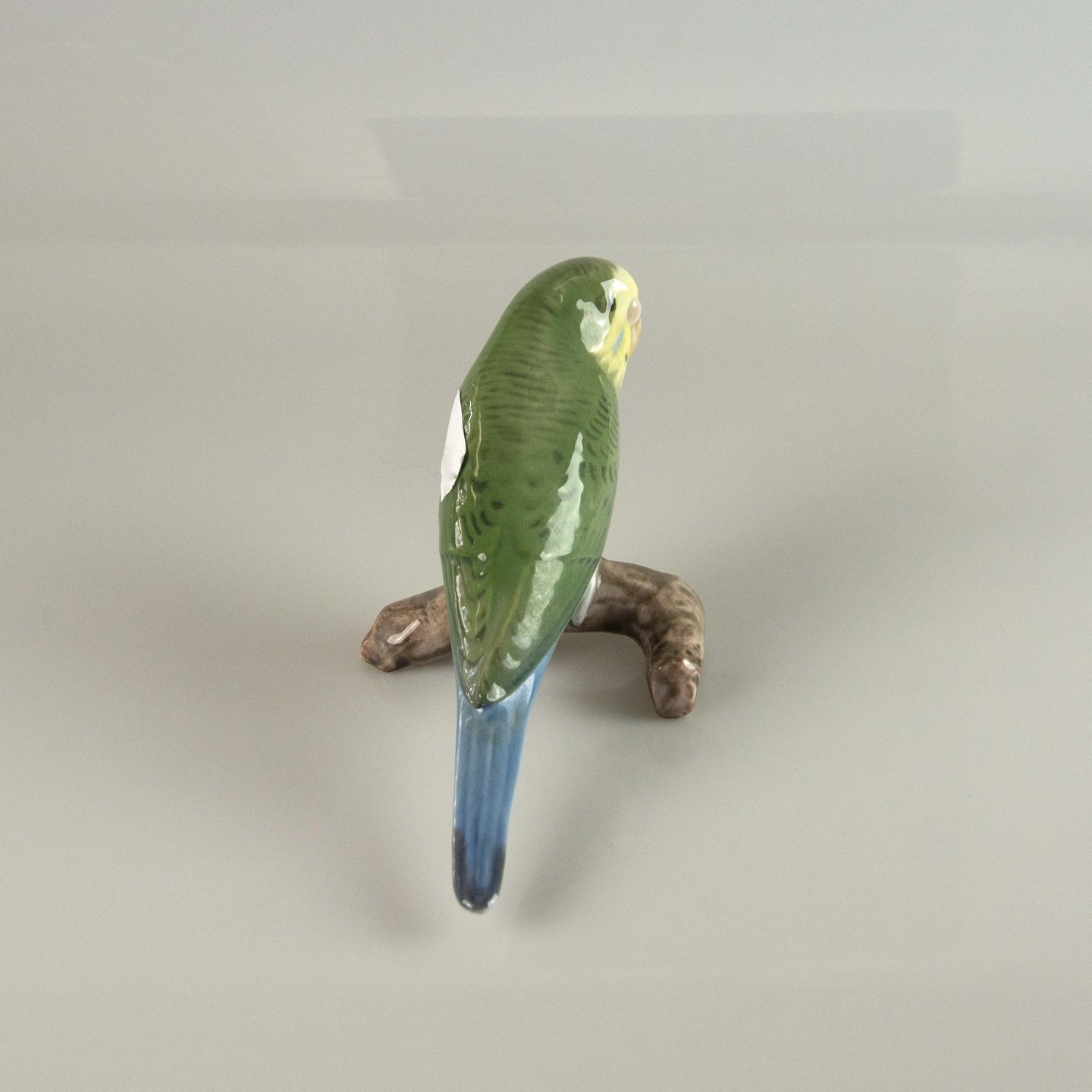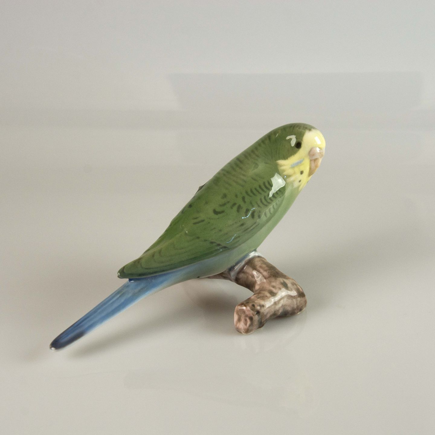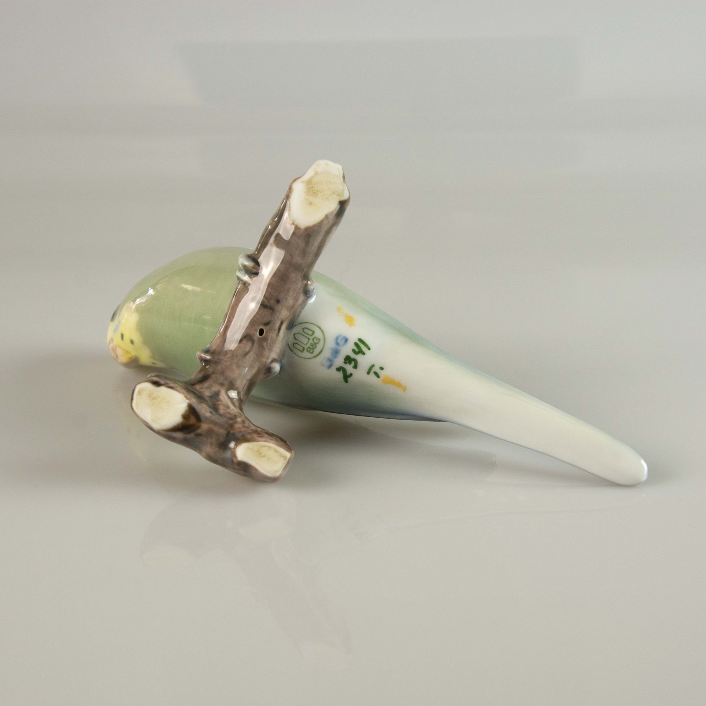 Figur i porcelæn med motiv af grøn undulat på gren nr. 2341