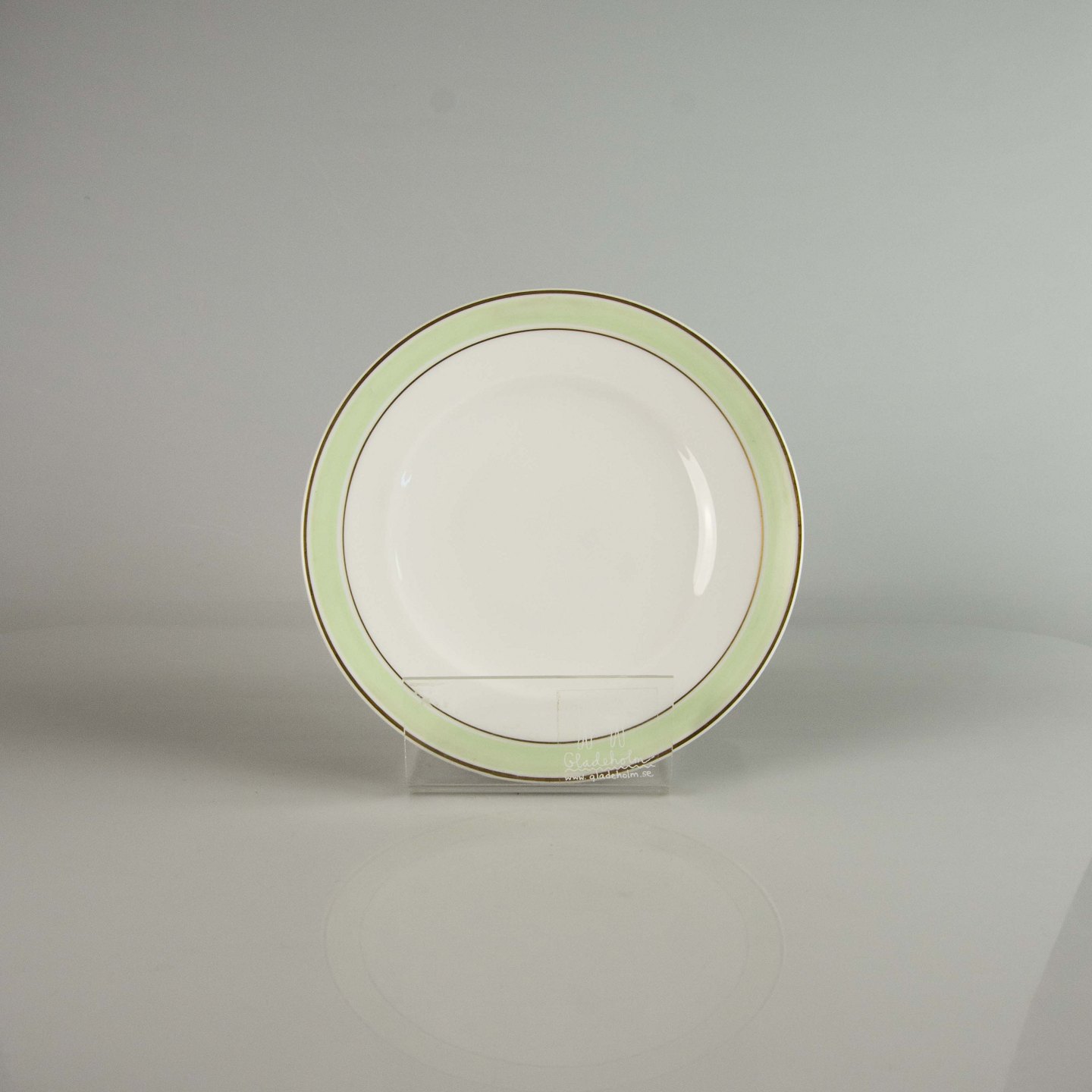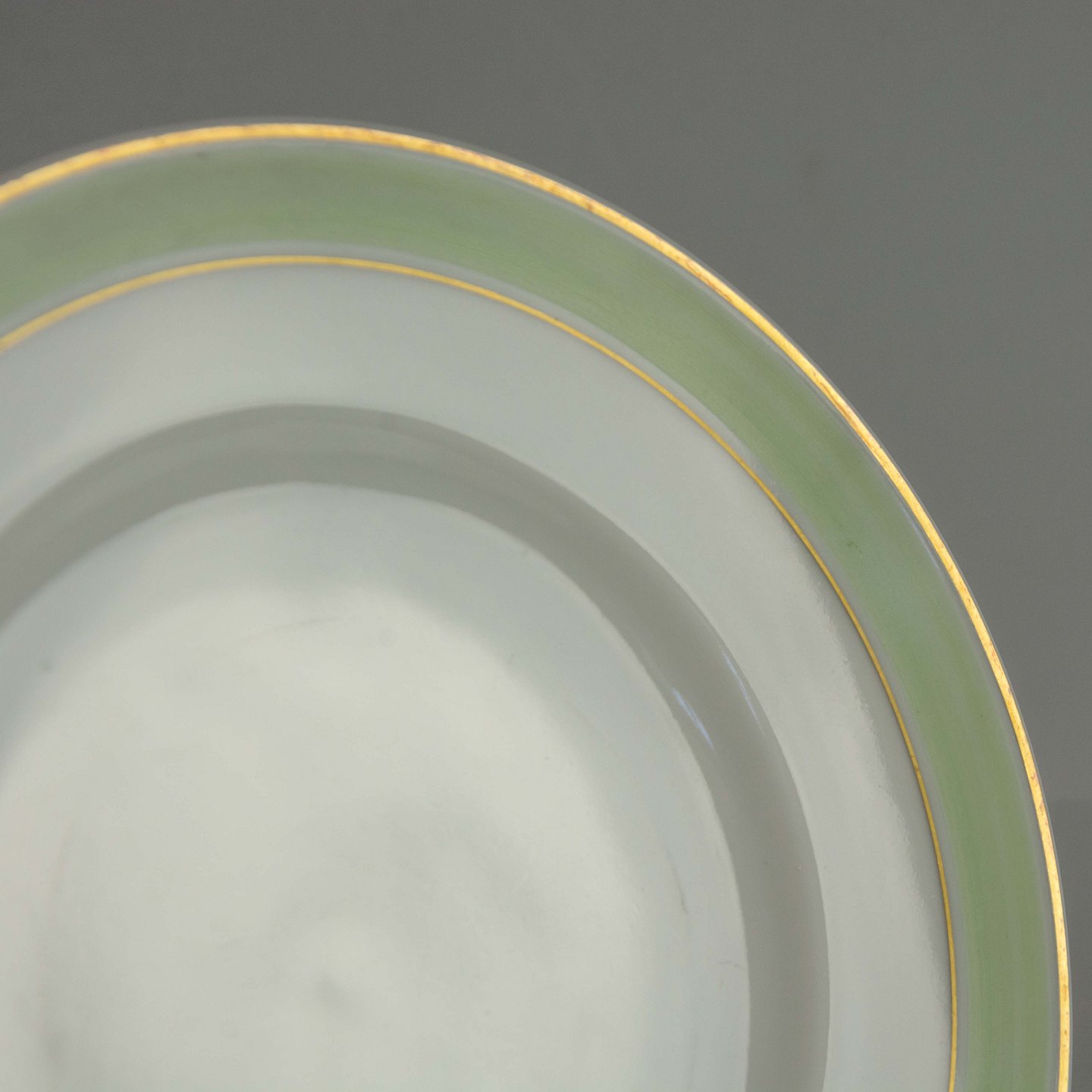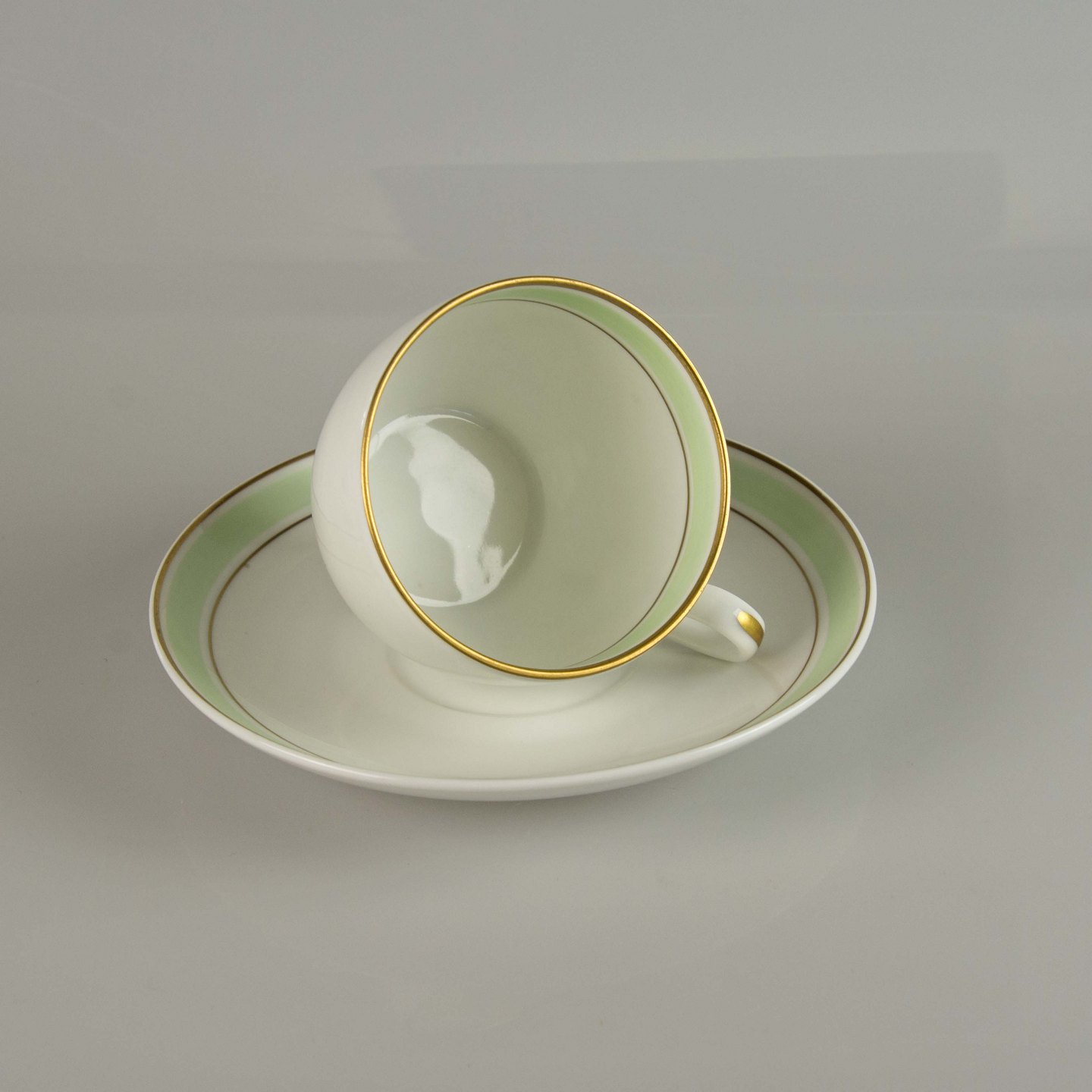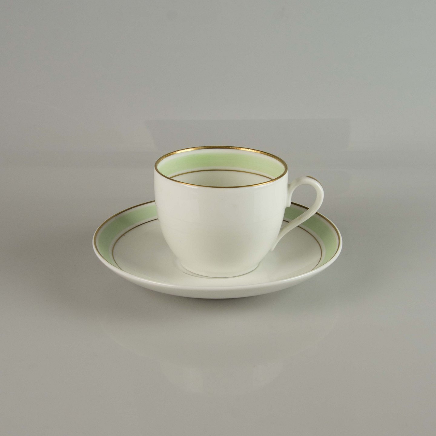 Sæt i hvidt porcelæn med lysegrøn bord og guldkant.