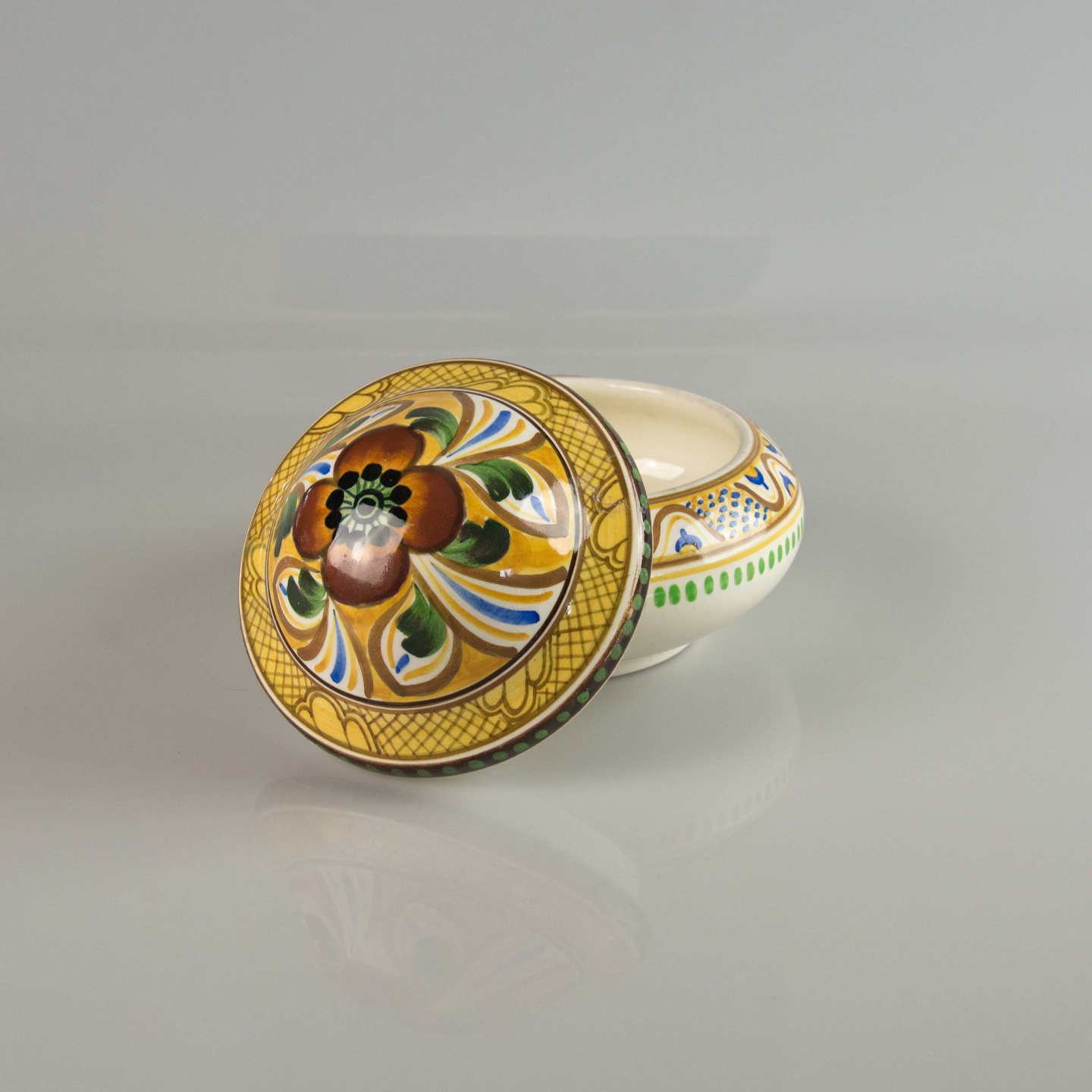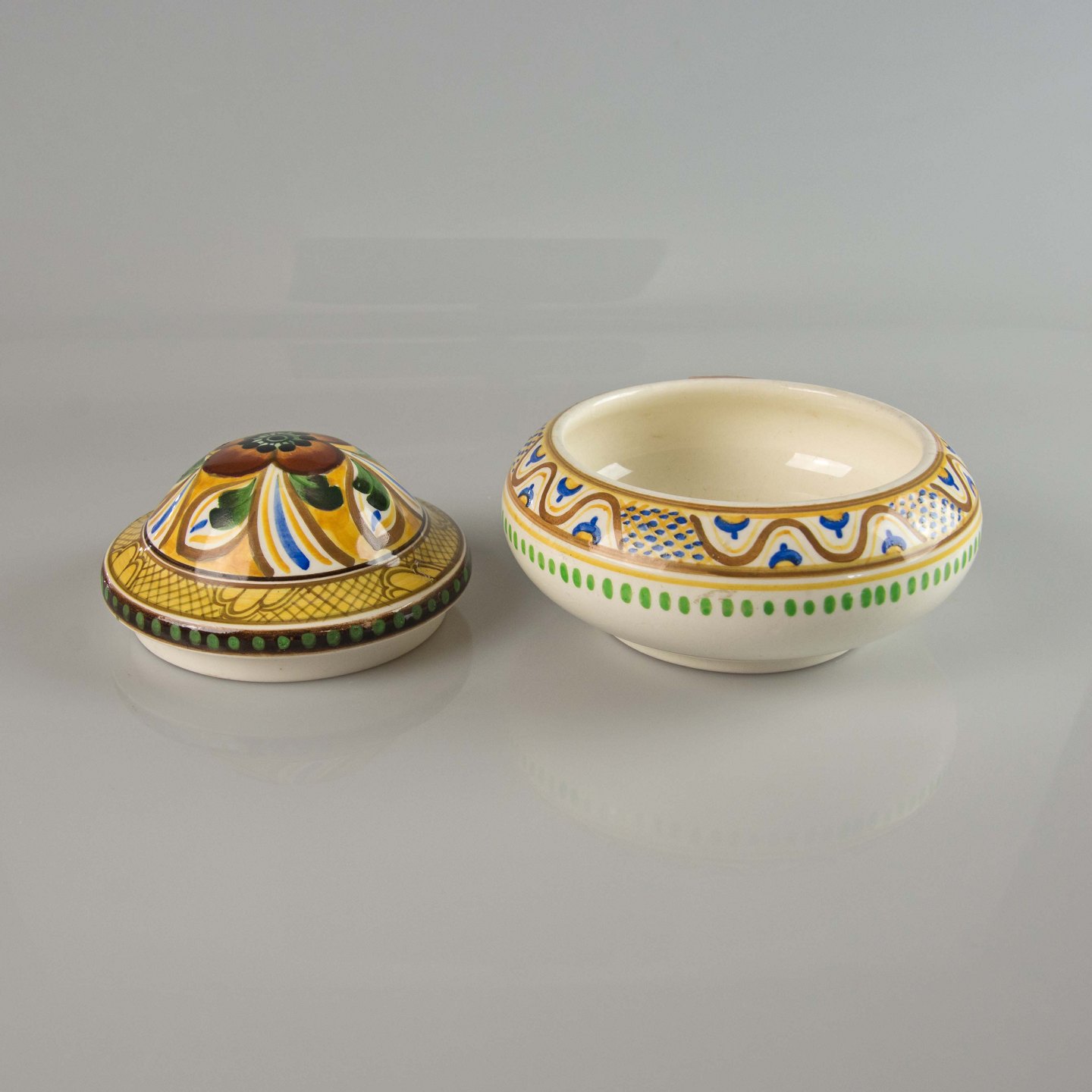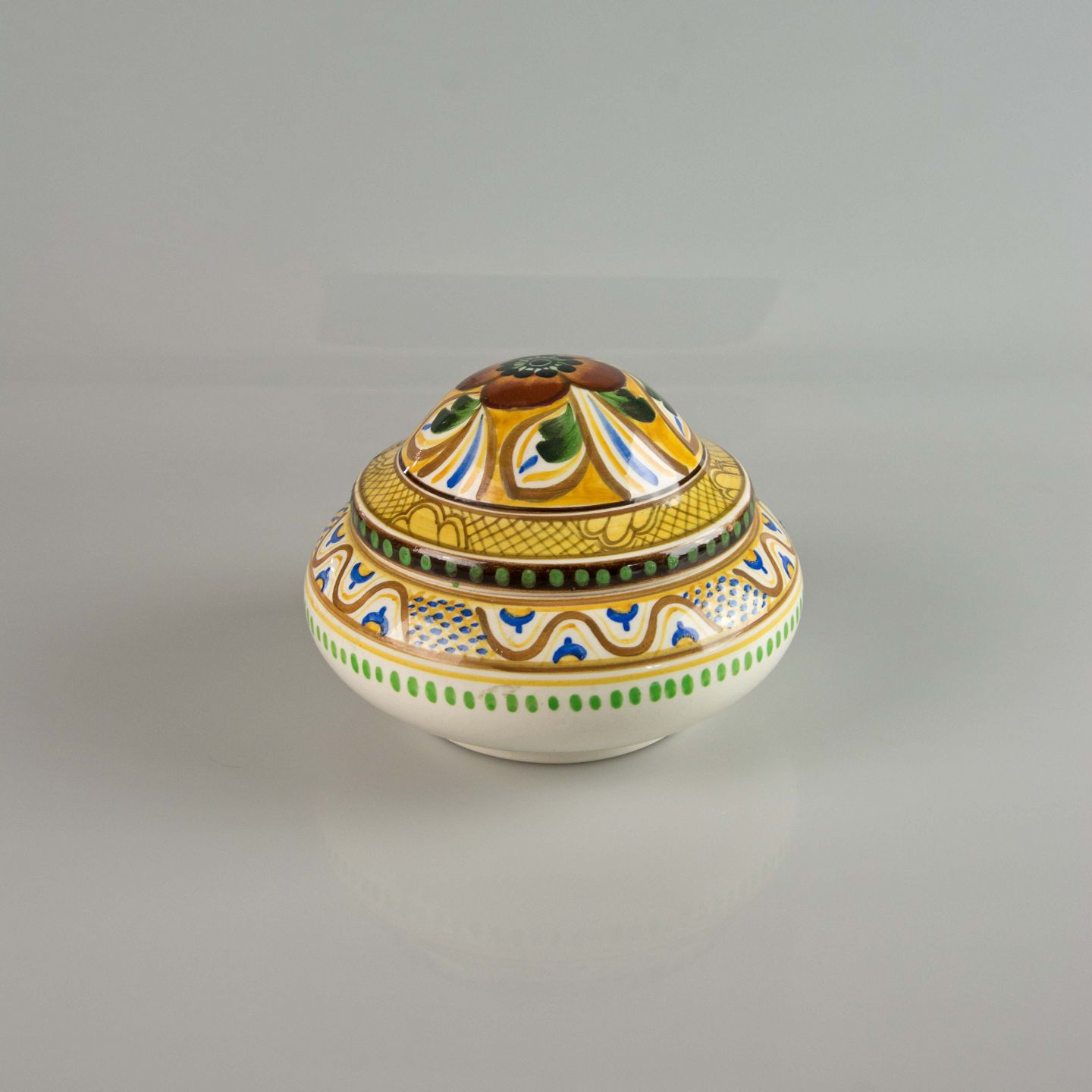 Krukke med låg i fajance med flerfarvet mønster og rødlig anemone nr. 1118/892