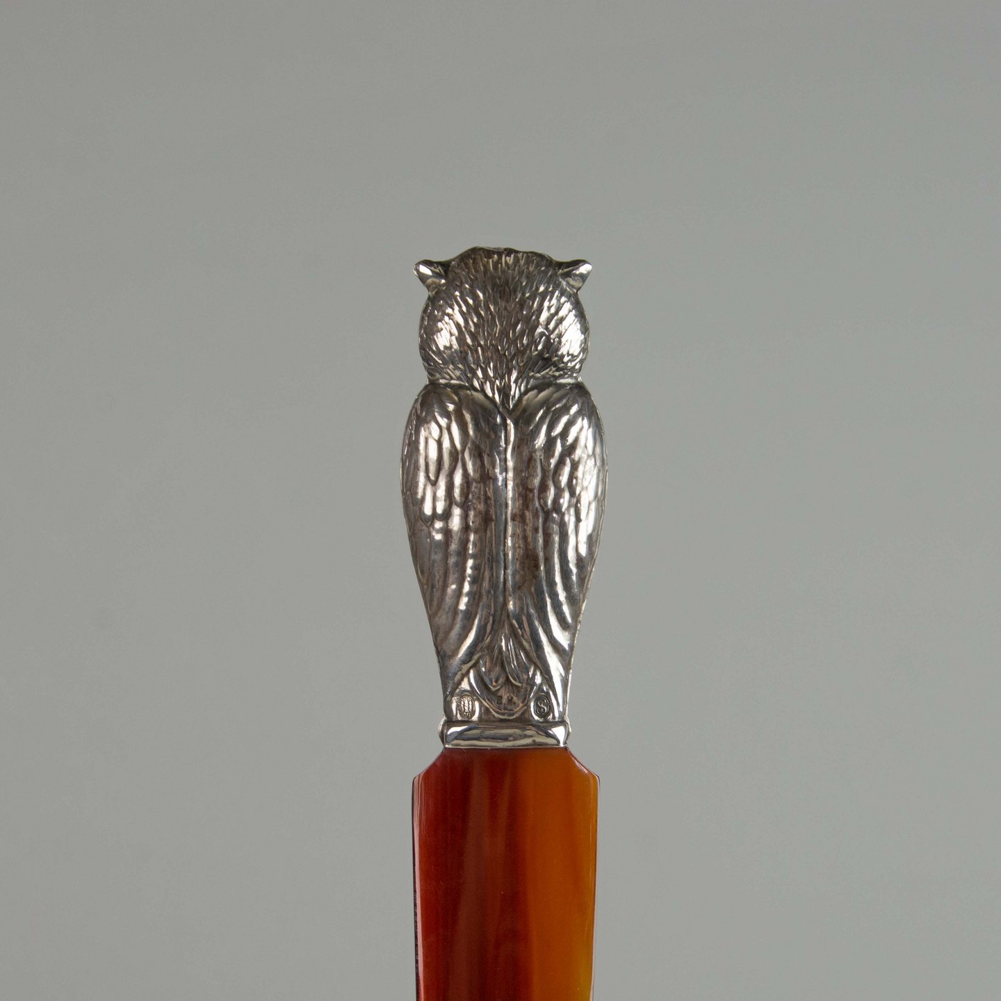 Brevåbner i tretårnet sølv med motiv af ugle monteret på ravfarvet blad.