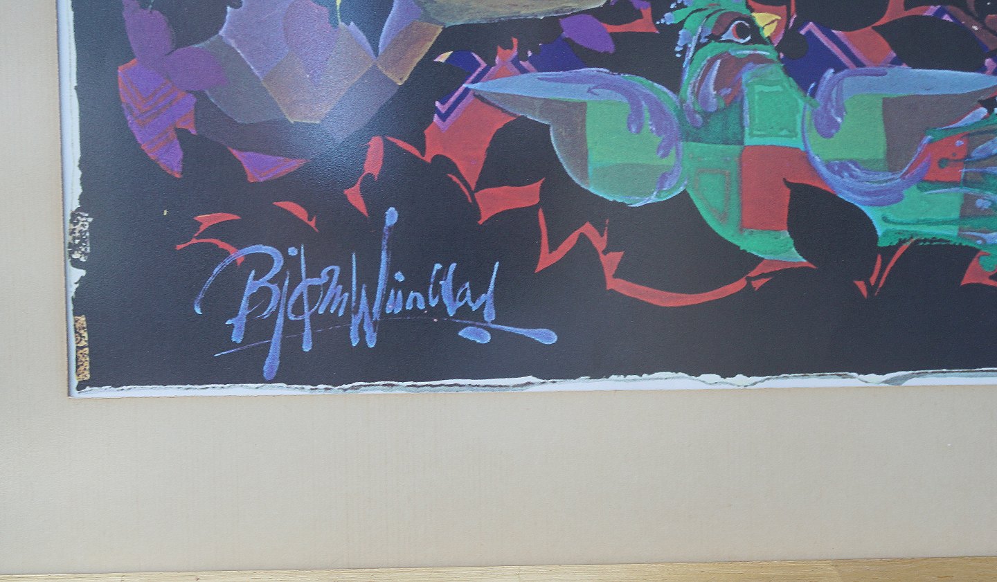 Tryk af Dame med fugl i hånden. Tryk af Bjørn Wiinblad