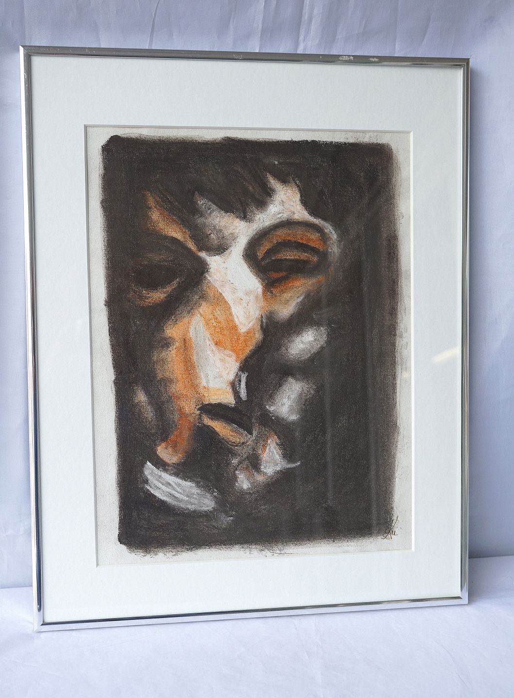 Indrammet litografi i aluminiumsramme med abstrakt motiv af et orange ansigt, der kommer ud af mørket
