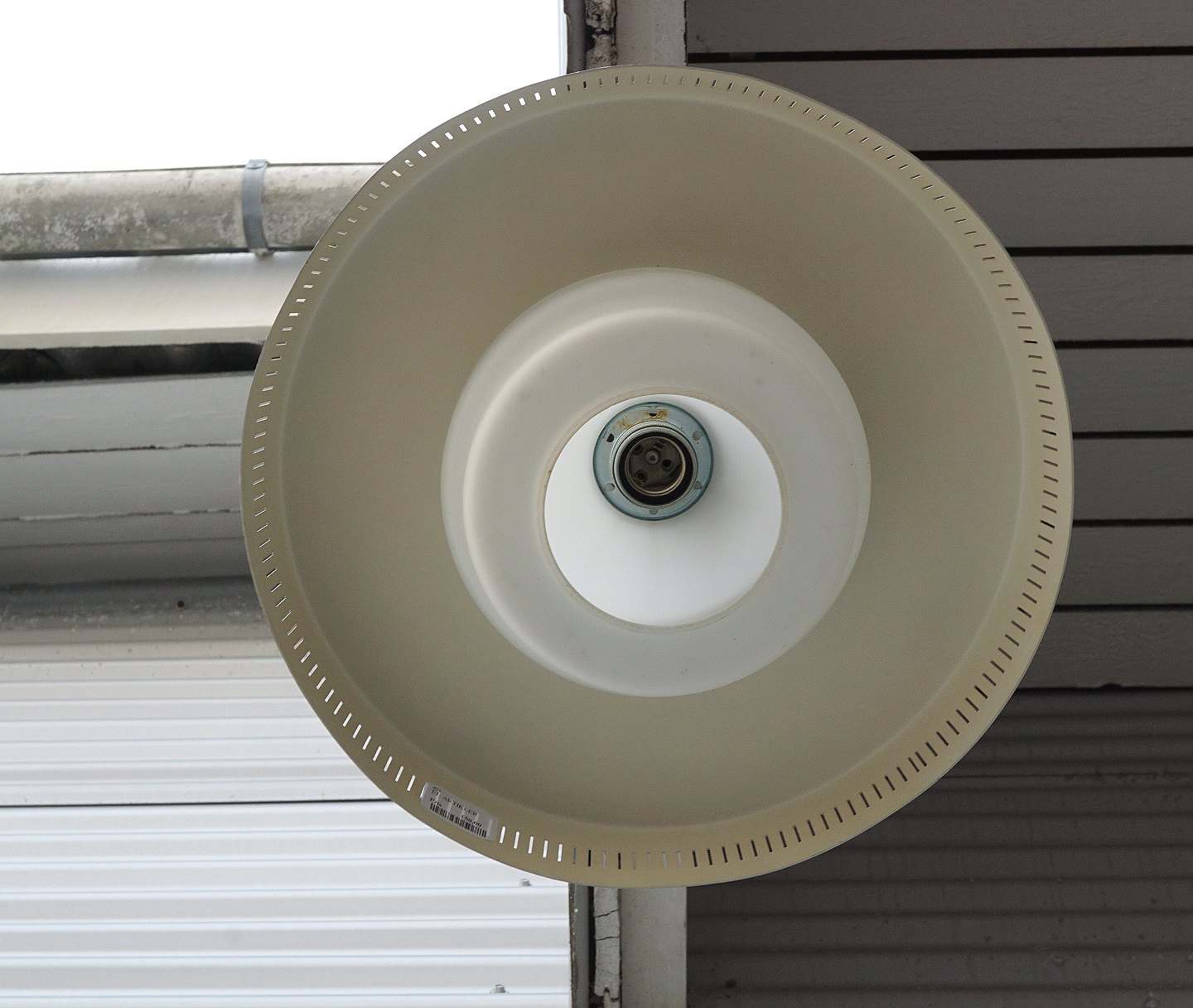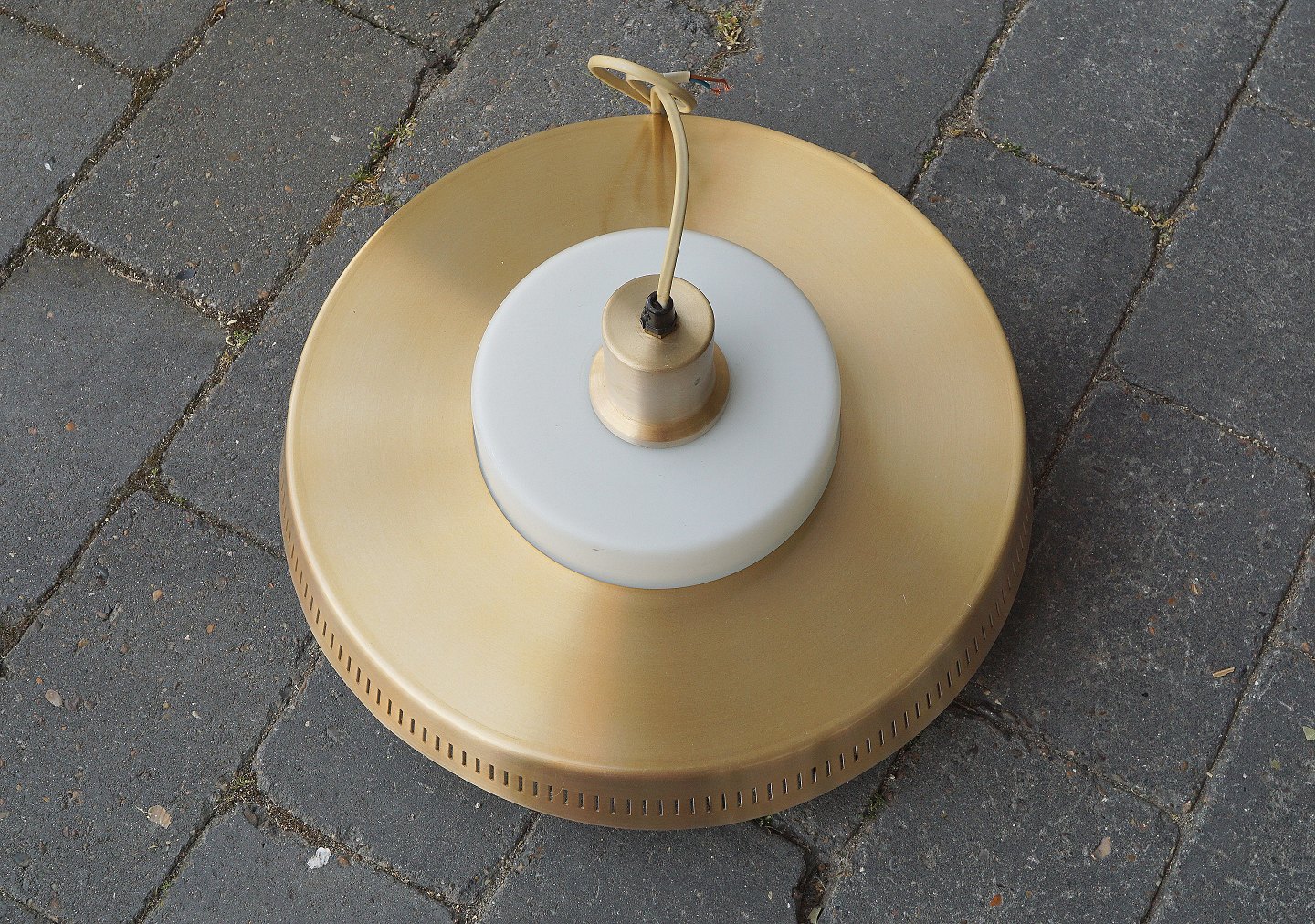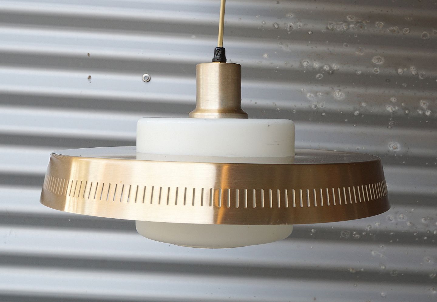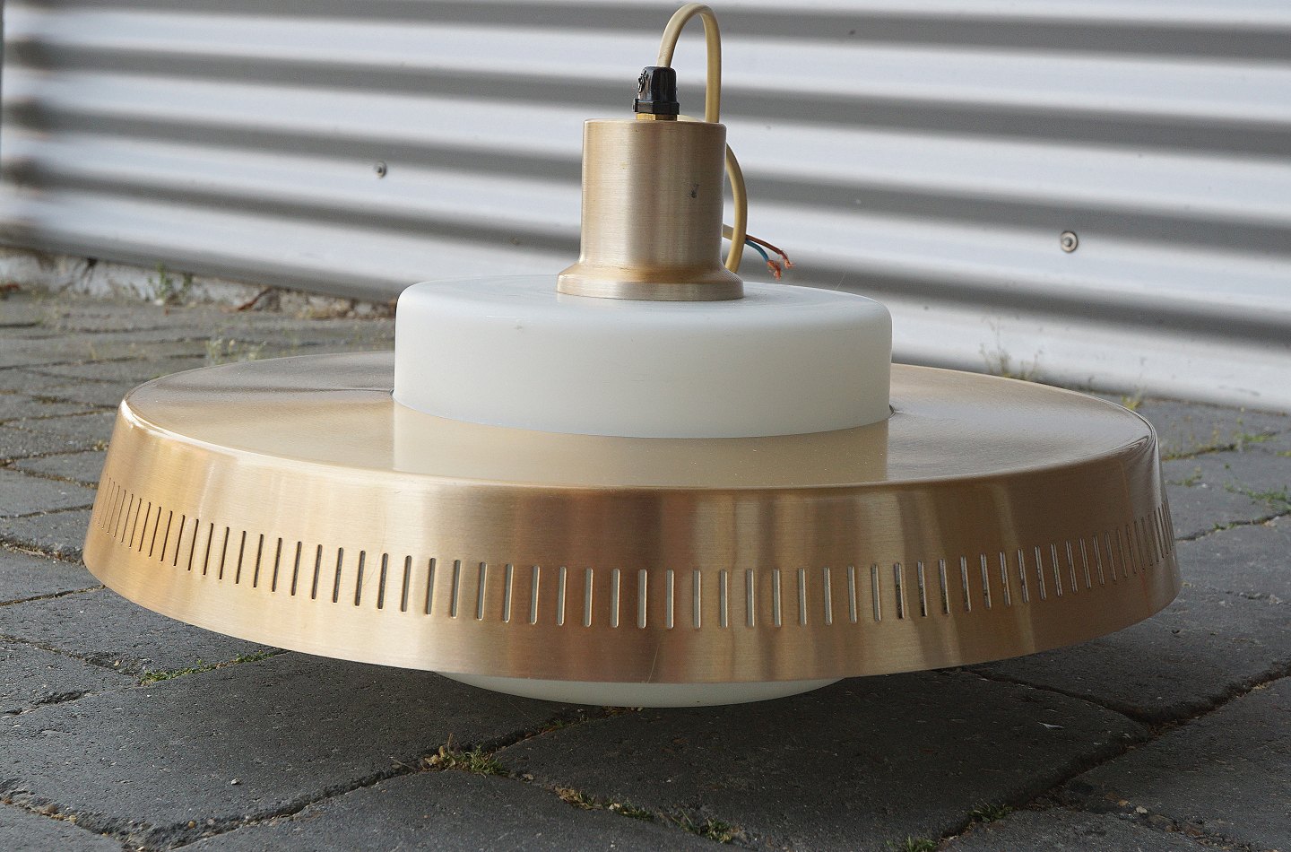 Lampe i opal hvid glas med en skærm og top af kobber