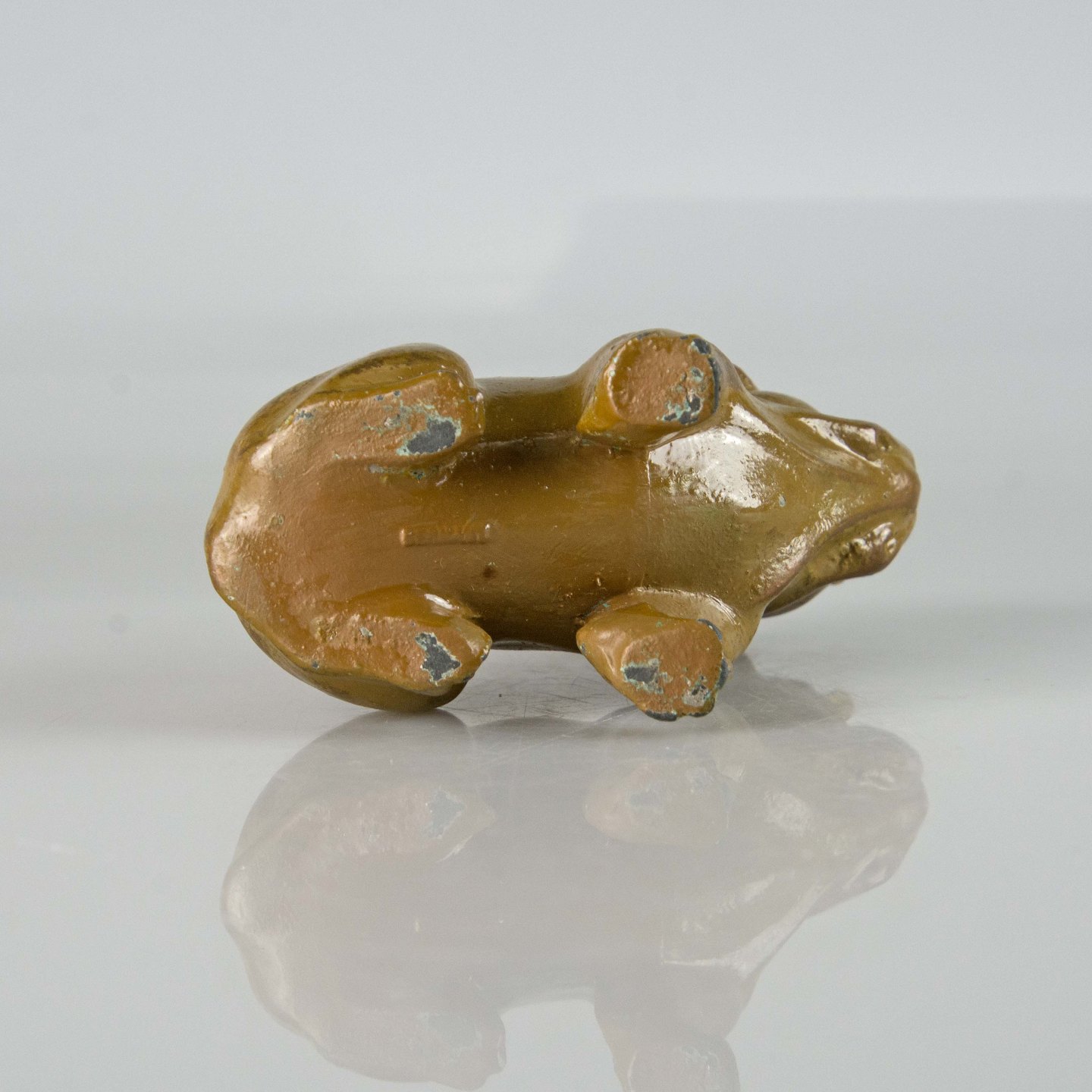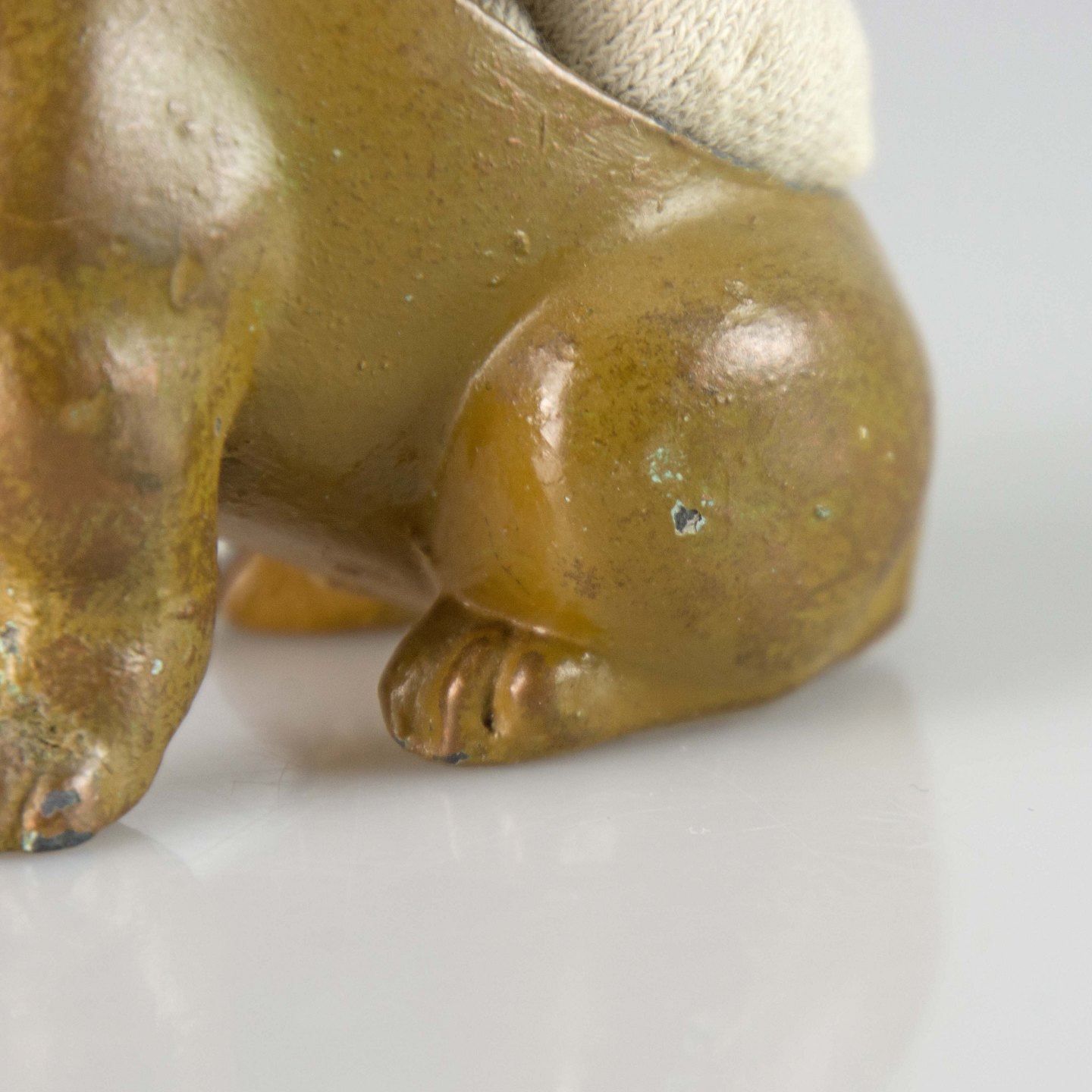 Gammel nålepude i malet metal med motiv af en siddende engelsk bulldog
