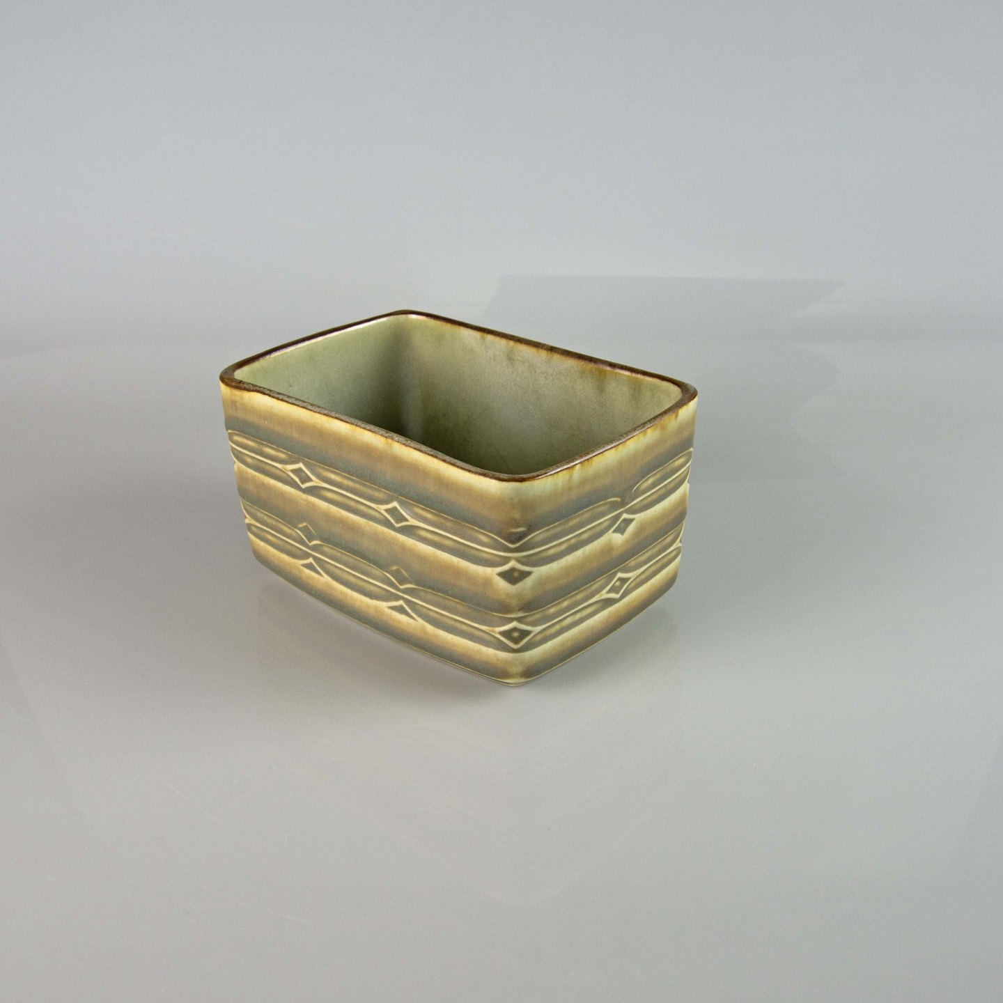 Lågkrukke i grøn stentøj med abstrakt motiv.