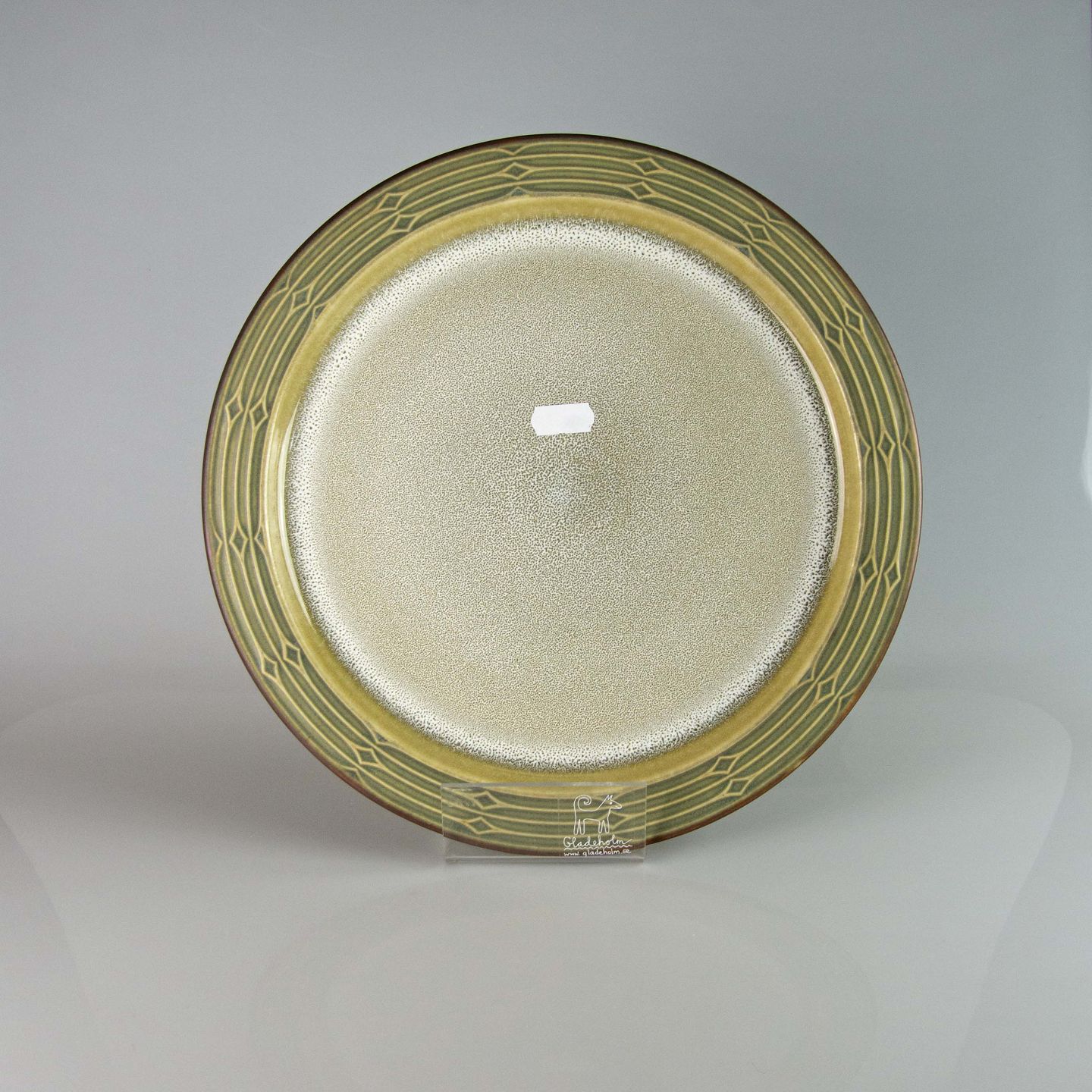 Fad i grøn stentøj med abstrakt motiv.