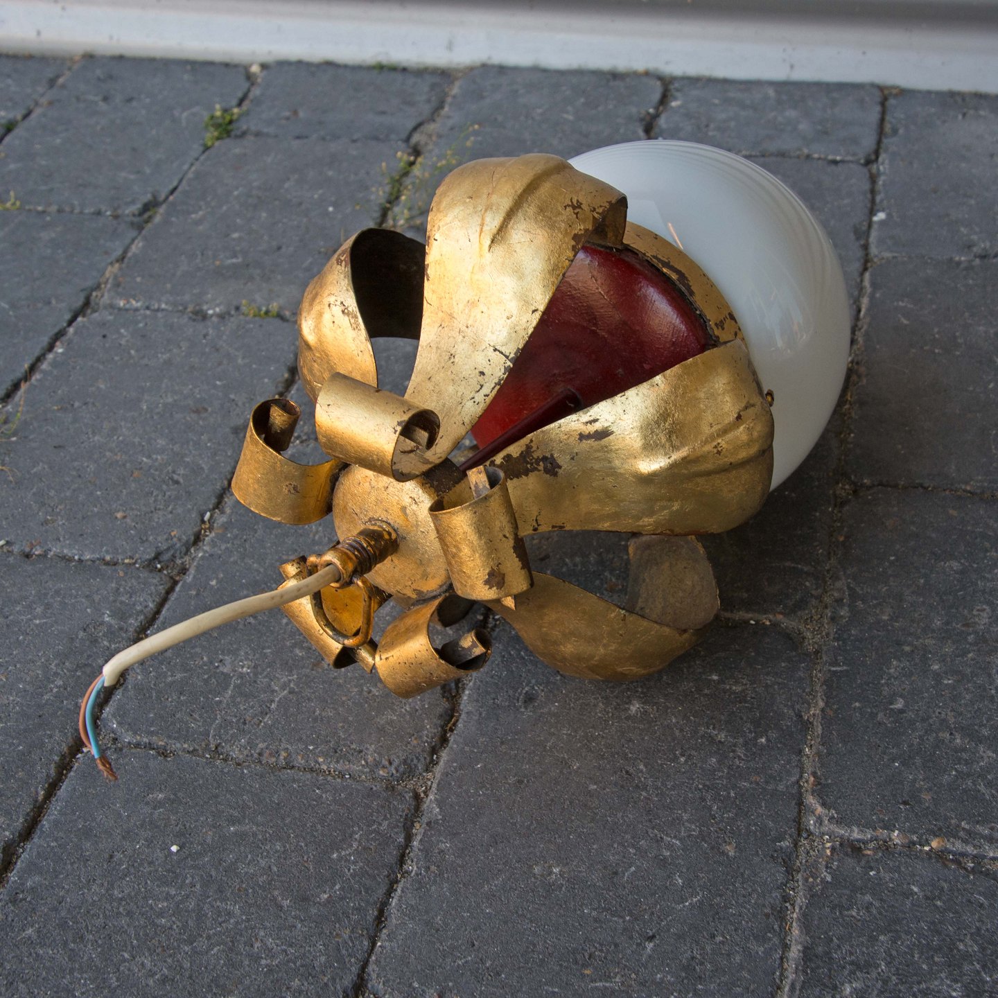 Lampen er i metal belagt med gylden og rød maling samt hvid glasskærm.