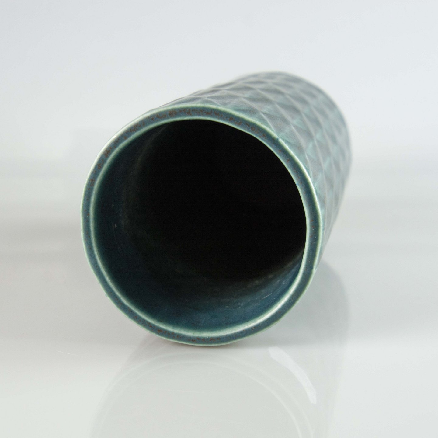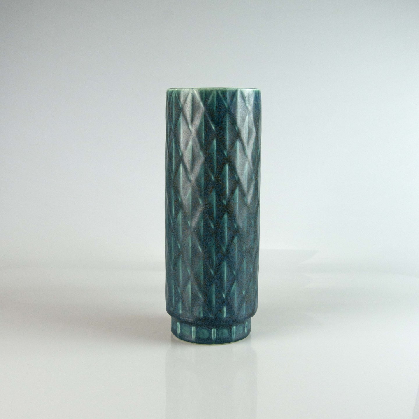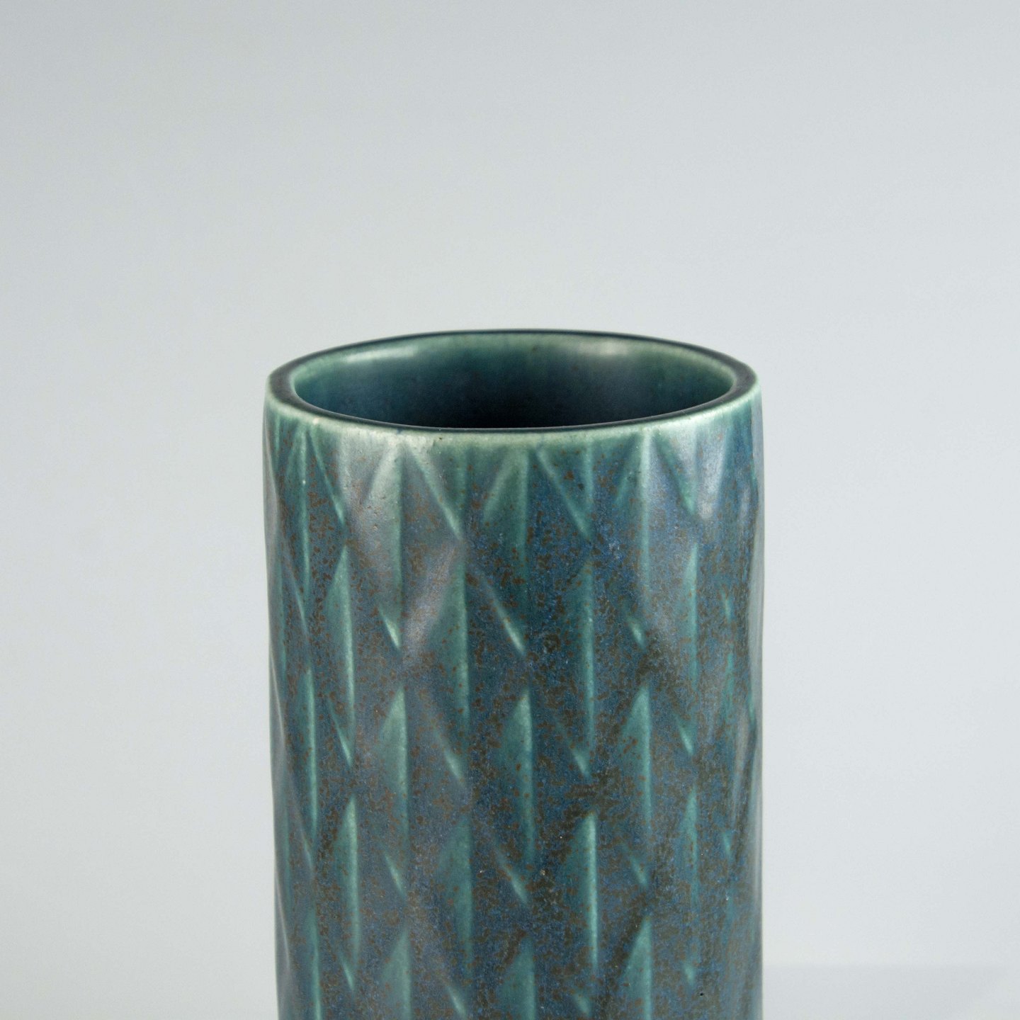 Cylinderformet vase i blågrøn stentøj med abstrakt mønster