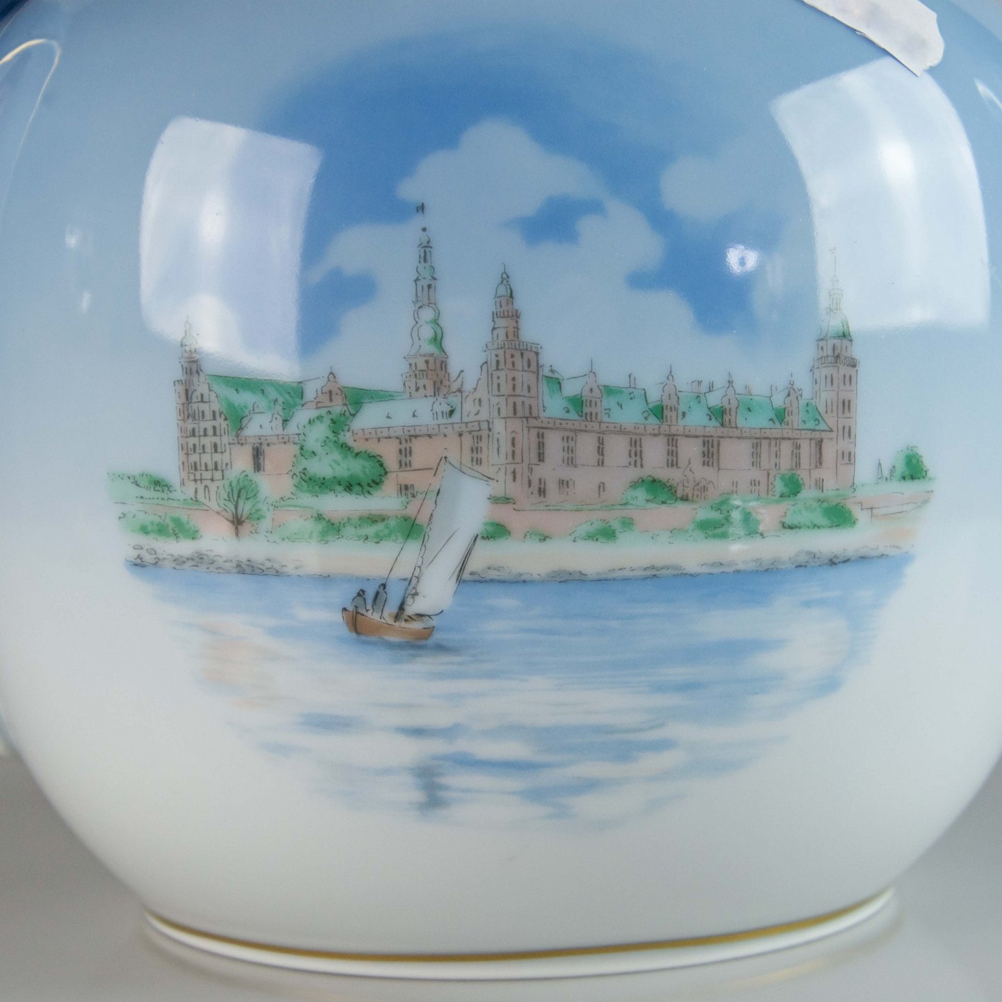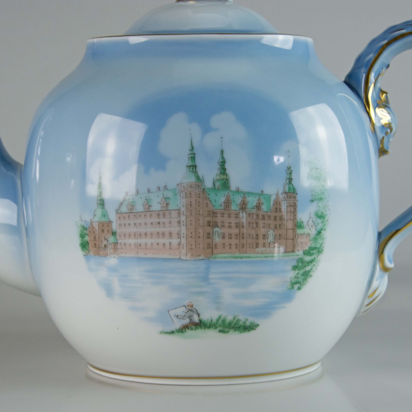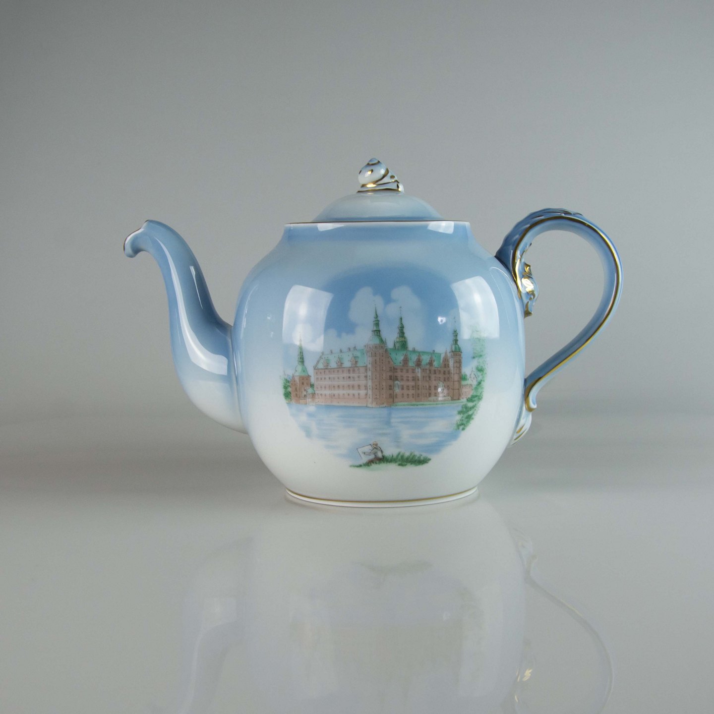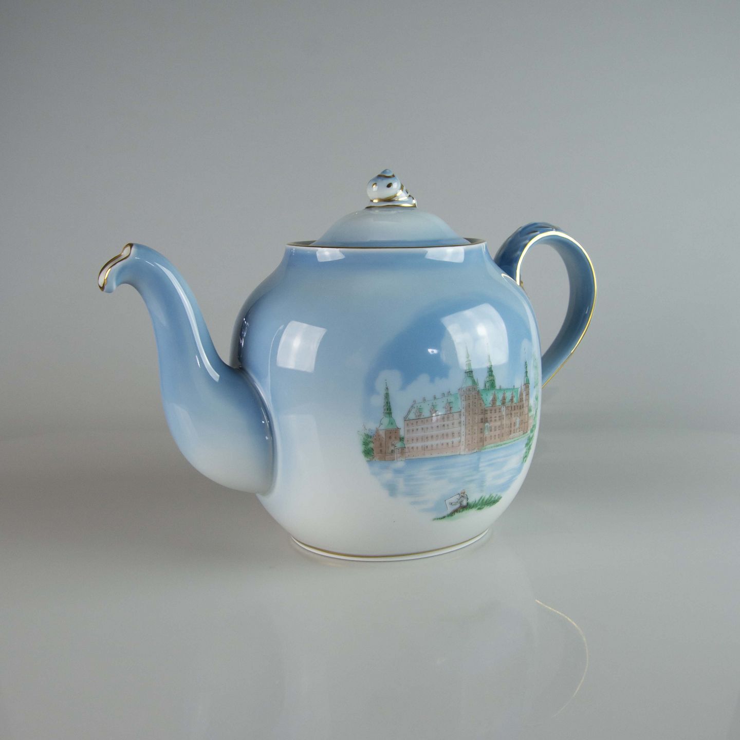 Tekande i porcelæn fra Danmarksstellet med guldkant og motiv af Kronborg nr. 656/3562